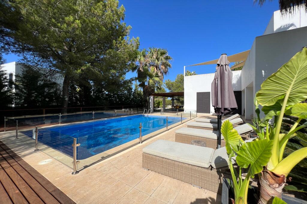 Auf der Dachterrasse überblicken zwei umlaufende Sofas, Couchtische und polierte Böden den einladenden Swimmingpool. Exotische Palmen und alte Bäume beschatten auch eine üppig ausgestattete Sonnenterrasse. Neben dem atemberaubenden Blick auf die Hügel und die grüne Landschaft bietet diese obere Etage auch einen Blick auf die legendären Sonnenuntergänge im Westen Ibizas.