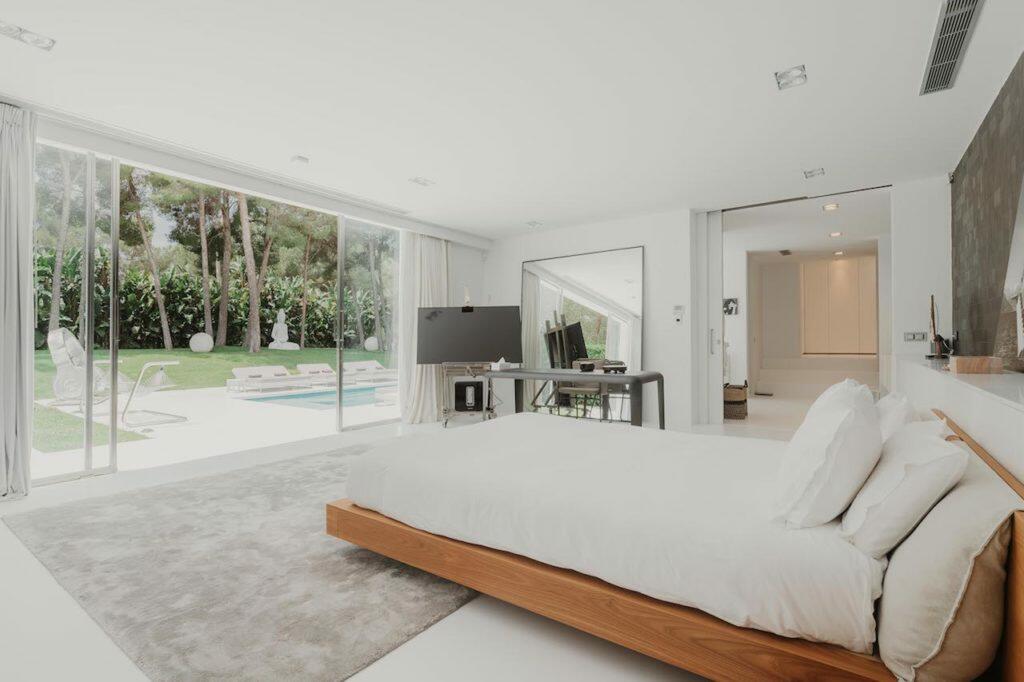 Bei Ihrer Ankunft werden Sie sich sofort sicher fühlen, dass Sie ein exklusives Haus auf Ibiza betreten haben, in dem jedes einzelne Detail sorgfältig nach den Standards einer 5-Sterne-Unterkunft gestaltet wurde. Diese komplett renovierte Villa kombiniert eine moderne Inneneinrichtung mit einer nüchternen Mischung aus ethnischen Elementen. Die Wohnräume sind hell und geräumig und mit klaren, organischen und neutralen Farben gestaltet. Trotz des minimalistischen Stils und der minimalistischen Einrichtung ist dieses elegante Haus auf Ibiza mit luxuriösem und hochwertigem Mobiliar ausgestattet.
