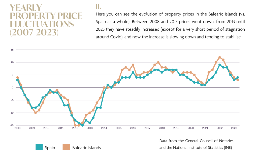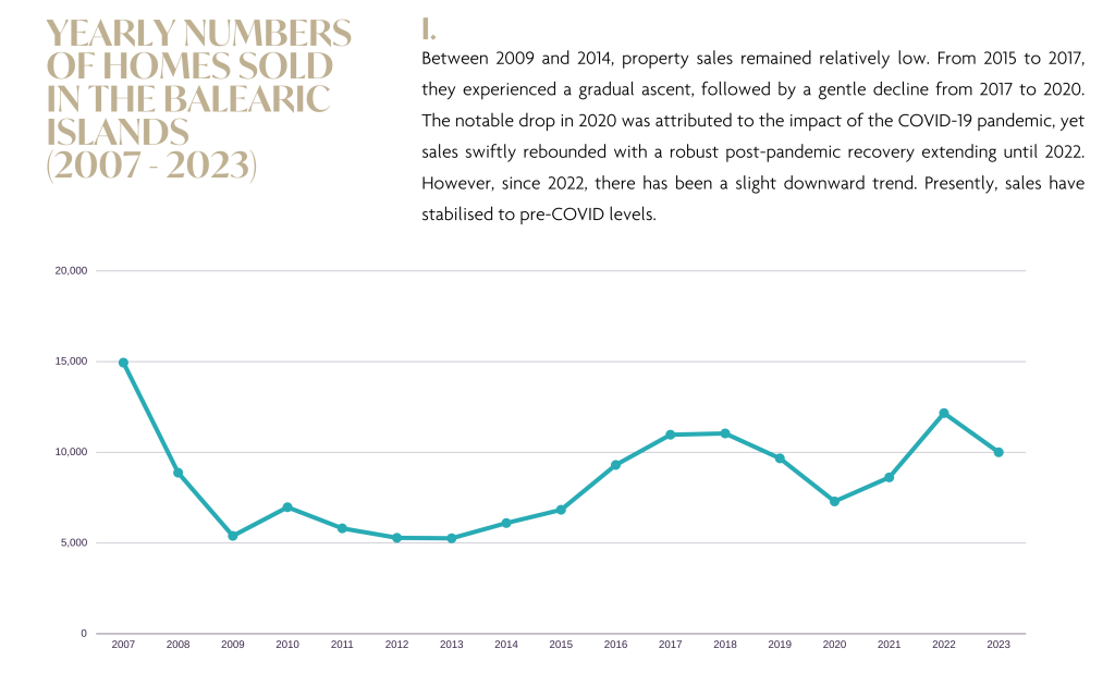 Die Balearen haben im Laufe der Zeit eine beeindruckende Widerstandsfähigkeit bewiesen, wie die folgende Grafik zeigt. Trotz leichter Rückgänge bei den Kauf-/Verkaufszahlen und den Immobilienpreisen im Jahr 2023 bietet das konsistente Muster des Wiederaufschwungs nach jeder Krise eine beruhigende Perspektive für langfristige Investoren. Dieser Trend unterstreicht den Ruf der Balearen als sicheres und dauerhaftes Investitionsziel, da der Markt in den letzten zehn Jahren immer wieder das Vorkrisenniveau übertraf.