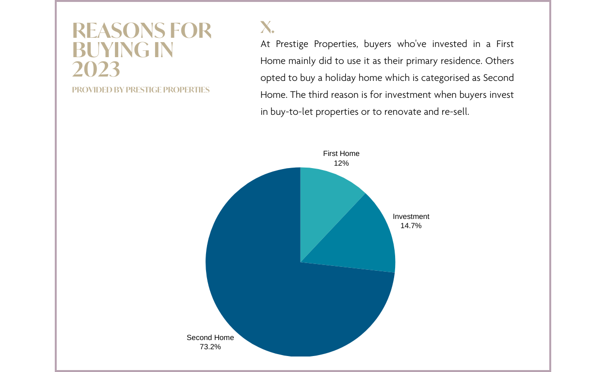 Ibiza hat sich stets als außergewöhnliches Investitionsziel erwiesen und in den letzten Jahren das Interesse zahlreicher internationaler Investoren auf sich gezogen. Die vorherrschende Wahl unter diesen Investoren war der Erwerb von Zweitwohnungen, entweder für einen erholsamen Urlaub oder als Zuflucht vor den kalten Wintern im Norden. Im Jahr 2023 setzte sich dieser Trend fort, wobei sich eine überwältigende Mehrheit – fast 75 % – unserer Kunden für Immobilien entschied, die als Zweitwohnsitz (Urlaubsdomizil) vorgesehen waren.