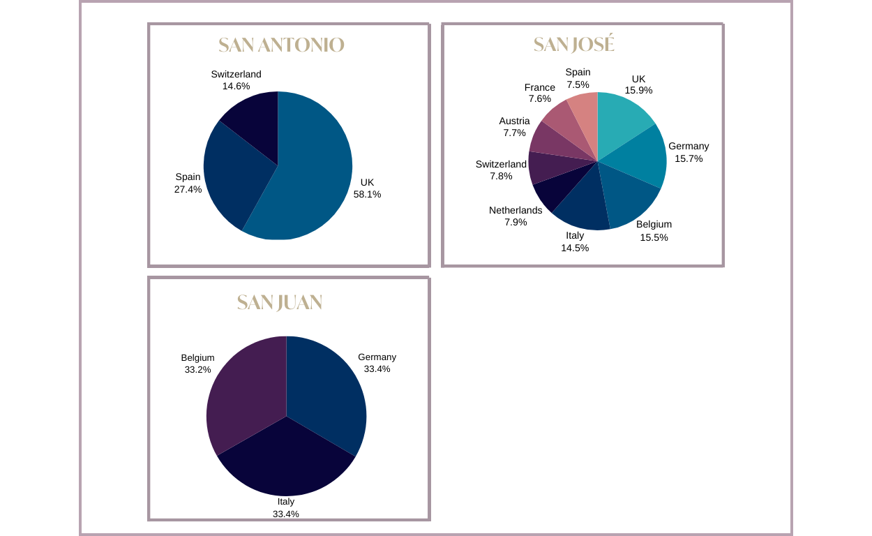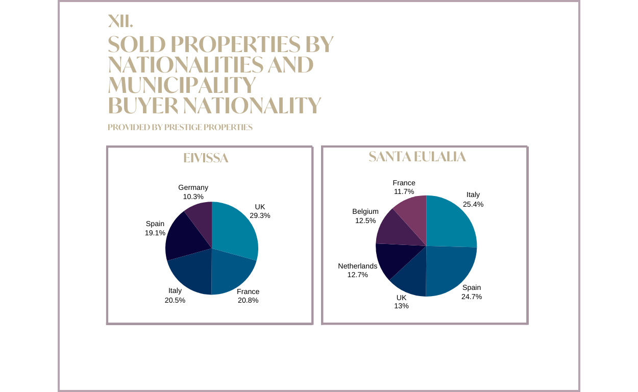Im Jahr 2023 ist San José mit einem Anteil von 41,62 % der Gesamtumsätze der Spitzenreiter in Sachen Umsatz. Dieses Gebiet ist zu einem Magneten für Menschen verschiedener Nationalitäten geworden. Bei Prestige haben wir festgestellt, dass dies der begehrteste Standort auf der Insel ist, der besonders das Interesse von Investoren auf sich zieht. Die Popularität von San Antonio hat im Laufe der Jahre stetig zugenommen. Ähnlich wie im Jahr 2022 kamen auch 2023 die meisten Käufer aus dem Vereinigten Königreich. San Antonio ist zu einem beliebten Reiseziel für britische Staatsangehörige geworden, insbesondere für diejenigen, die ihren Sommerurlaub auf Ibiza verbringen.