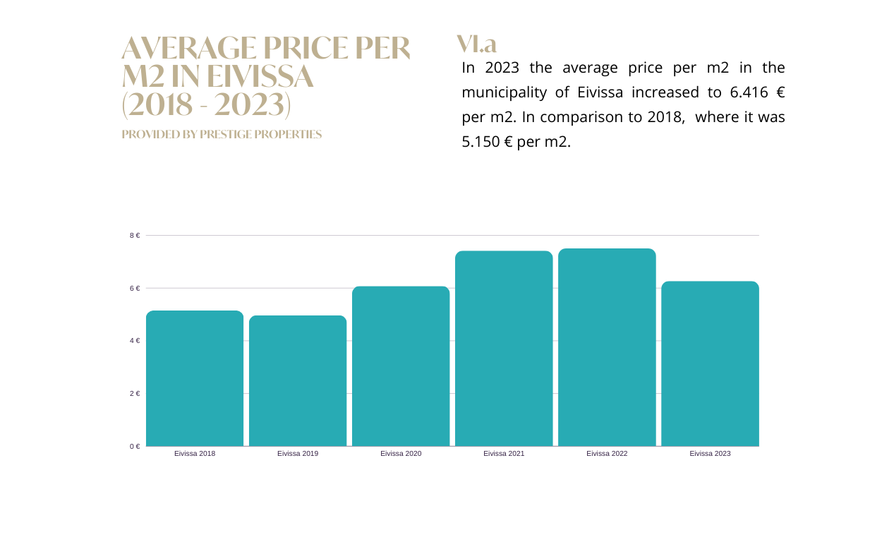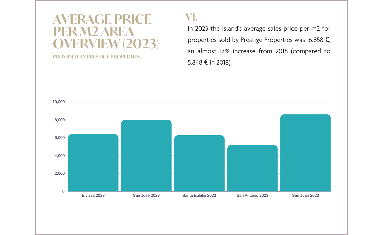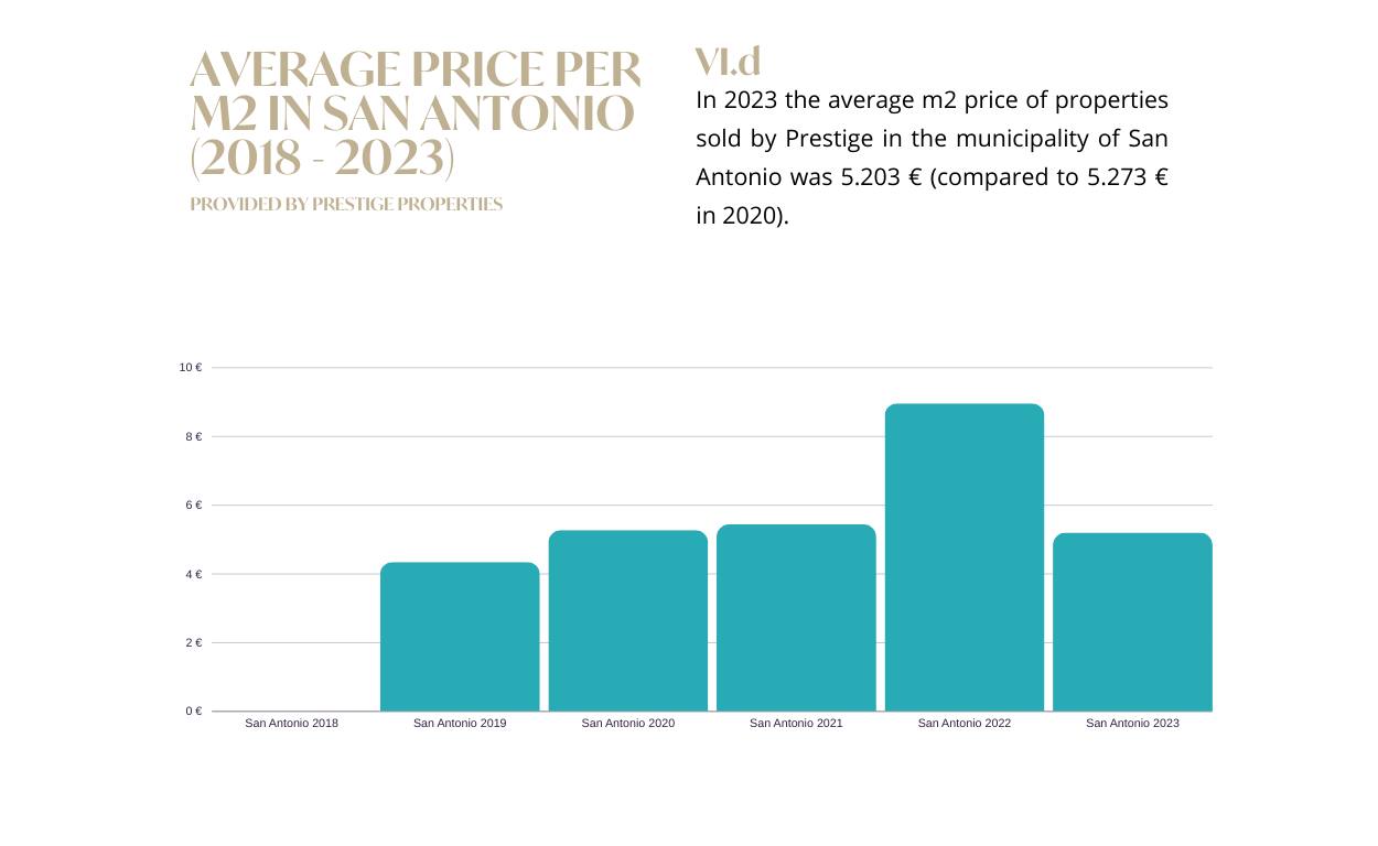 Selbst bei einem Rückgang im Vergleich zum Vorjahr können wir innerhalb von 5 Jahren (2018-2023) immer noch einen Gesamtanstieg von 17 % verzeichnen. Wir haben einen dramatischen Anstieg der Nachfrage in der Gemeinde San Antonio festgestellt, wo der Durchschnittspreis pro Quadratmeter in den letzten Jahren gestiegen ist, obwohl sie nach wie vor die erschwinglichste Gemeinde der Insel ist, mit vielen lohnenden Möglichkeiten für Käufer.