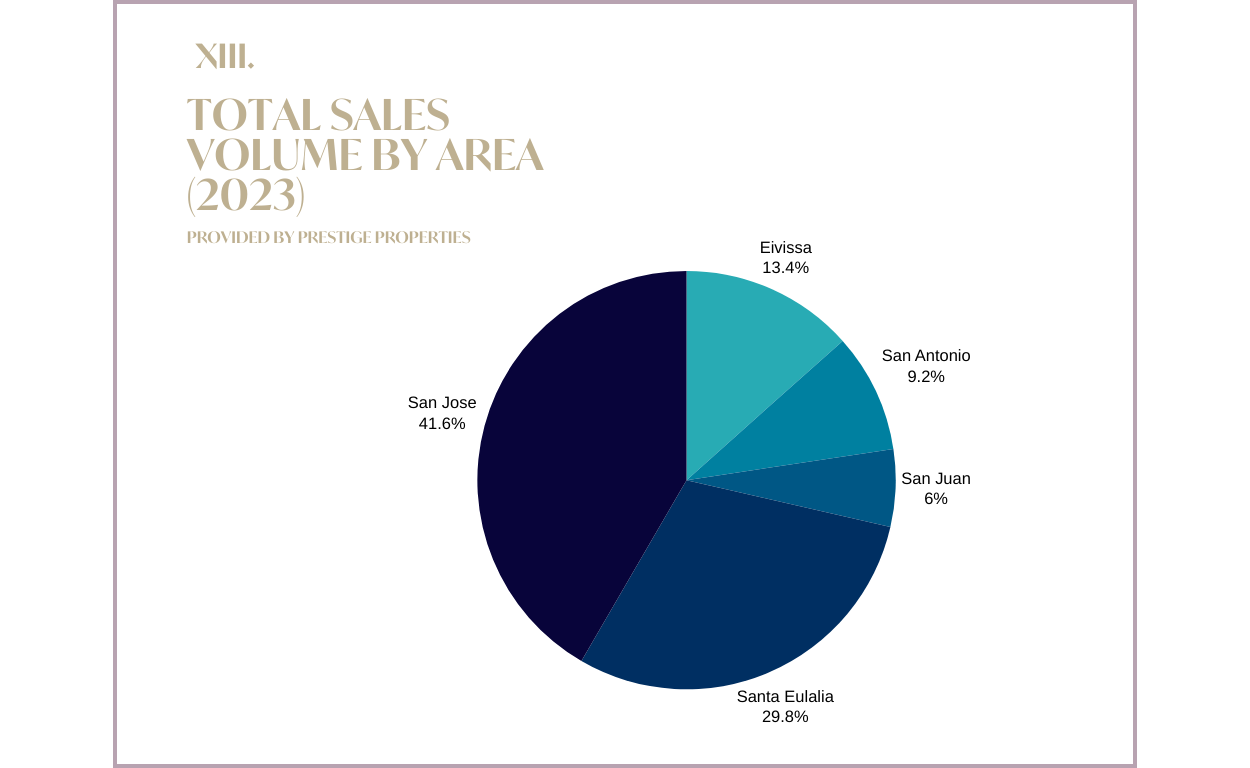 Gemessen am Verkaufsvolumen ist die umsatzstärkste Gemeinde im Jahr 2023 San José, gefolgt von Santa Eulalia und Eivissa (Ibiza-Stadt). Betrachtet man die tatsächliche Anzahl der verkauften Immobilien in den einzelnen Gemeinden, so ergibt sich folgende Reihenfolge: San José (31 %), Ibiza-Stadt (24 %), Santa Eulalia (19 %), San Antonio (17 %) und San Juan (8 %).