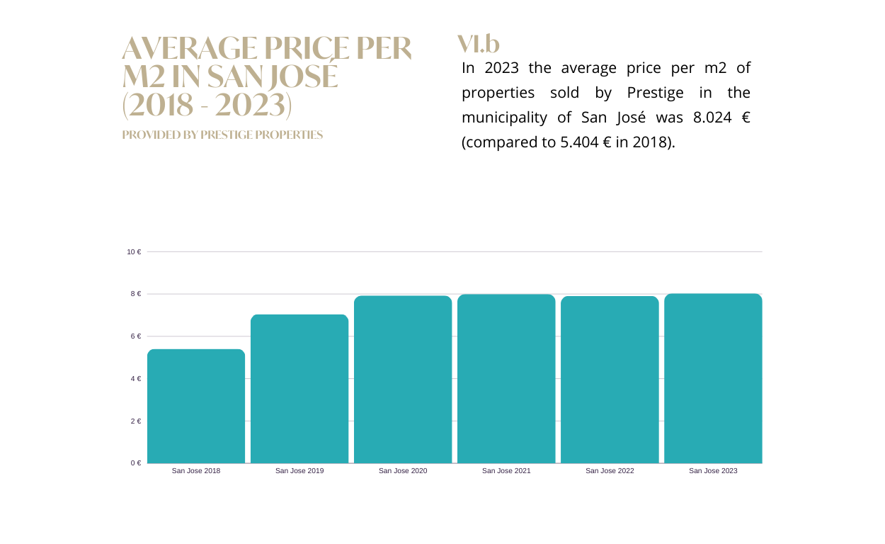 Wie in den vergangenen Jahren ist San José die Gemeinde mit dem größten Interesse und Verkaufsvolumen, die bei wohlhabenden Luxus-Zweitwohnungskäufern sehr gefragt ist. Es handelt sich um eine der wenigen Gemeinden, in denen der durchschnittliche Quadratmeterpreis weiterhin steigt, sogar leicht höher als im Jahr 2022, mit einem Durchschnitt von 8023,74 € pro Quadratmeter. Auf diesen Bereich entfallen 41,62 % des Verkaufsvolumens von Prestige Properties im Jahr 2023. Darüber hinaus weist es die größte Mischung an verkauften Immobilien auf der Insel auf. Die meisten davon sind Wohnungen, Häuser und moderne Villen.