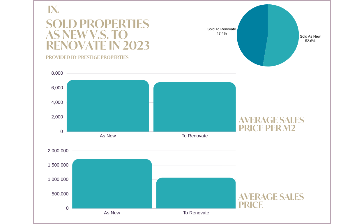 Im Jahr 2023 verkaufte Prestige Properties mehr neue Immobilien als solche, die zur Renovierung vorgesehen waren. Natürlich erzielen renovierte Immobilien in der Regel niedrigere durchschnittliche Verkaufspreise; der Unterschied pro Quadratmeter zwischen neuen und renovierten Immobilien ist jedoch gering.