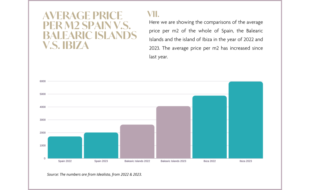 Wie aus dem obigen Schaubild ersichtlich ist, scheinen die Absatzzahlen der letzten fünf Jahre die allgemeine Entwicklung der Weltwirtschaft widerzuspiegeln: ein Rückgang in den Jahren vor der COVID, gefolgt von einem deutlichen Anstieg in den Jahren nach der COVID (2021 und 2022) und nun ein leichter Abschwung. Es bleibt abzuwarten, ob sich der Abschwung im Jahr 2023 stabilisiert, ob er zu einem anhaltenden Abwärtstrend führt oder ob es sich nur um eine kurzzeitige Delle handelt. Eine genaue Beobachtung des Marktes wird Klarheit über die weitere Entwicklung bringen, aber dennoch hat das vergangene Jahr im Vergleich zu 2018 einen Anstieg des Verkaufsvolumens um 36 % zu verzeichnen. Trotz eines Rückgangs des Verkaufsvolumens im Jahr 2023 ist der durchschnittliche Angebotspreis pro m2 in ganz Spanien, auf den Balearen und Ibiza stetig gestiegen.