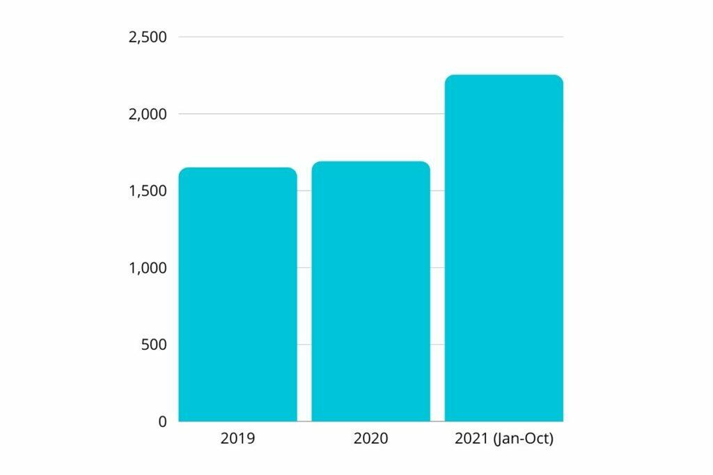 Die bisher verkauften Immobilien im Jahr 2021 (bis Oktober 2021) haben einen Anstieg von 56% mehr Verkäufen als 2019 und einen Umsatzanstieg von 95% in Euro in Bezug auf Direktverkäufe berechnet.