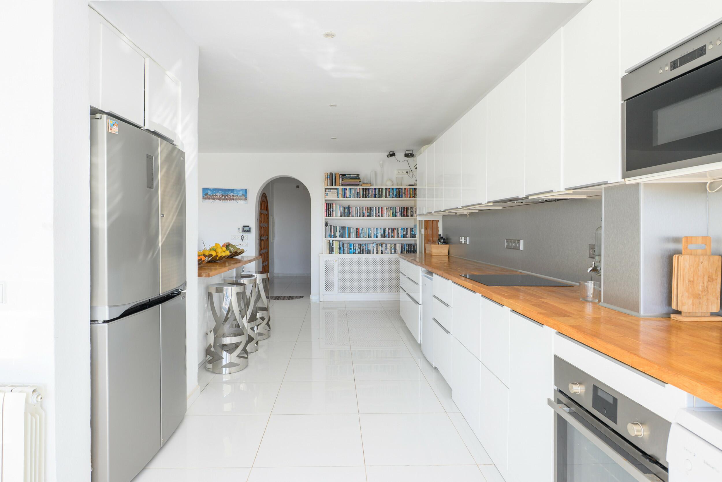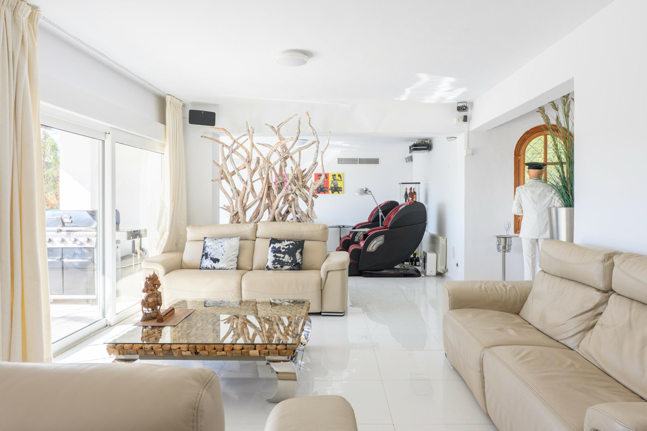 Das Herzstück der Villa ist die riesige, unglaublich gut ausgestattete, offene Küche mit weiß lackierten Hochglanzoberflächen, allen Miele-Geräten, einer Kochinsel und einer coolen Frühstücksbar mit einer LED-beleuchteten Marmorarbeitsplatte. Es gibt eine zentrale Osmoseanlage, die im ganzen Haus hochwertiges Trinkwasser erzeugt.