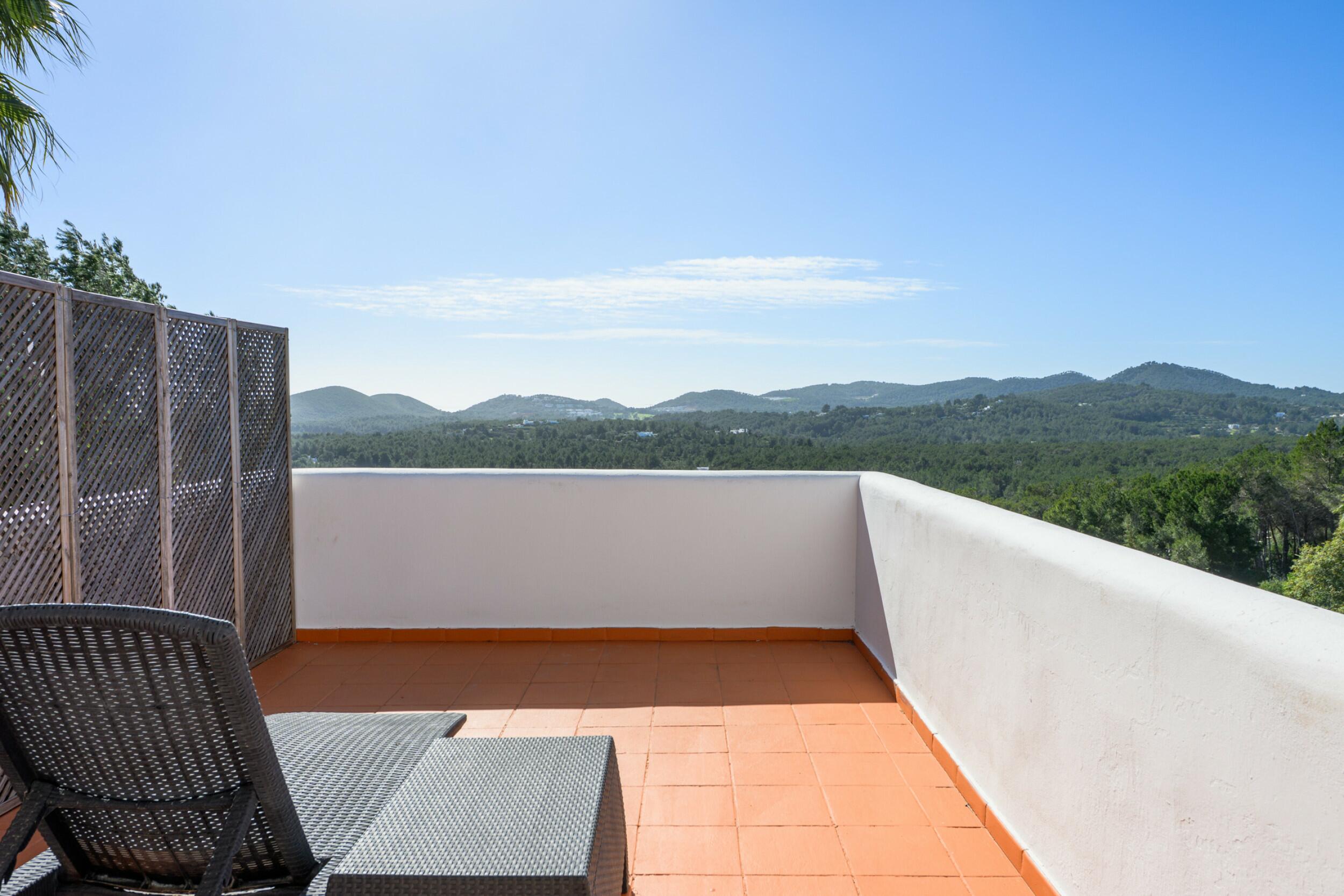 Die 4 Terrassen des Haupthauses haben einen spektakulären Blick auf das Mittelmeer und die geschäftige Stadt und den Hafen von Santa Eulalia, 228 m2 im Erdgeschoss, 150 m2 im Obergeschoss, 125 m2 auf Ebene 2 und eine sehr coole 89 m2 große Dachterrasse mit eigenem Jacuzzi auf dem Poolhaus im Obergeschoss, mit erstaunlichen iPad-gesteuerten Sonnenschirmen auf der Dachterrasse.
