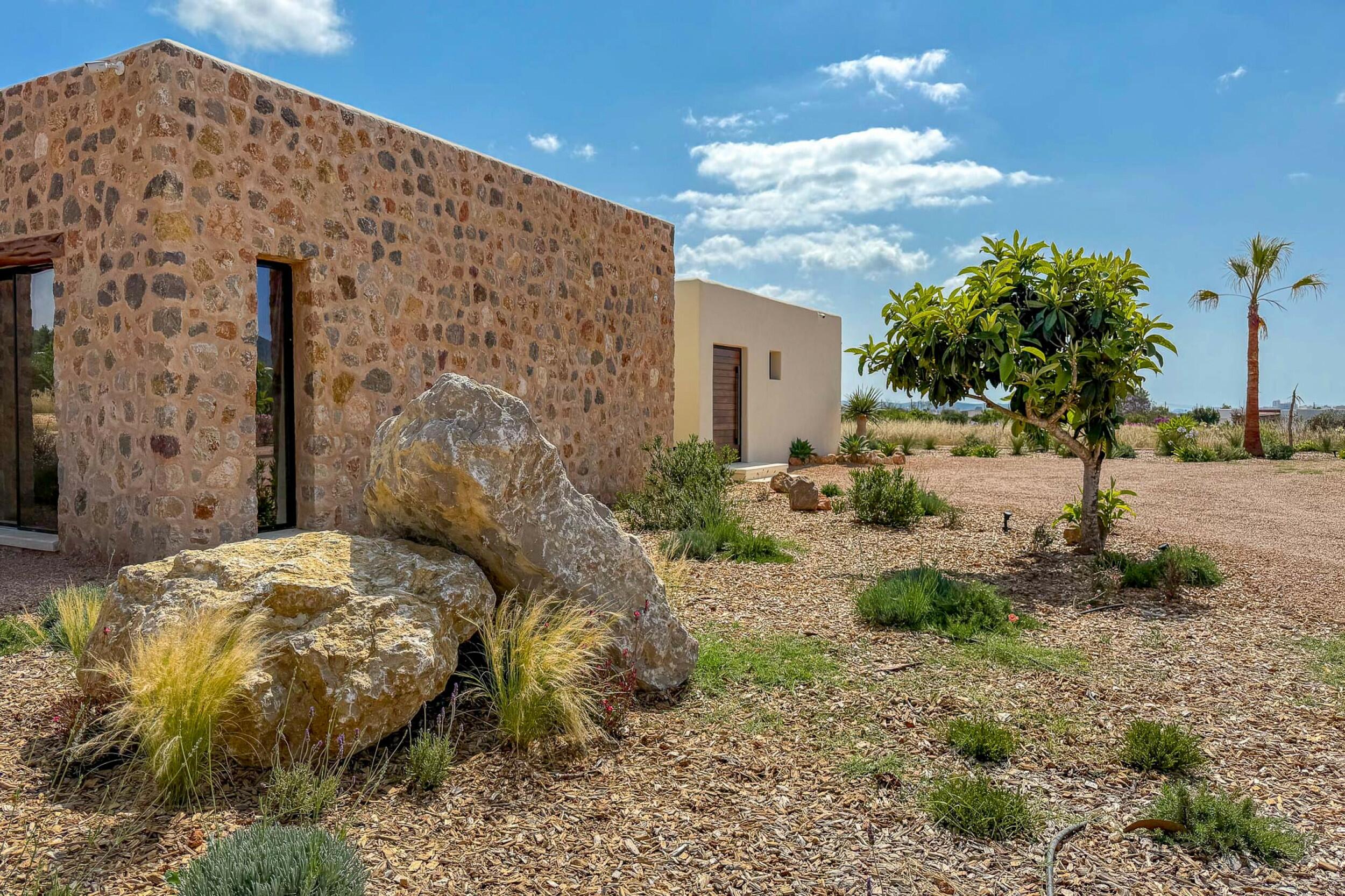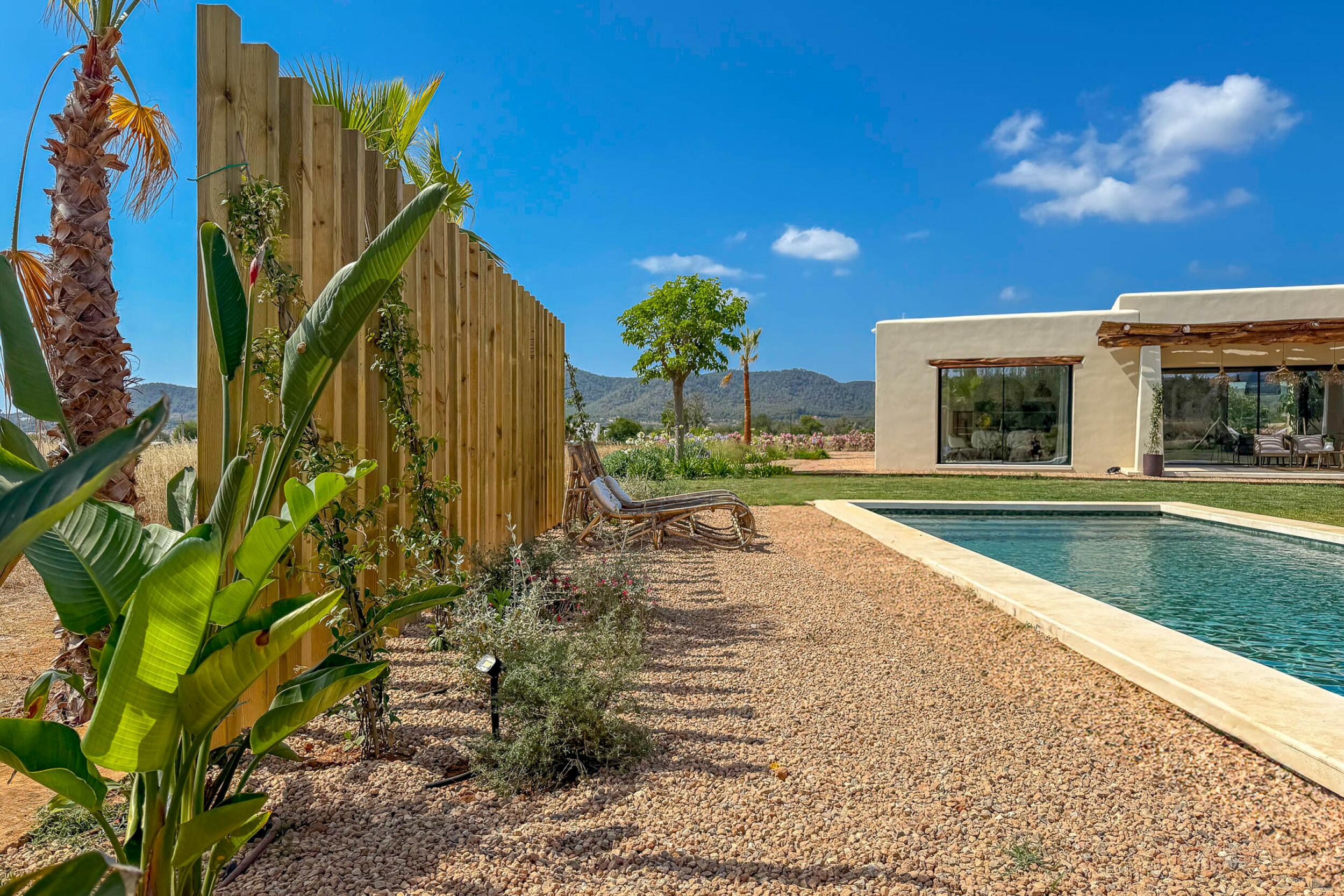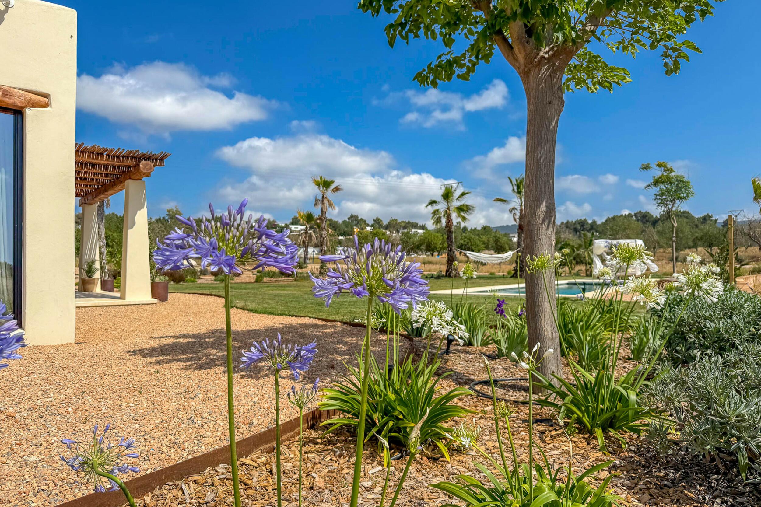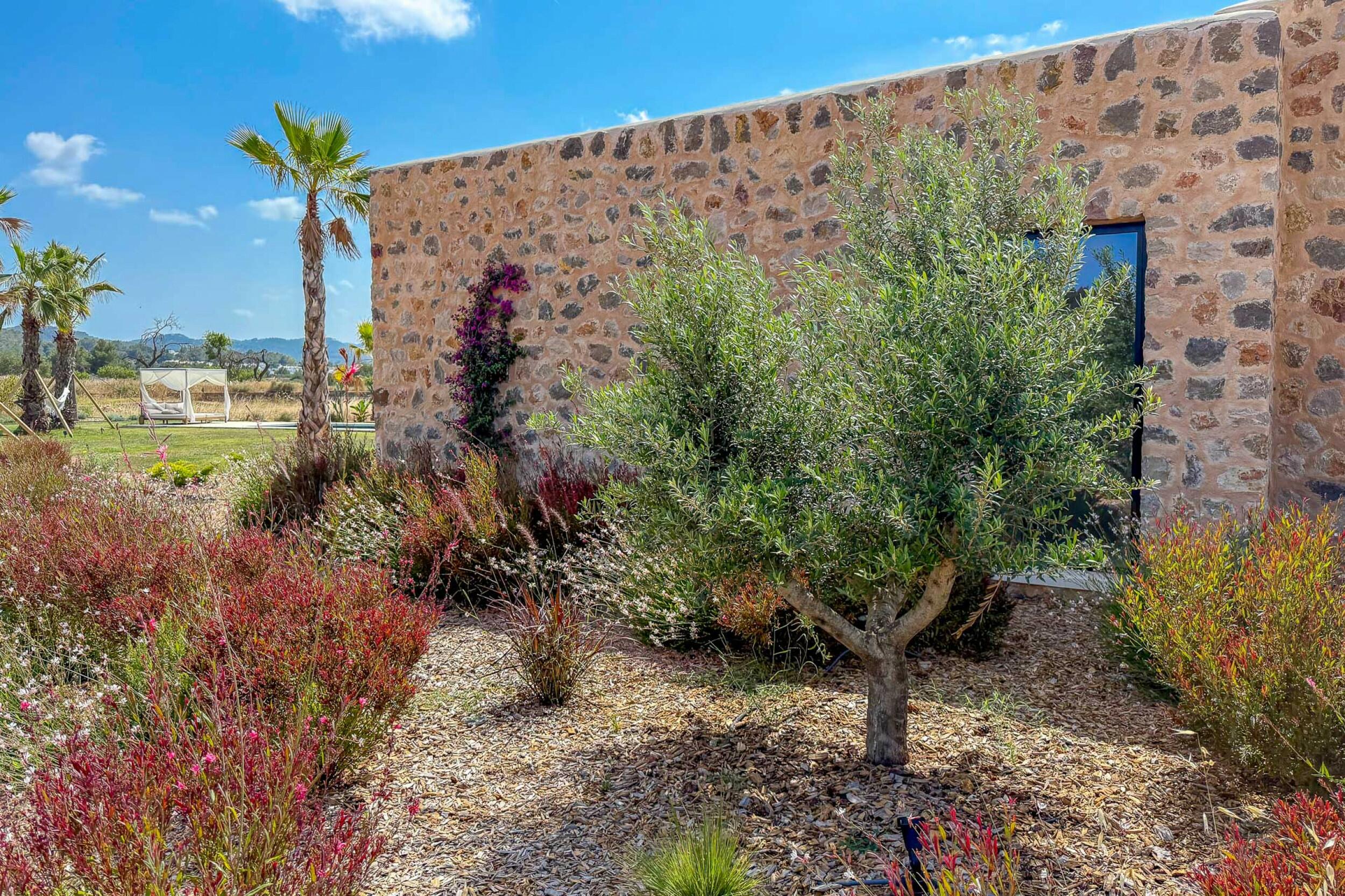 Der Außenbereich dieser einzigartigen Finca ist geprägt von der schlichten Schönheit der natürlichen Landschaft Ibizas und dem grünen Daumen des Eigentümers. Das Anwesen ist umgeben von über 1.000 Jahre alten Olivenbäumen, Mandelbäumen, zahlreichen Sabina-Bäumen, Orangen- und Zitronenbäumen und vielen mehr. Ein beheizter Salzwasser-Pool von 4 x 14 Metern ist ein herausragendes Merkmal der Immobilie, komplett mit einer elektrischen Abdeckung, die die Badesaison bis in den Herbst hinein verlängert. Der Rosengarten und die tropische Landschaftsgestaltung rund um den Poolbereich bieten ein visuell beeindruckendes und erdendes Erlebnis.