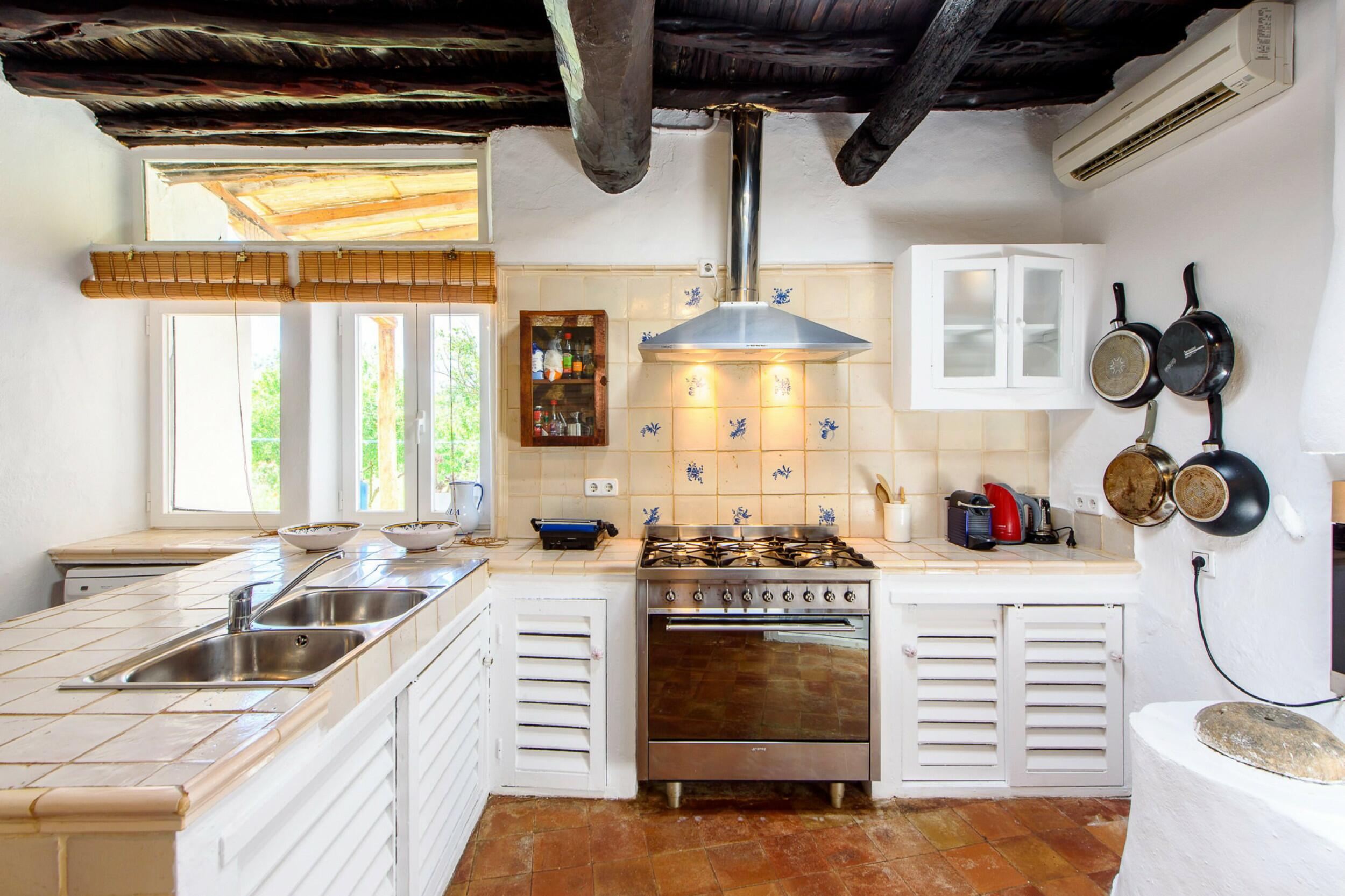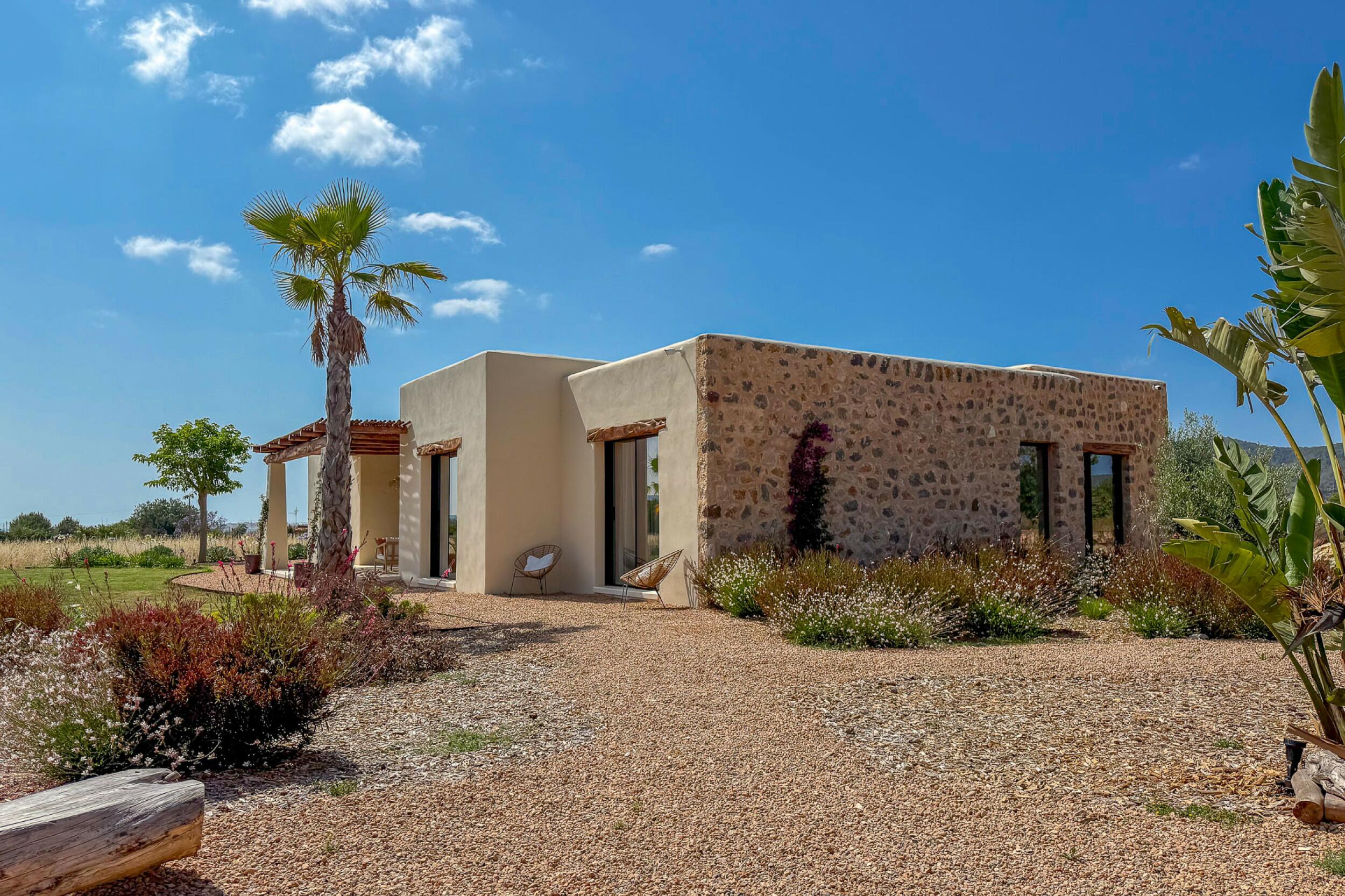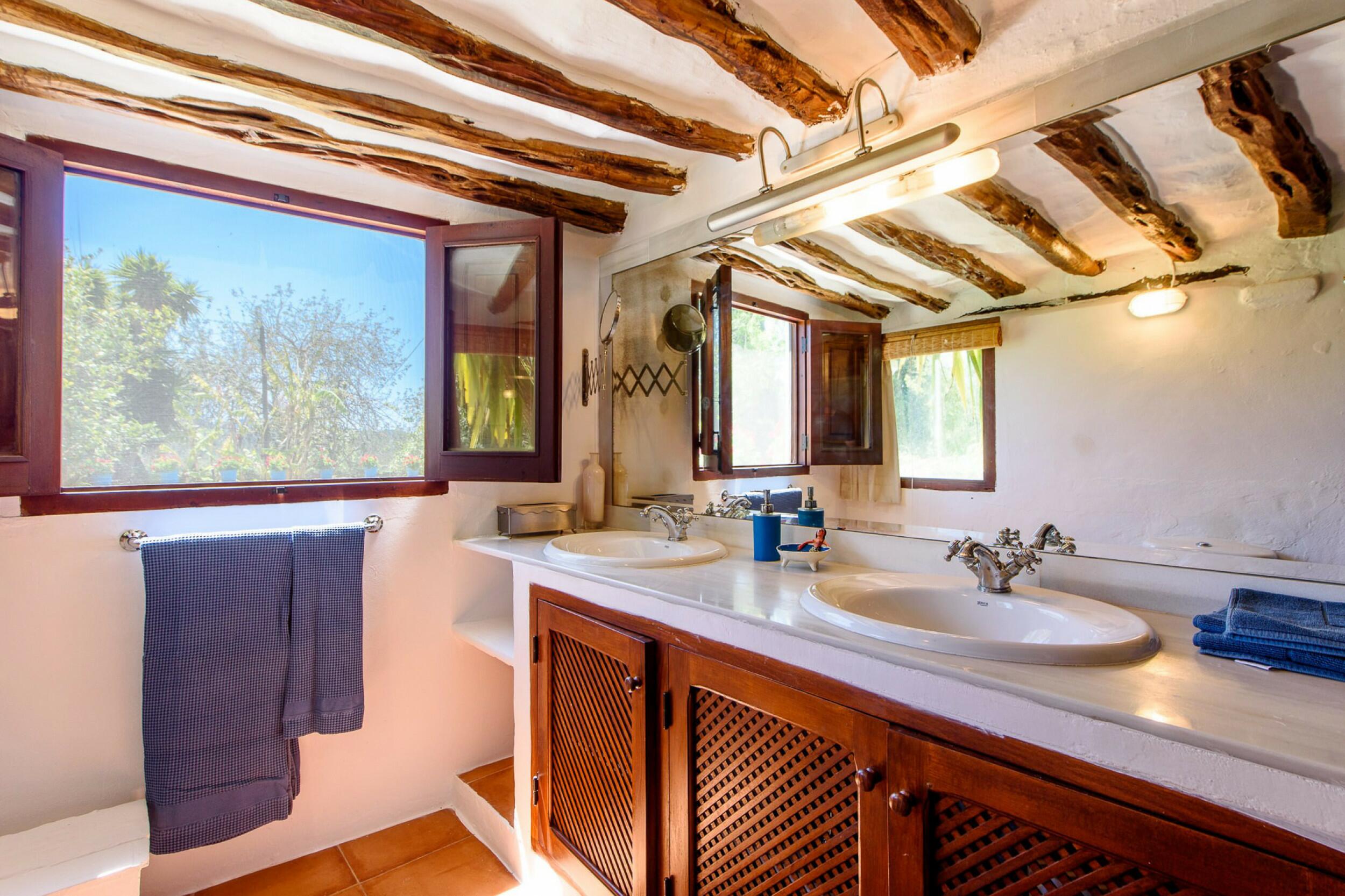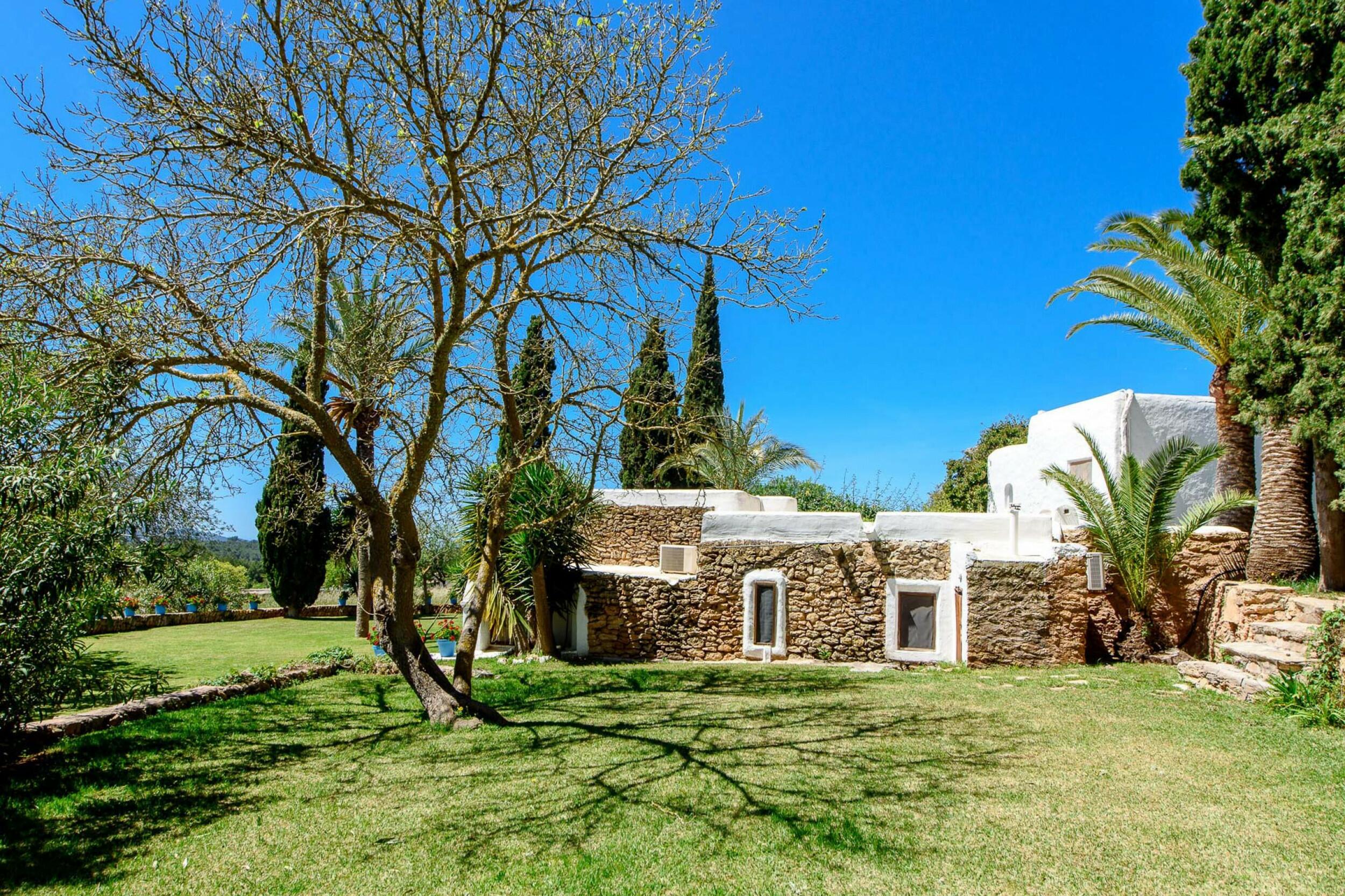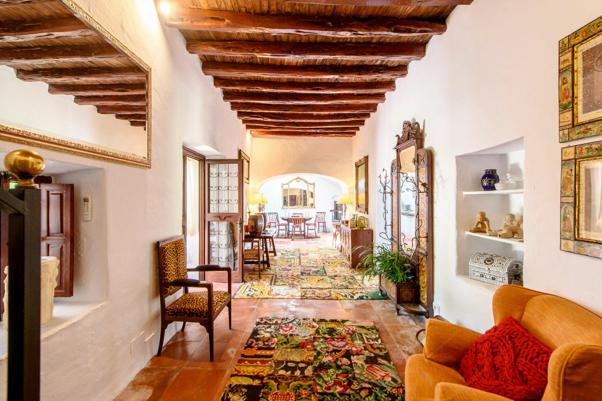 Das Haus ist in zwei Teile untergliedert. Der alte Fincateil hat hohe Decken und alte Steinmauern und verfügt über ein Esszimmer, eine voll ausgestattete Küche und das Hauptschlafzimmer mit begehbarem Kleiderschrank (oder Babyzimmer). Über ein paar Stufen gelangt man in ein Badezimmer mit großer Badewanne und separater Toilette. Im Esszimmer befindet sich ein schwedischer Holzofen. Der neuere, weiße Teil des Hauses wurde 2009 gebaut und besteht aus dem Wohnzimmer, 3 Doppelschlafzimmern und 3 Bädern mit Duschen. Im Wohnzimmer gibt es einen Holzkamin. Alle Räume öffnen sich zur wunderschönen Landschaft Ibizas, mit mehreren Sonnenterrassen rund um das Haus.