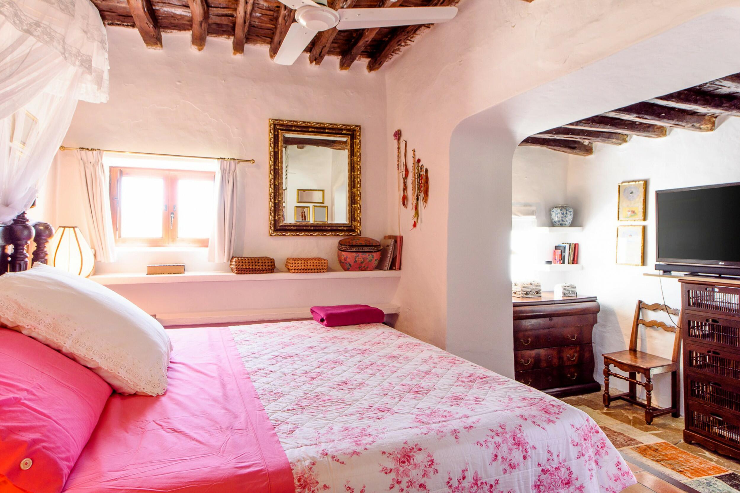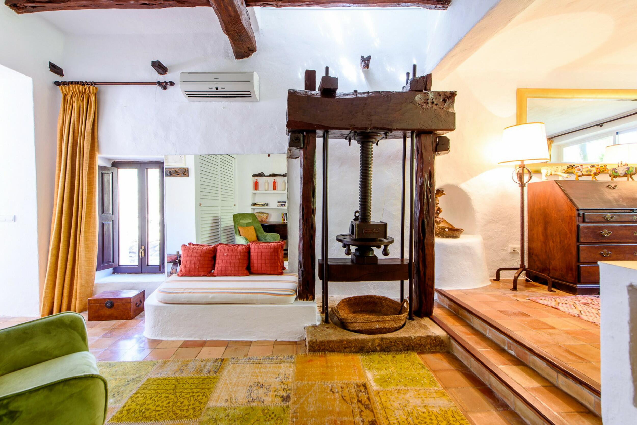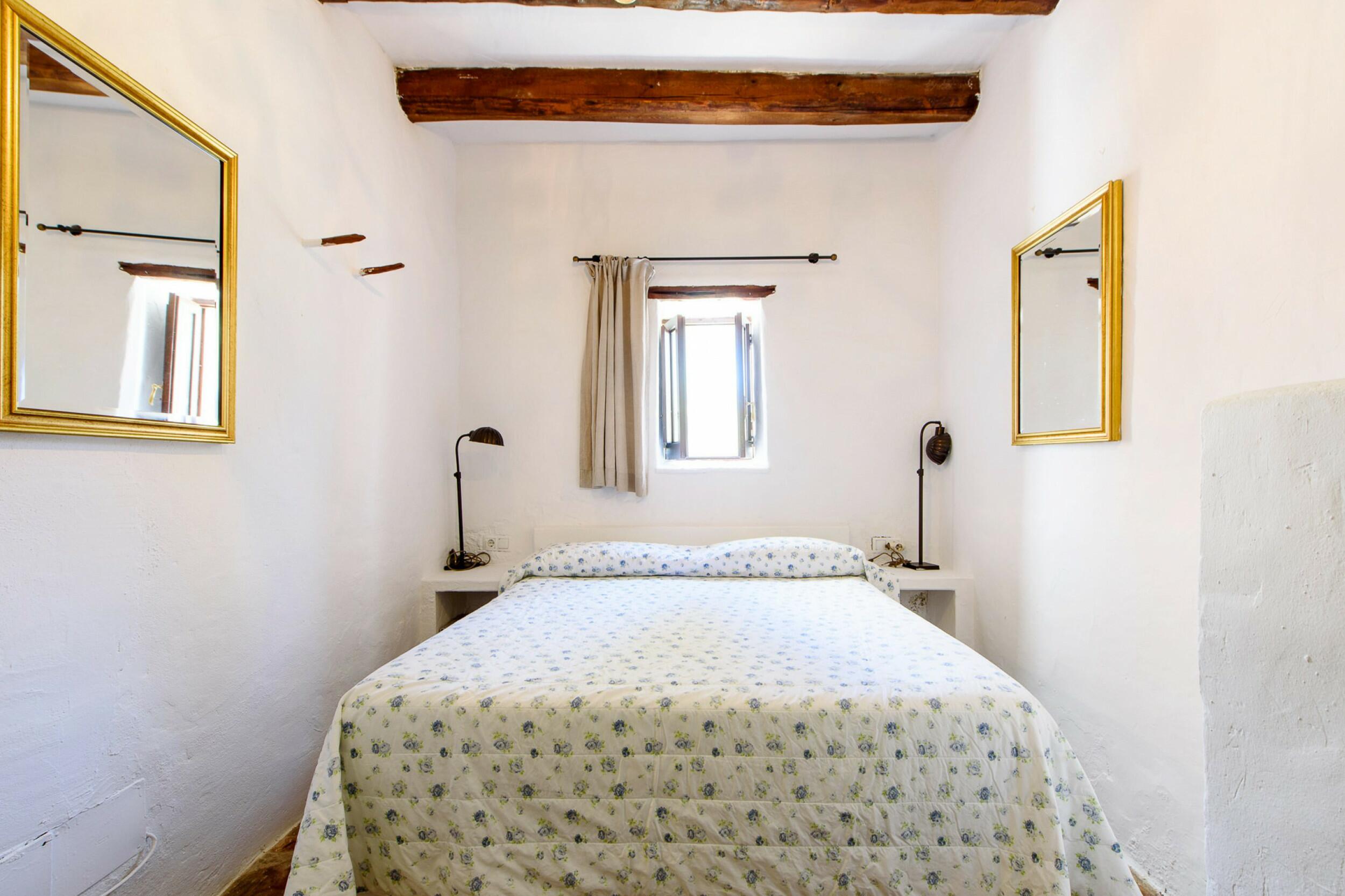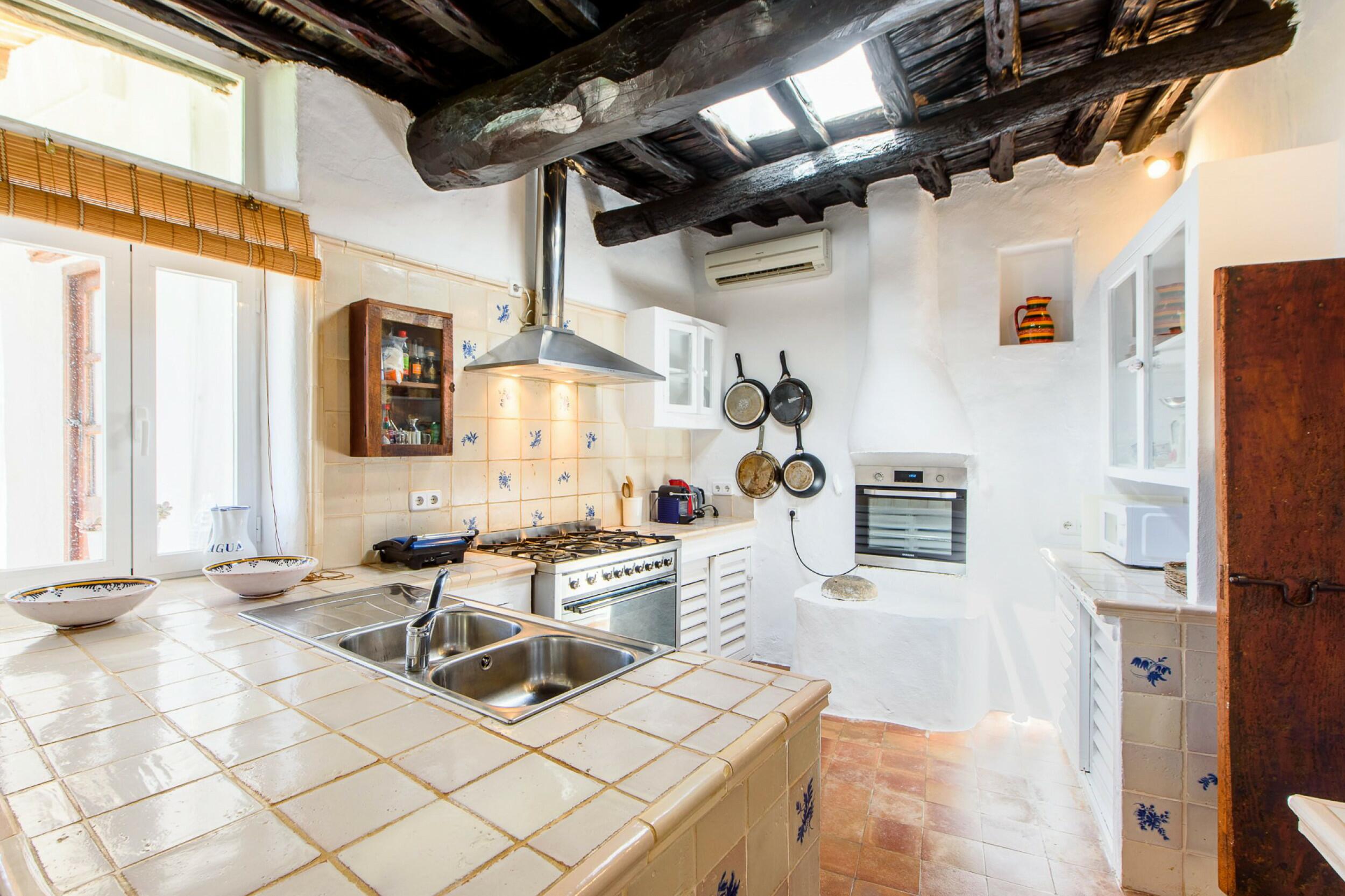 Das Haus ist in zwei Teile untergliedert. Der alte Fincateil hat hohe Decken und alte Steinmauern und verfügt über ein Esszimmer, eine voll ausgestattete Küche und das Hauptschlafzimmer mit begehbarem Kleiderschrank (oder Babyzimmer). Über ein paar Stufen gelangt man in ein Badezimmer mit großer Badewanne und separater Toilette. Im Esszimmer befindet sich ein schwedischer Holzofen. Der neuere, weiße Teil des Hauses wurde 2009 gebaut und besteht aus dem Wohnzimmer, 3 Doppelschlafzimmern und 3 Bädern mit Duschen. Im Wohnzimmer gibt es einen Holzkamin. Alle Räume öffnen sich zur wunderschönen Landschaft Ibizas, mit mehreren Sonnenterrassen rund um das Haus.