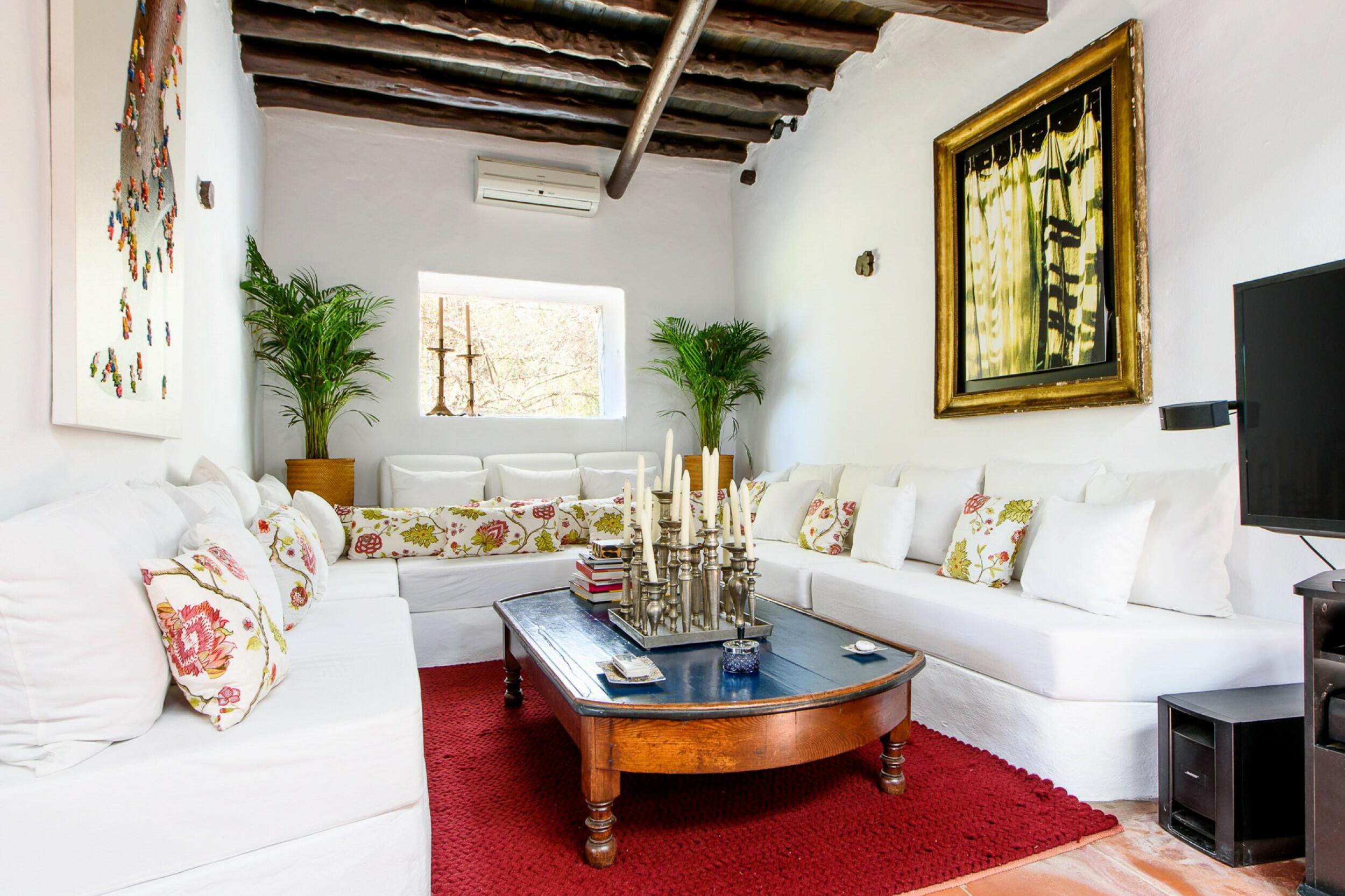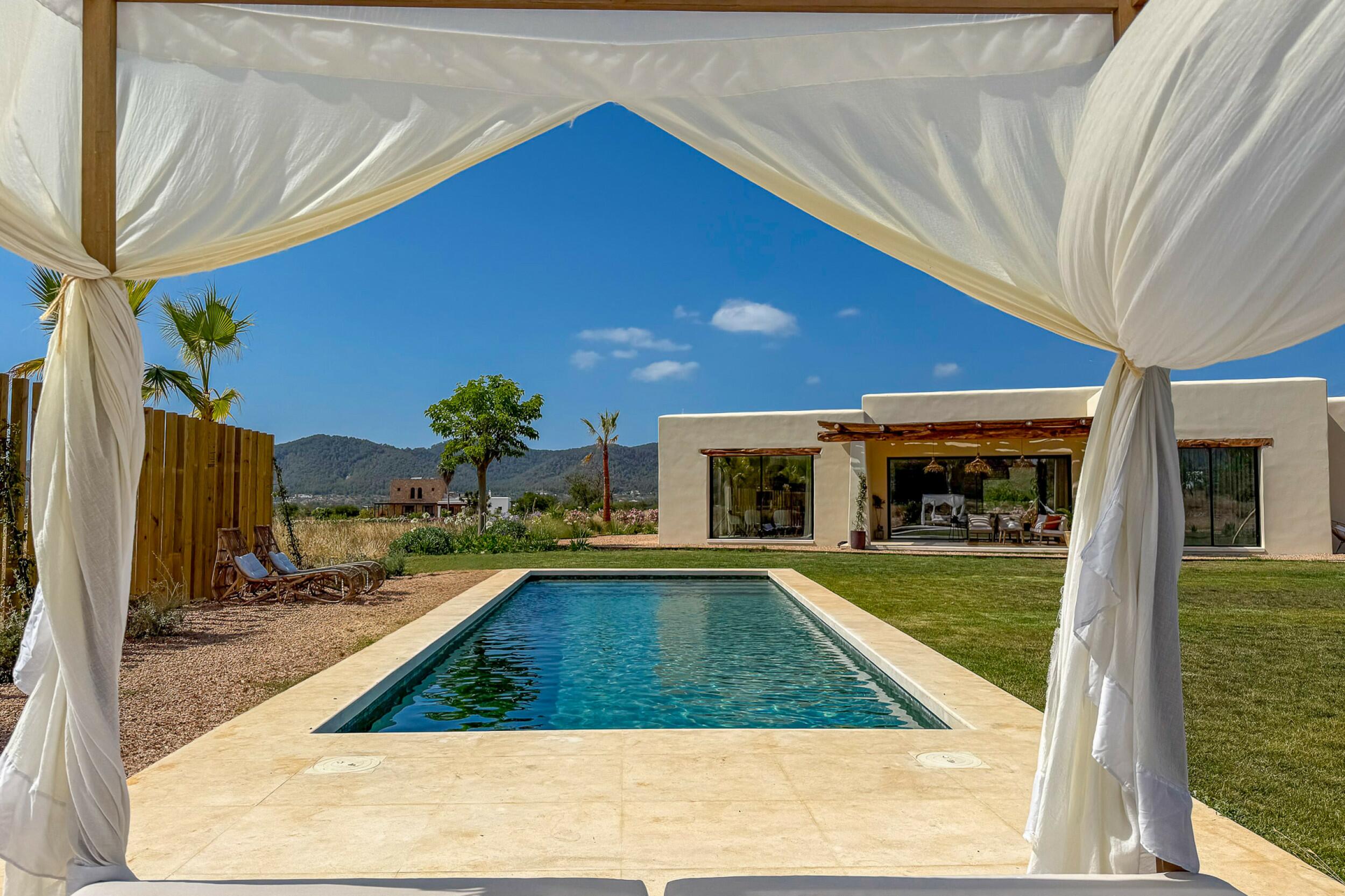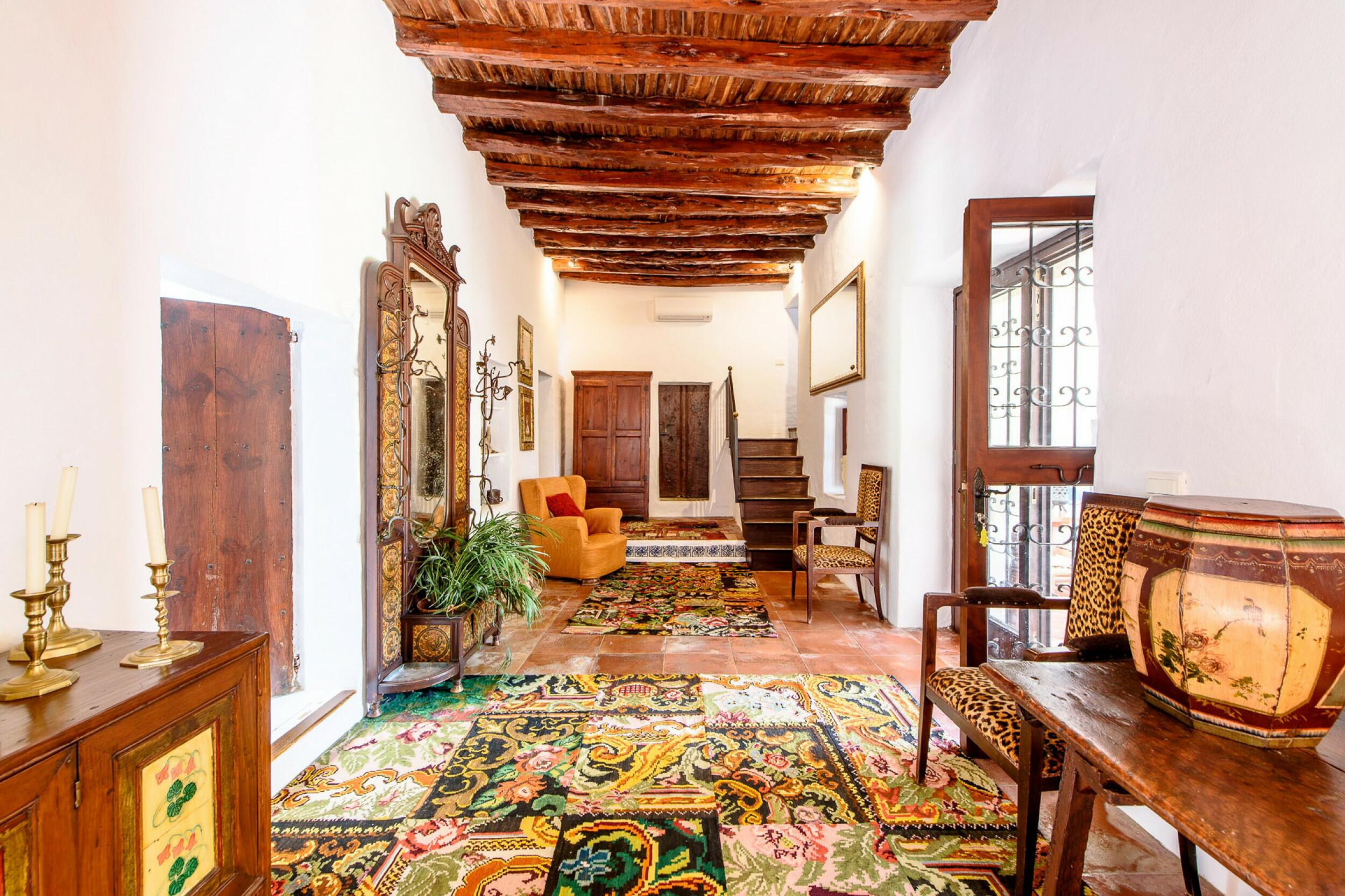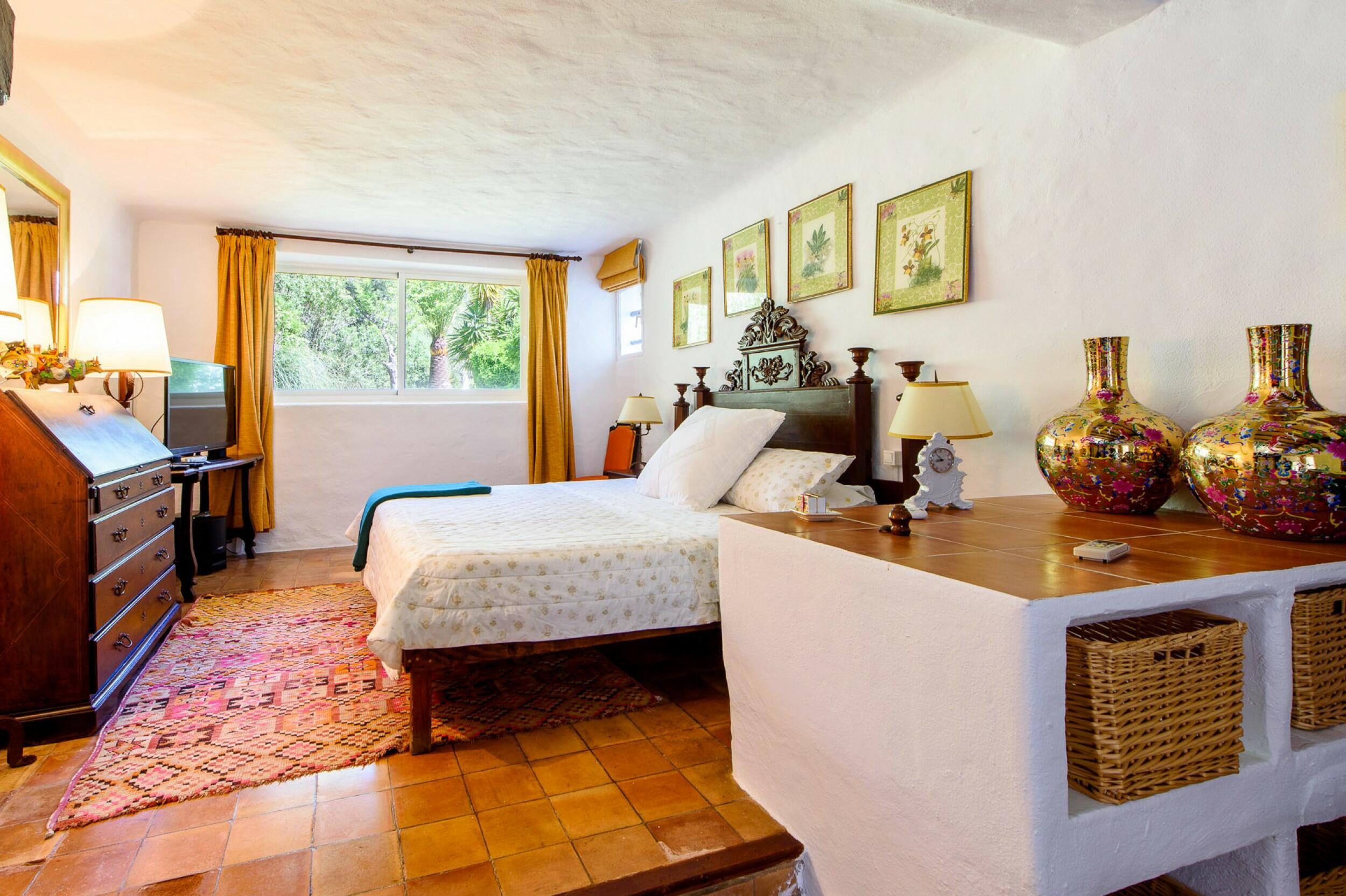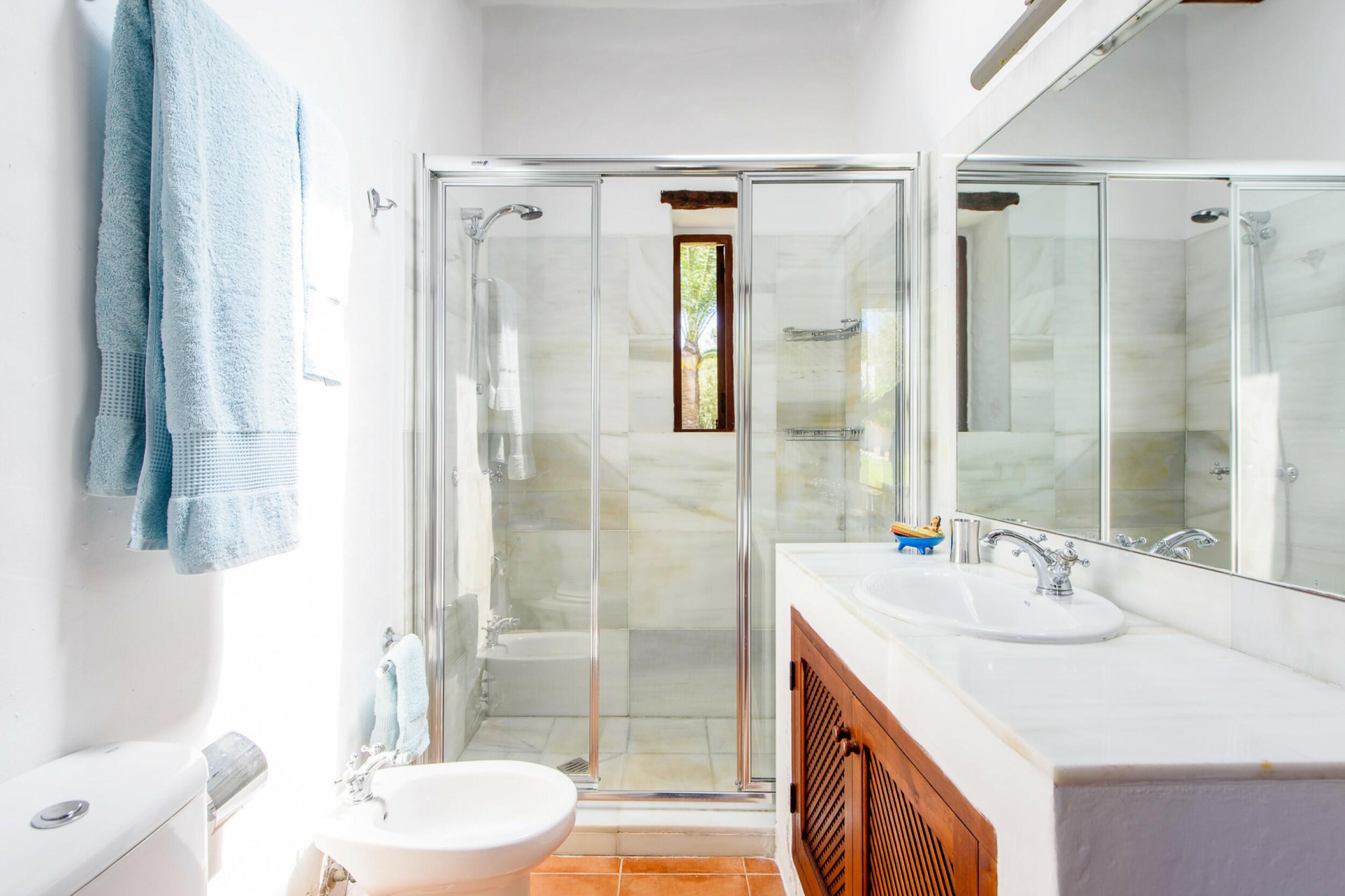 Das Haus ist in zwei Teile untergliedert. Der alte Fincateil hat hohe Decken und alte Steinmauern und verfügt über ein Esszimmer, eine voll ausgestattete Küche und das Hauptschlafzimmer mit begehbarem Kleiderschrank (oder Babyzimmer). Über ein paar Stufen gelangt man in ein Badezimmer mit großer Badewanne und separater Toilette. Im Esszimmer befindet sich ein schwedischer Holzofen. Der neuere, weiße Teil des Hauses wurde 2009 gebaut und besteht aus dem Wohnzimmer, 3 Doppelschlafzimmern und 3 Bädern mit Duschen. Im Wohnzimmer gibt es einen Holzkamin. Alle Räume öffnen sich zur wunderschönen Landschaft Ibizas, mit mehreren Sonnenterrassen rund um das Haus.