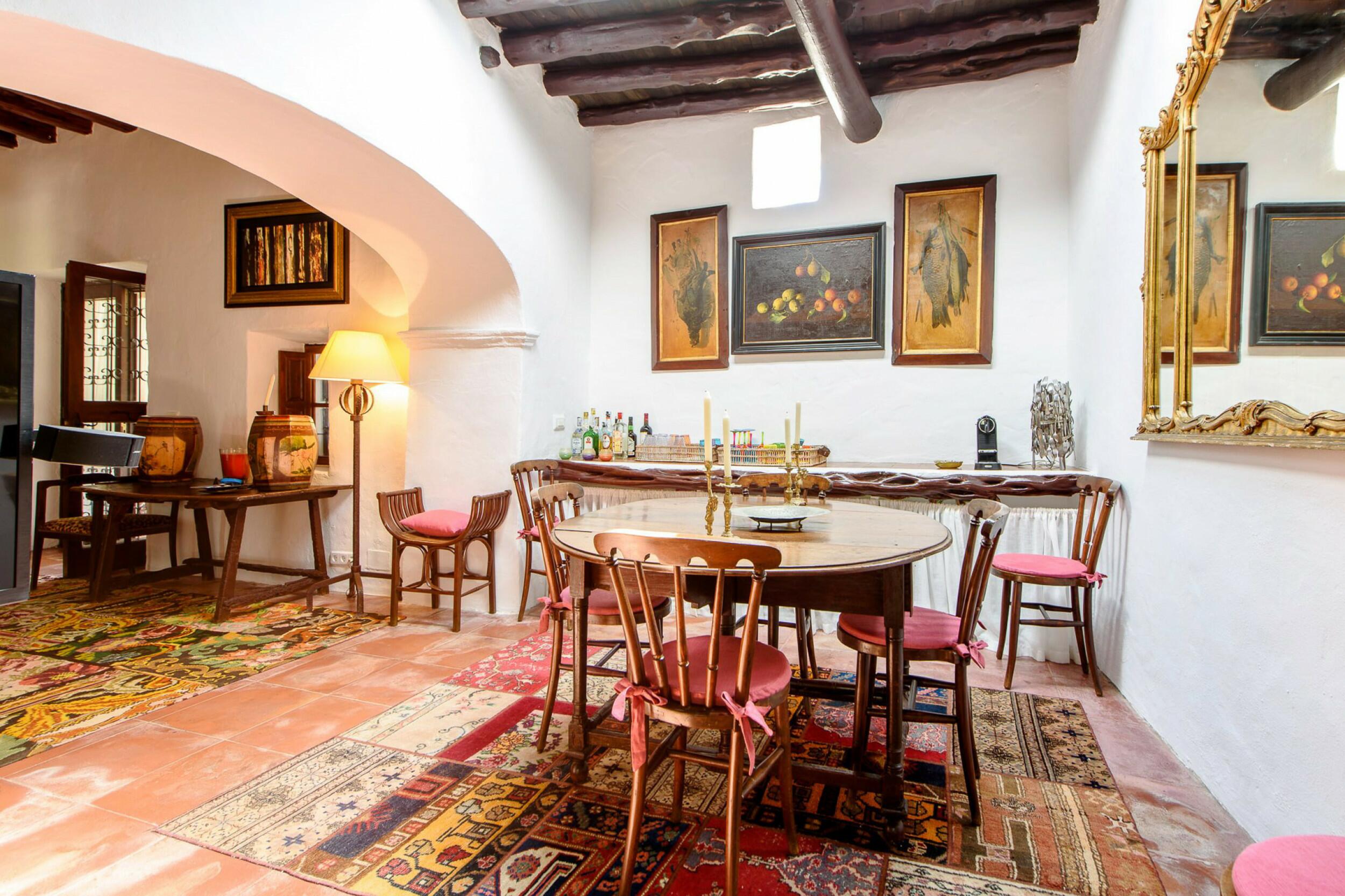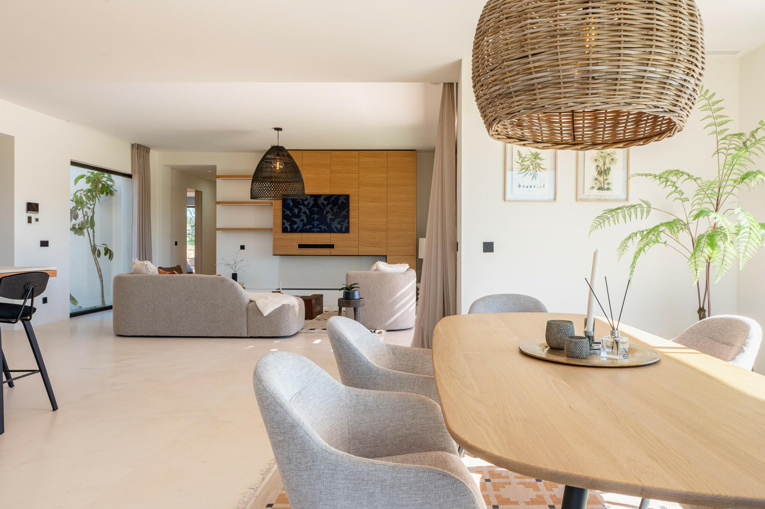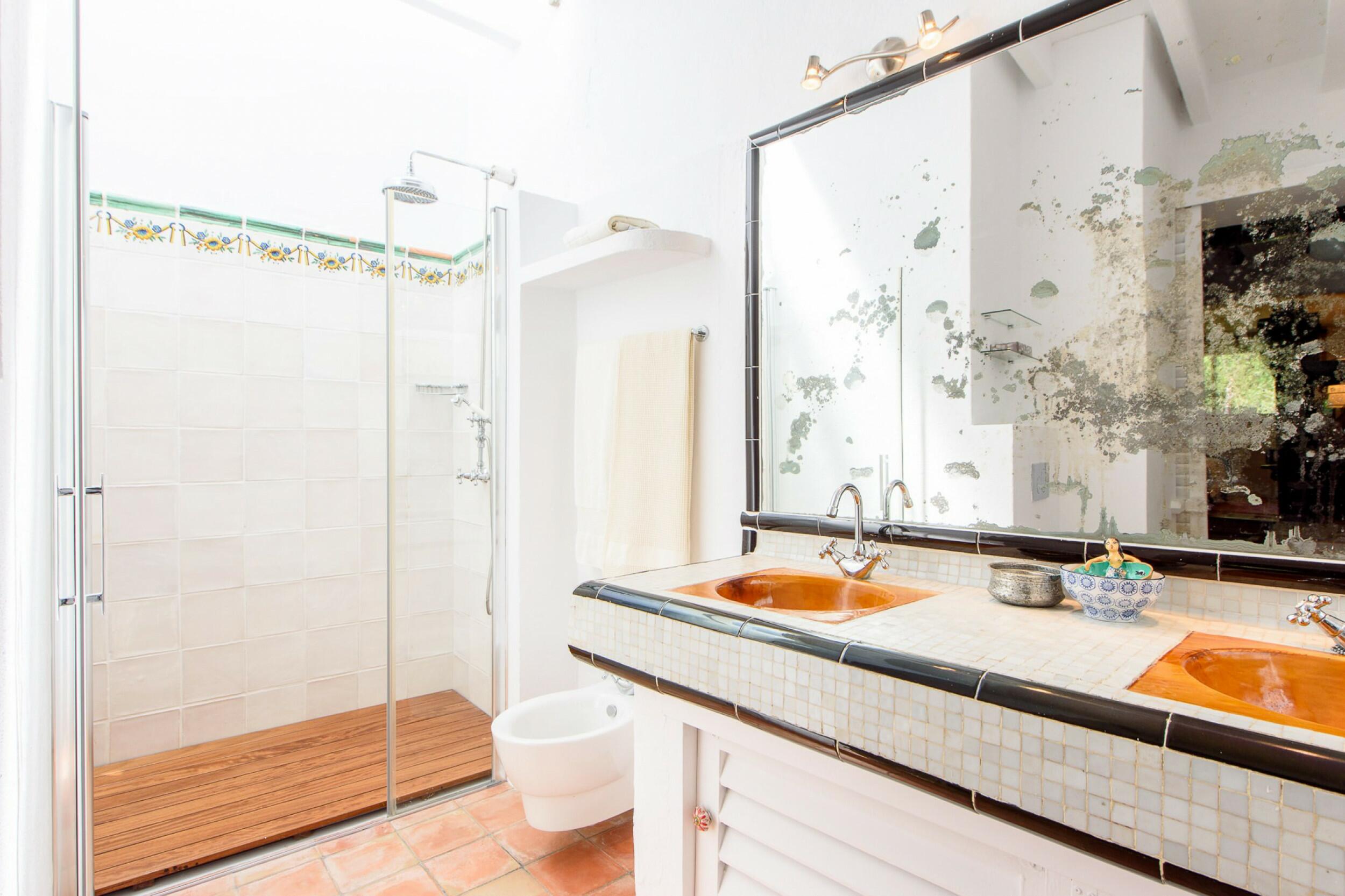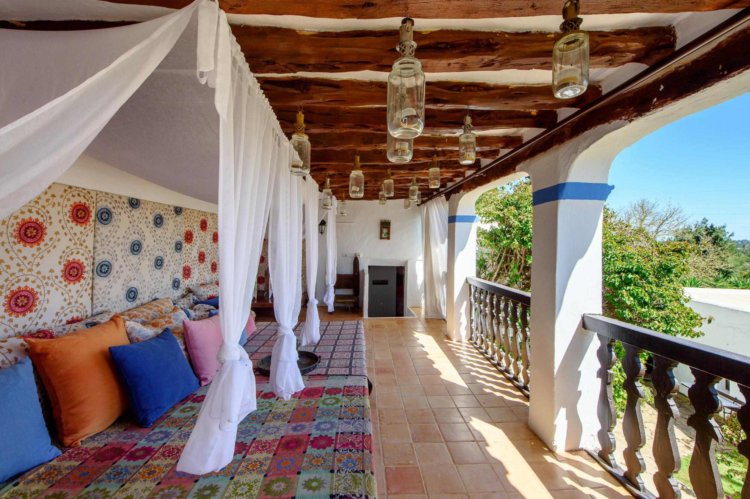Das Haus ist in zwei Teile untergliedert. Der alte Fincateil hat hohe Decken und alte Steinmauern und verfügt über ein Esszimmer, eine voll ausgestattete Küche und das Hauptschlafzimmer mit begehbarem Kleiderschrank (oder Babyzimmer). Über ein paar Stufen gelangt man in ein Badezimmer mit großer Badewanne und separater Toilette. Im Esszimmer befindet sich ein schwedischer Holzofen. Der neuere, weiße Teil des Hauses wurde 2009 gebaut und besteht aus dem Wohnzimmer, 3 Doppelschlafzimmern und 3 Bädern mit Duschen. Im Wohnzimmer gibt es einen Holzkamin. Alle Räume öffnen sich zur wunderschönen Landschaft Ibizas, mit mehreren Sonnenterrassen rund um das Haus.