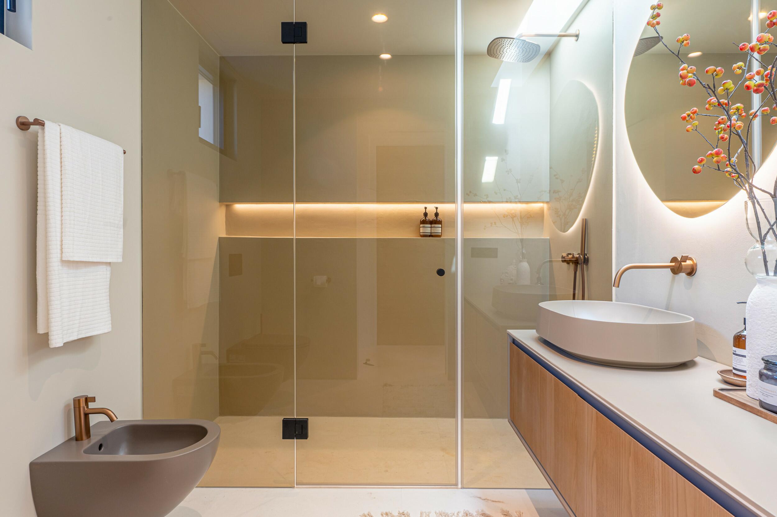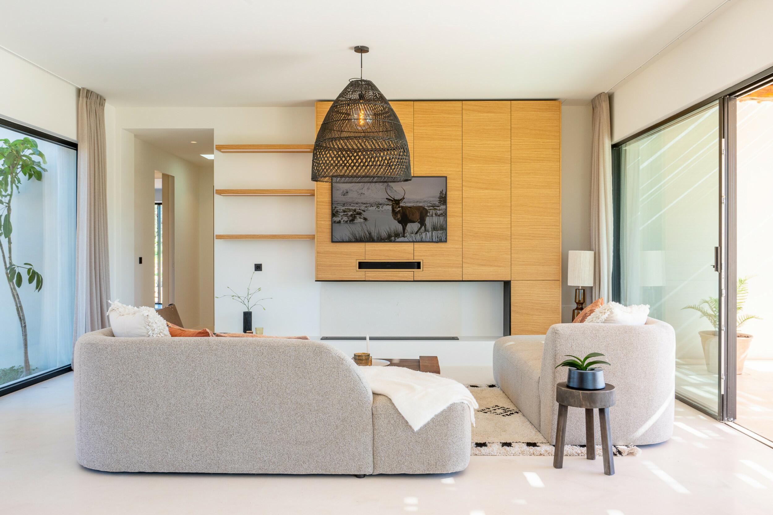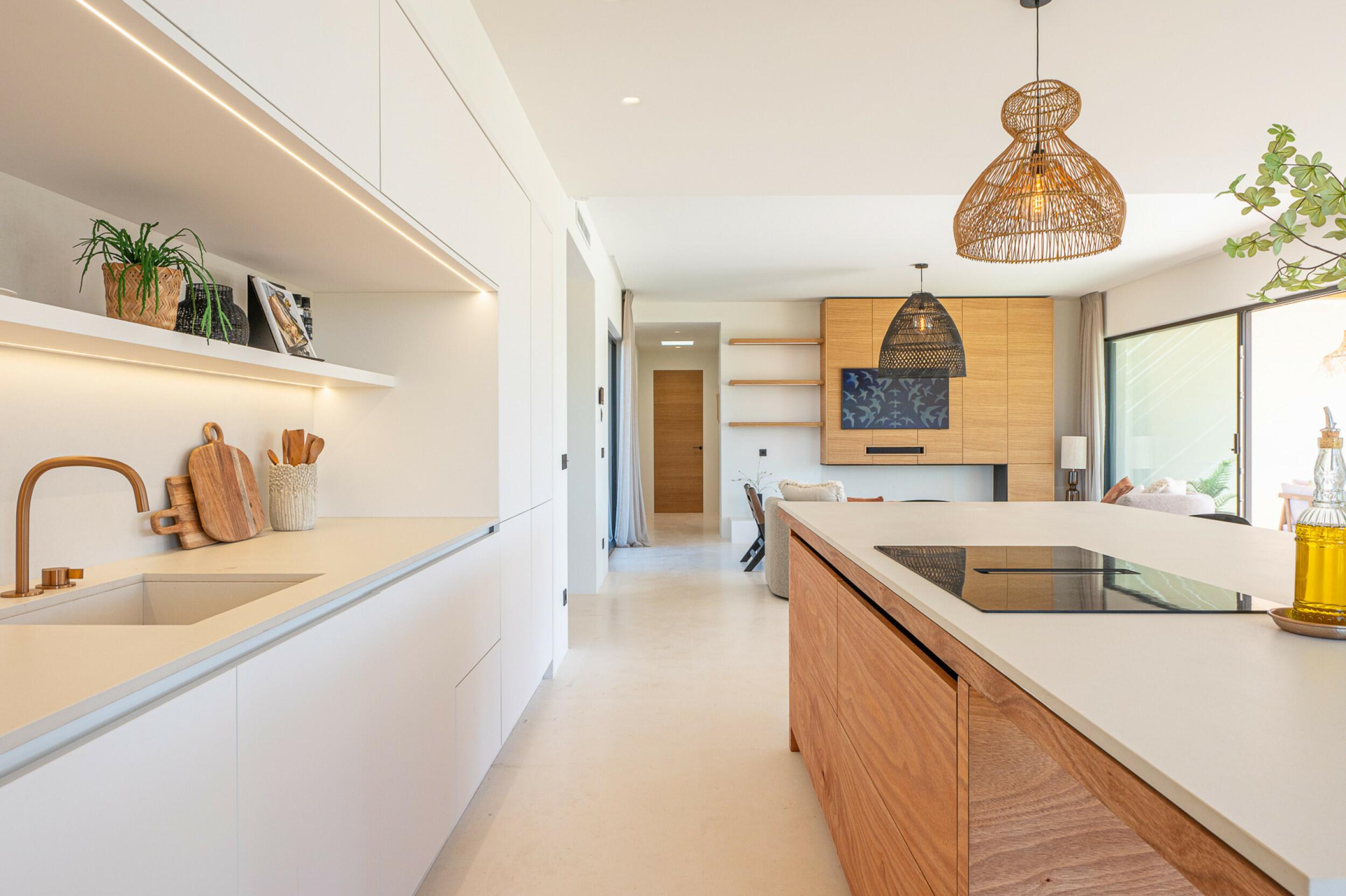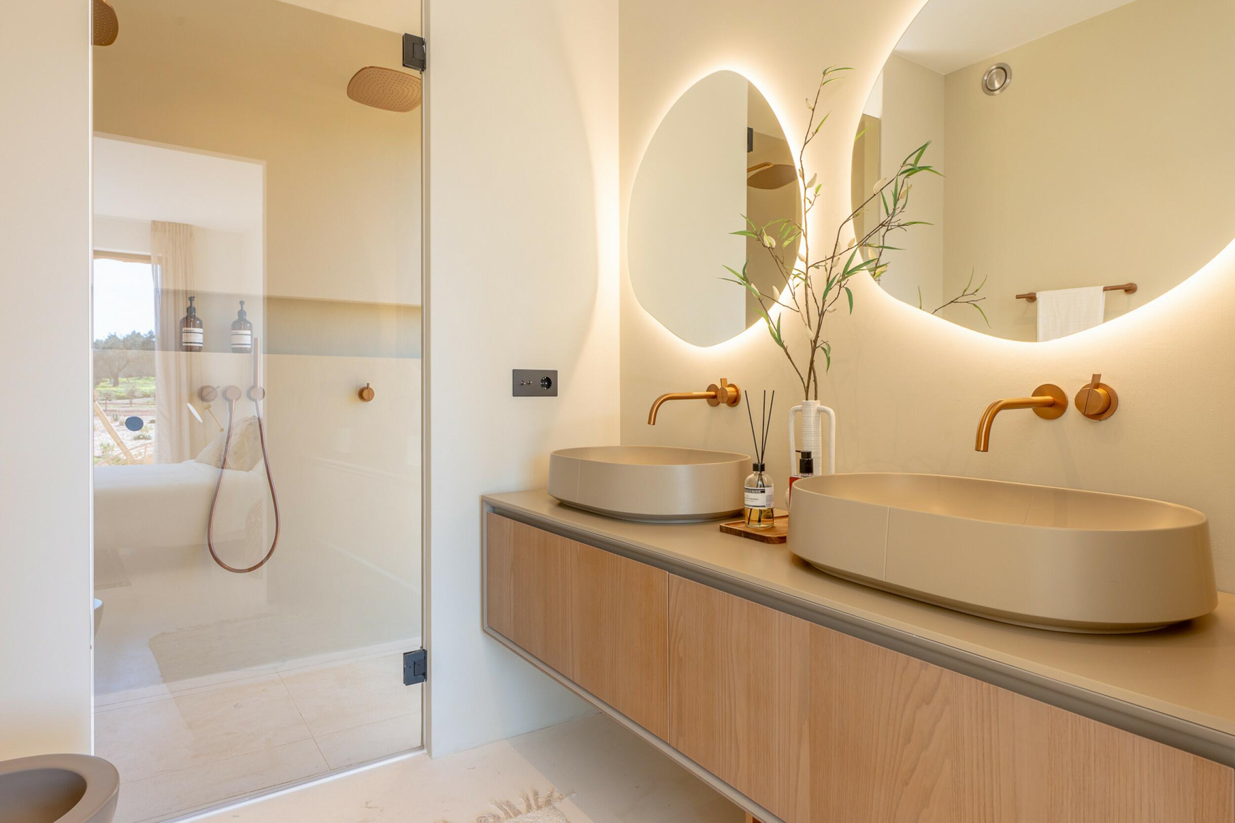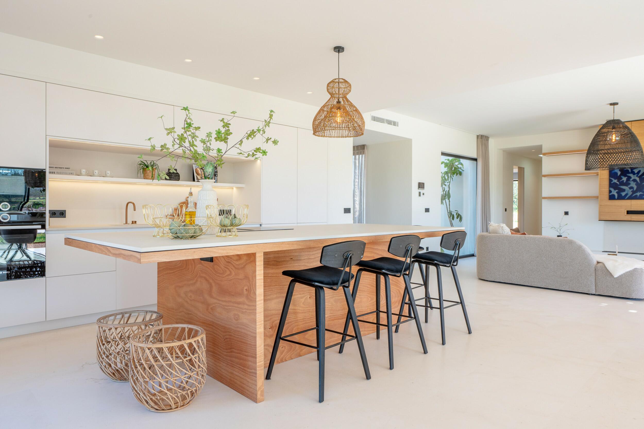Das Haus ist in zwei Teile untergliedert. Der alte Fincateil hat hohe Decken und alte Steinmauern und verfügt über ein Esszimmer, eine voll ausgestattete Küche und das Hauptschlafzimmer mit begehbarem Kleiderschrank (oder Babyzimmer). Über ein paar Stufen gelangt man in ein Badezimmer mit großer Badewanne und separater Toilette. Im Esszimmer befindet sich ein schwedischer Holzofen. Der neuere, weiße Teil des Hauses wurde 2009 gebaut und besteht aus dem Wohnzimmer, 3 Doppelschlafzimmern und 3 Bädern mit Duschen. Im Wohnzimmer gibt es einen Holzkamin. Alle Räume öffnen sich zur wunderschönen Landschaft Ibizas, mit mehreren Sonnenterrassen rund um das Haus.