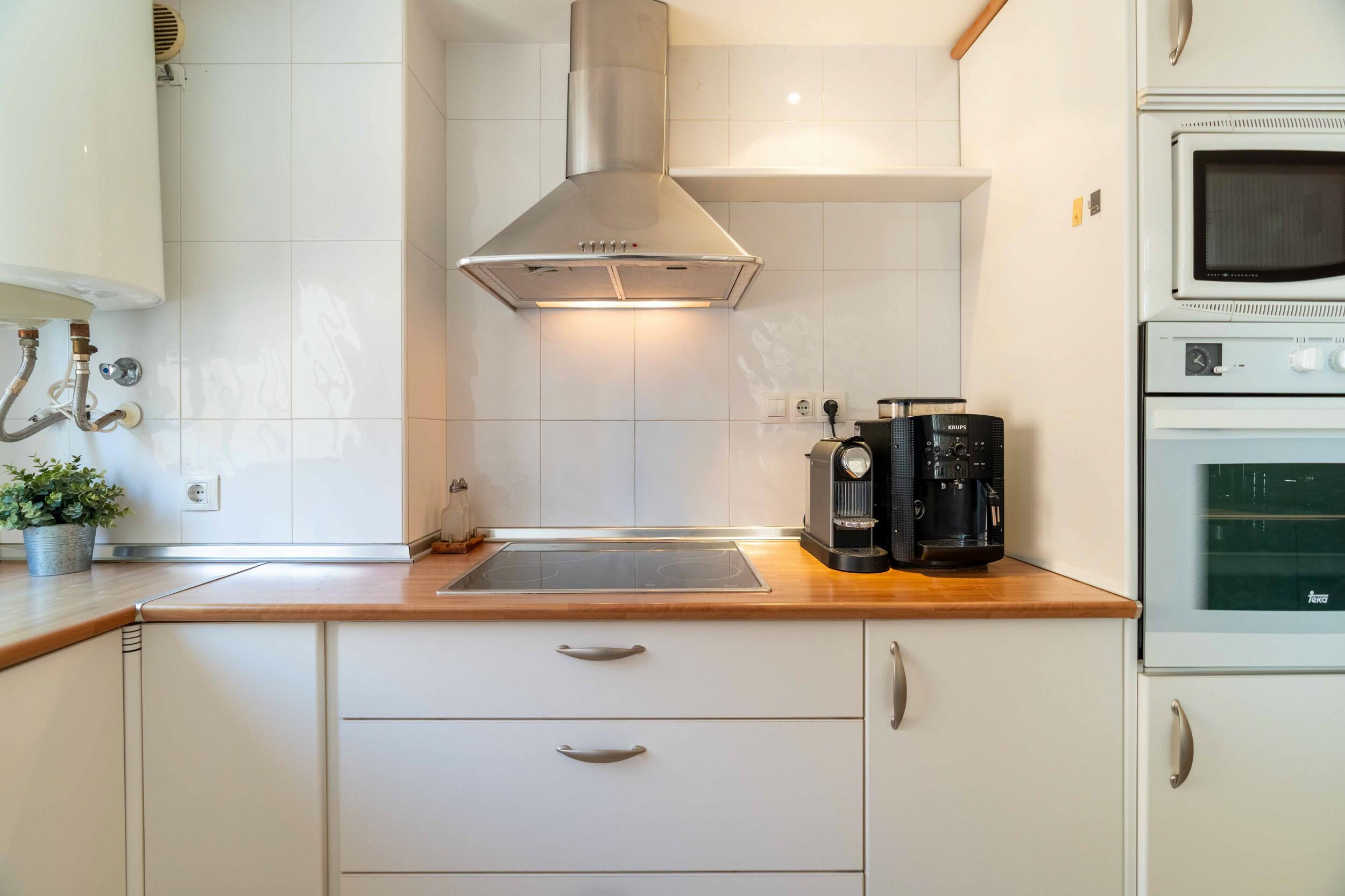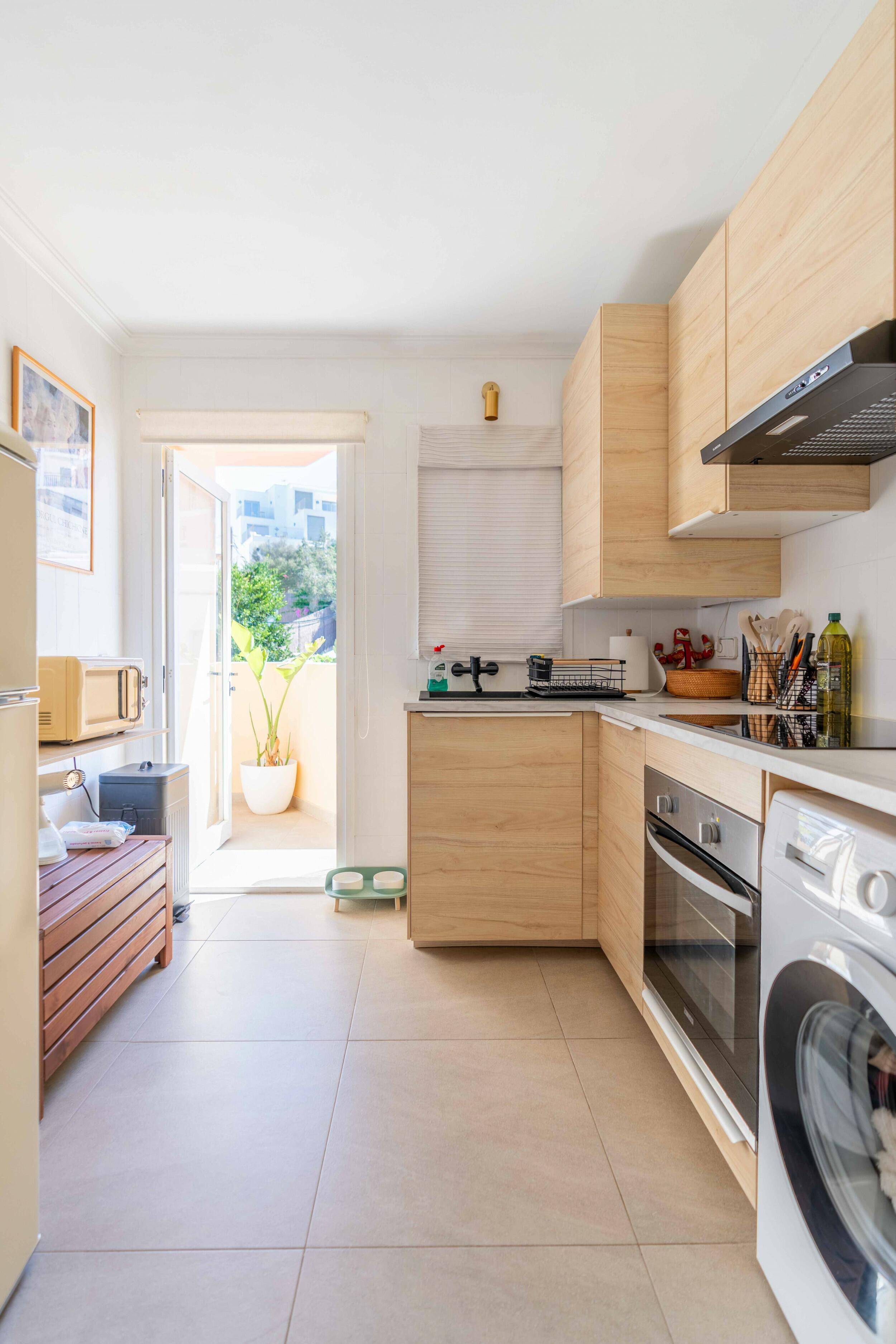 Die Wohnküche ist mit natürlichen Materialien gestaltet, wobei das Holz in der Struktur und eine hochwertige Arbeitsplatte hervorgehoben werden. Sie ist mit modernen Geräten ausgestattet: Geschirrspüler, Backofen, Induktionskochfeld, Waschmaschine mit Trocknerfunktion, Kühlschrank und Gefrierschrank. Ein hoher Tisch mit vier Stühlen vervollständigt die Küche und schafft einen idealen Ort, um Mahlzeiten zu genießen. Das Wohnzimmer bietet ein elegantes und bequemes Sofa, das zum Entspannen einlädt. Das Wohnzimmer verfügt über ein großes Sofa mit einer bequemen Sitzecke, die zum Entspannen einlädt.