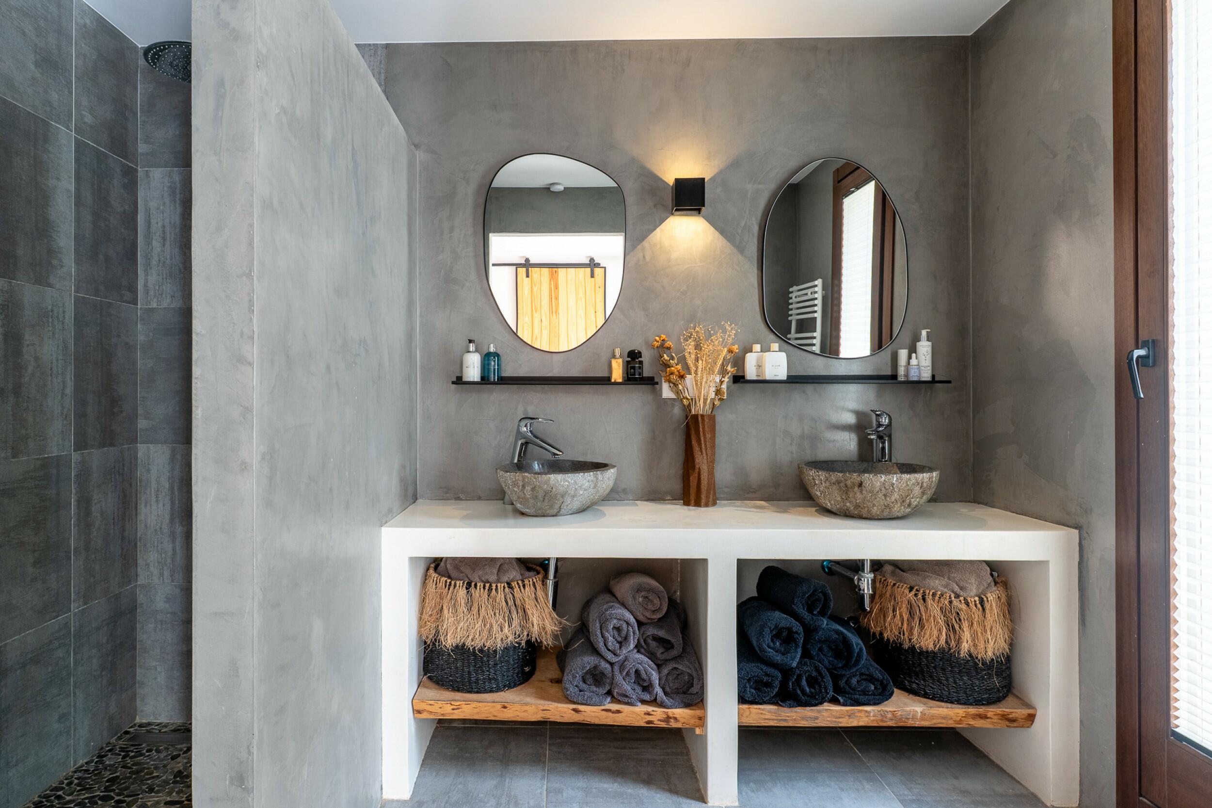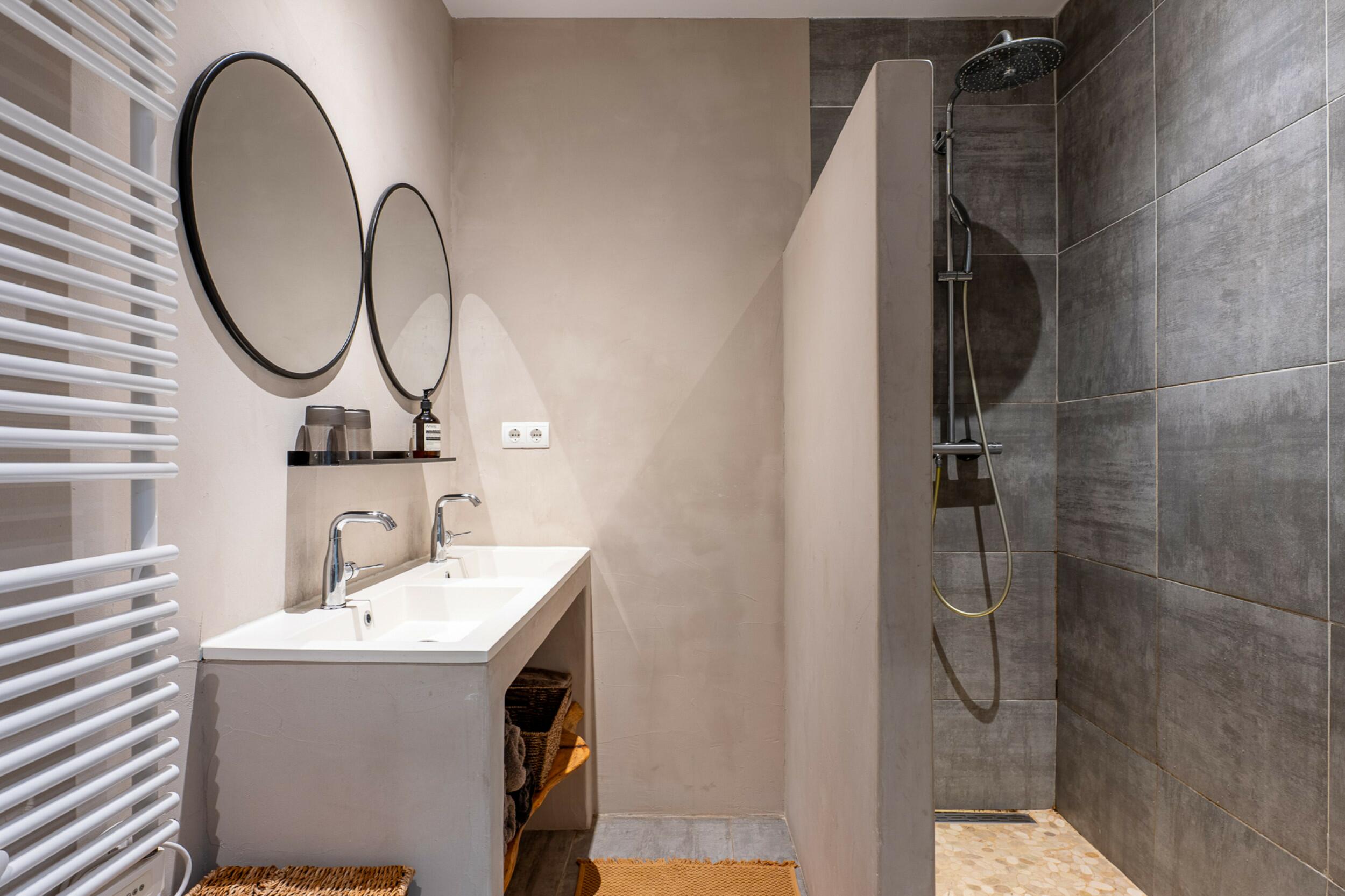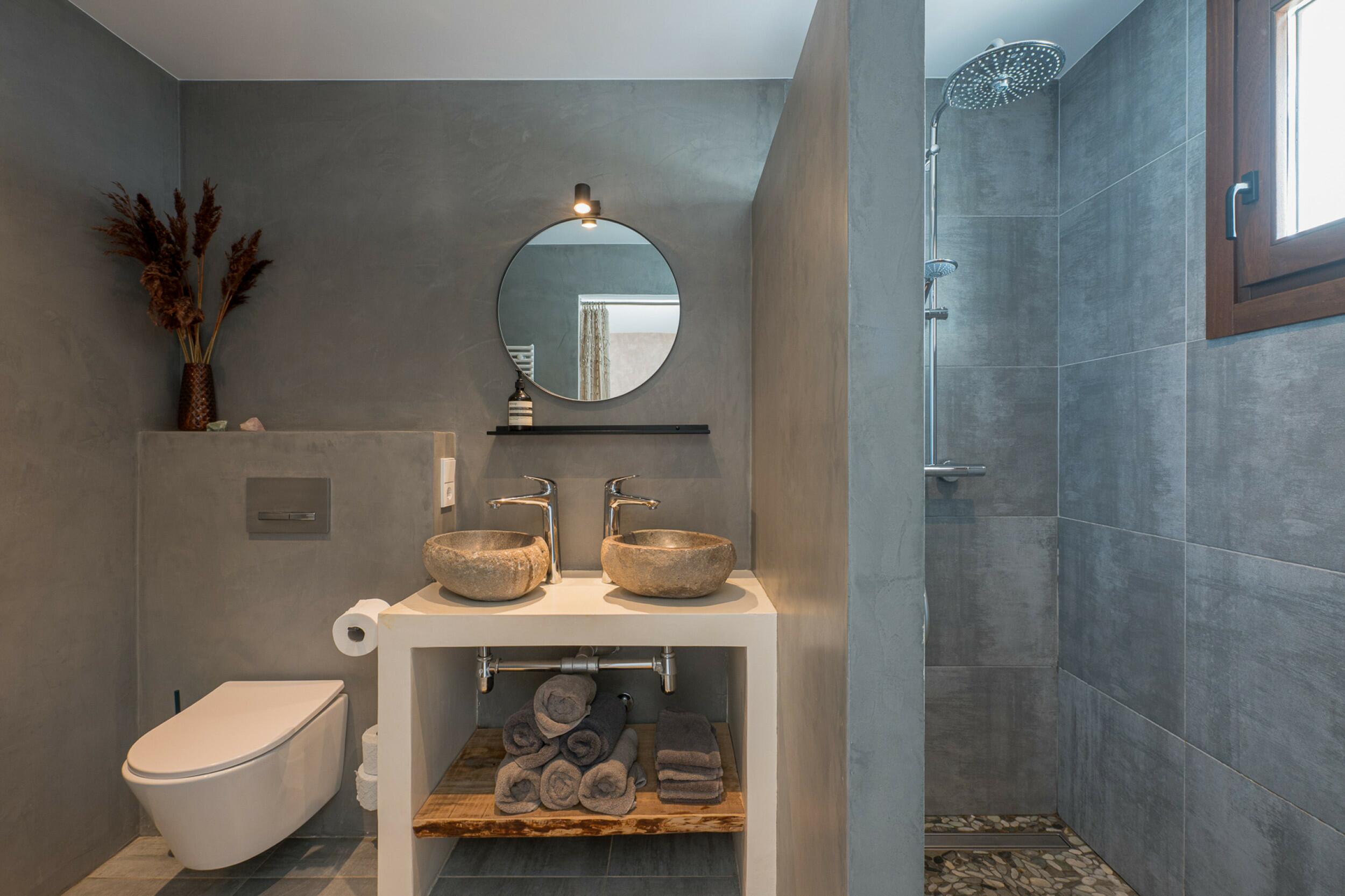 Auf der Hauptebene finden wir eine Eingangshalle, eine Gästetoilette, das Hauptwohnzimmer mit Kamin und Zugang zur vorderen Terrasse, das Esszimmer mit altem Brotbackofen und Zugang zu einer seitlichen Terrasse, die mit einem Sommer-Esszimmer und einem Grill ausgestattet ist, eine voll ausgestattete Küche mit direktem Zugang nach draußen, das Hauptschlafzimmer mit eigenem Duschbad und ein weiteres Schlafzimmer mit zwei Einzelbetten. Im Obergeschoss befindet sich ein drittes Schlafzimmer mit eigenem Duschbad.
