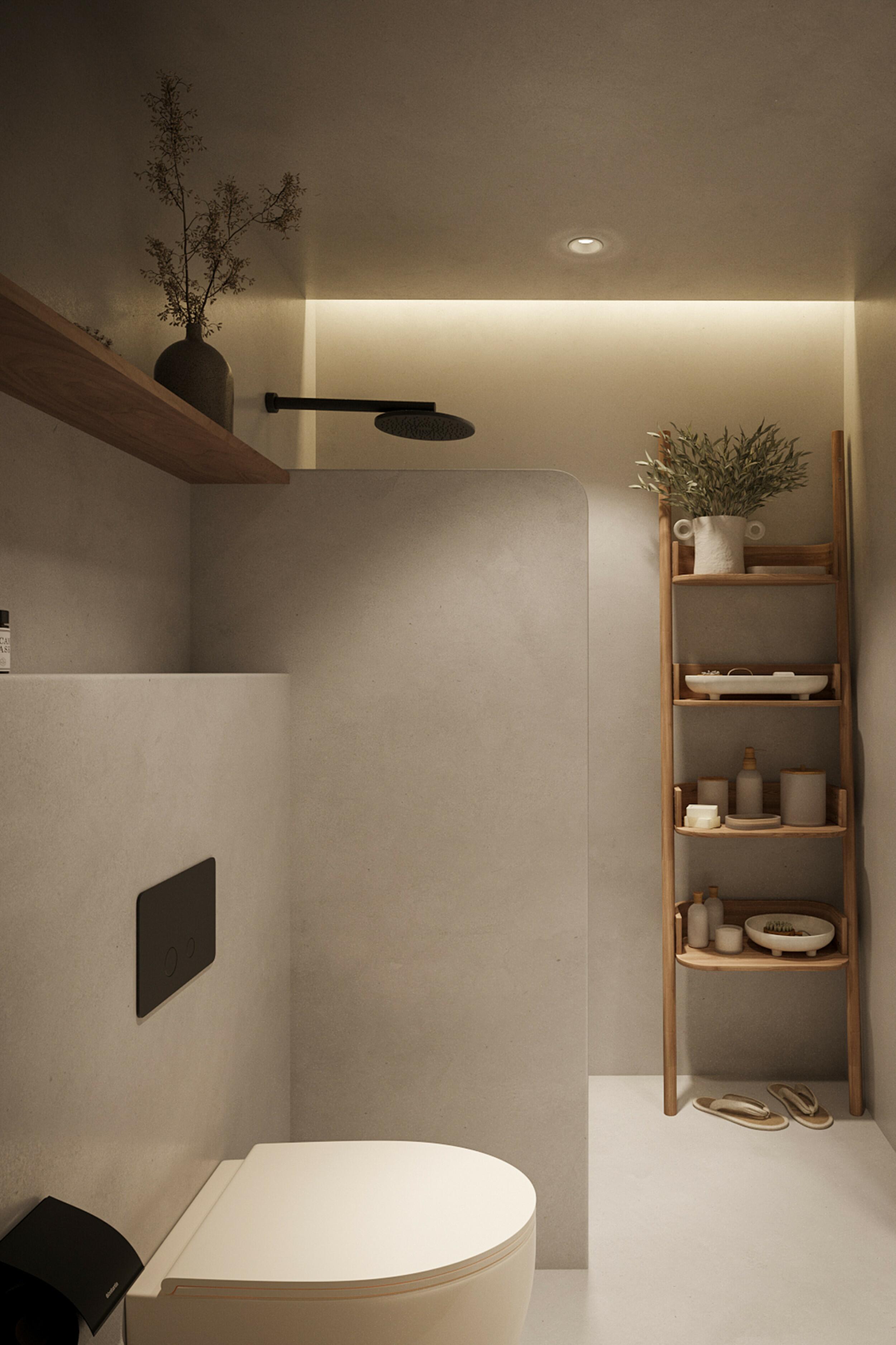 Große Schiebetüren aus Glas öffnen sich direkt vom Hauptwohnbereich auf eine private Terrasse. Obwohl kompakt in der Grundfläche, ist die Terrasse geschickt so gestaltet, dass sie sich großzügig anfühlt und über integrierte Lounge-Sitzgelegenheiten und weiche Bepflanzung verfügt, die die Grenzen zwischen Innen- und Außenbereich verwischen. Bewohner des Gebäudes genießen außerdem Zugang zu einem gemeinsamen Pool und einem Sonnenbereich.