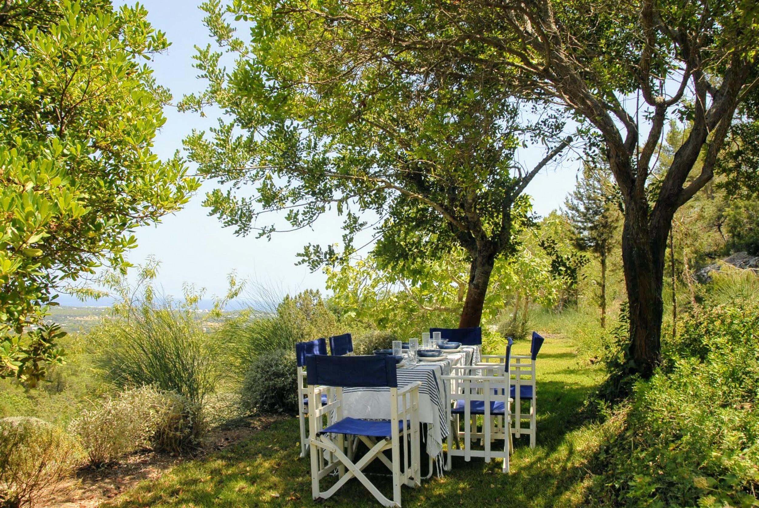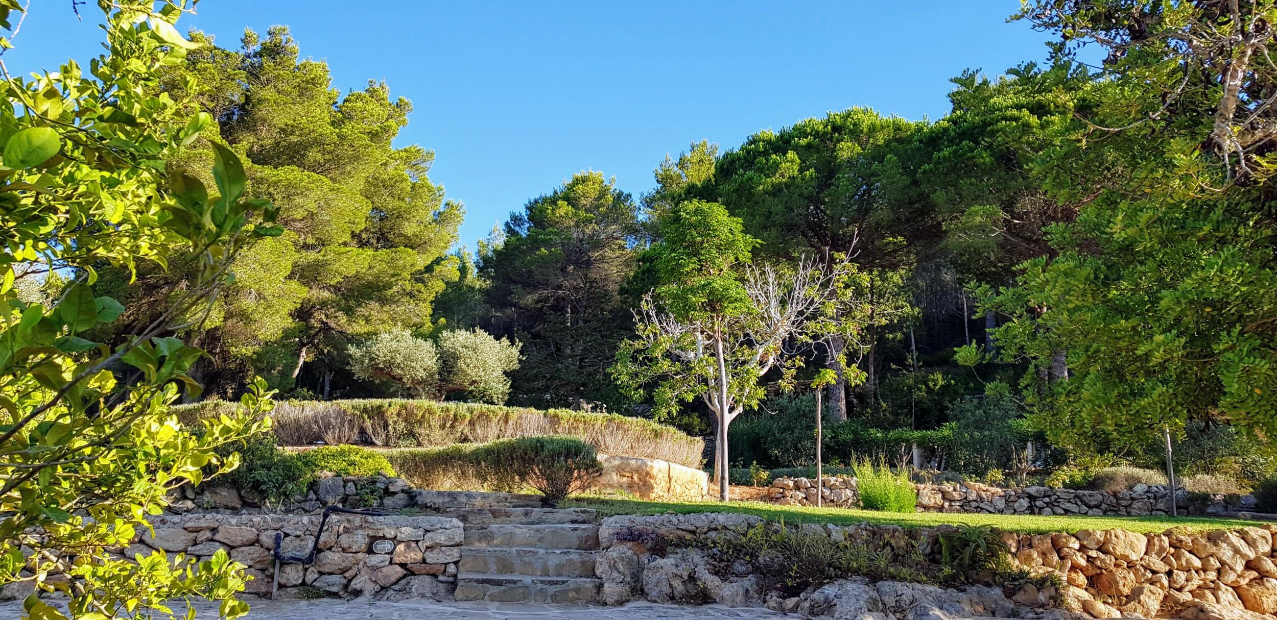 Mit über 34.000 m² Garten- und Naturgelände bietet Can Altos vielfältige Outdoor-Erlebnisse. Mehrere Terrassen erstrecken sich entlang des Hangs und schaffen Orte für Yoga am Morgen, Mittagessen im Schatten oder Aperitifs im Abendlicht. Der grosse Pool mit Wasserfall und Gegenstromanlage liegt eingebettet zwischen Palmen und üppiger Vegetation. Ein idyllischer Teich und ein Tischtennisbereich sorgen für zusätzliche Abwechslung. Abends wird die überdachte Terrasse zum stimmungsvollen Open-Air-Dining-Bereich unter dem Sternenhimmel.