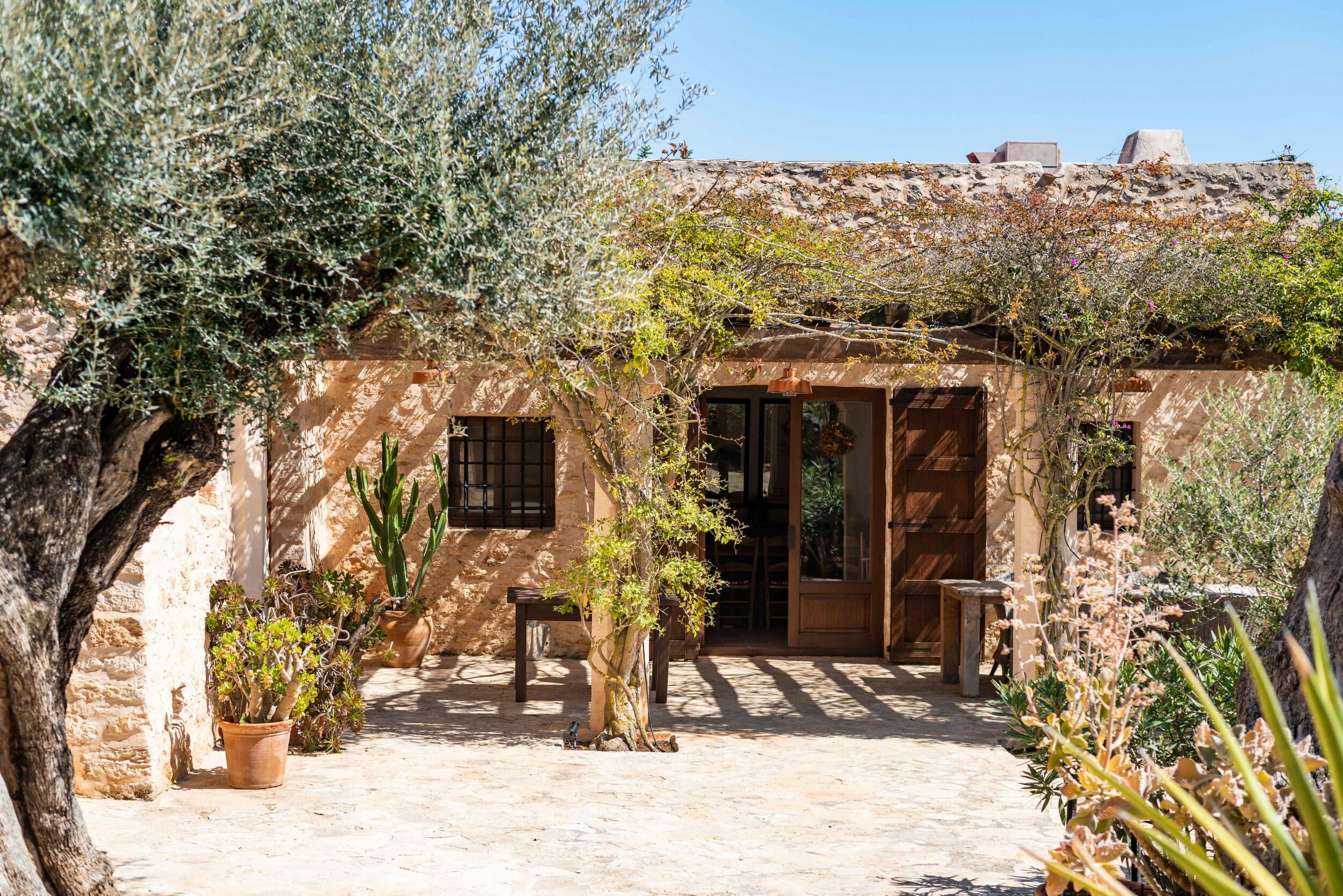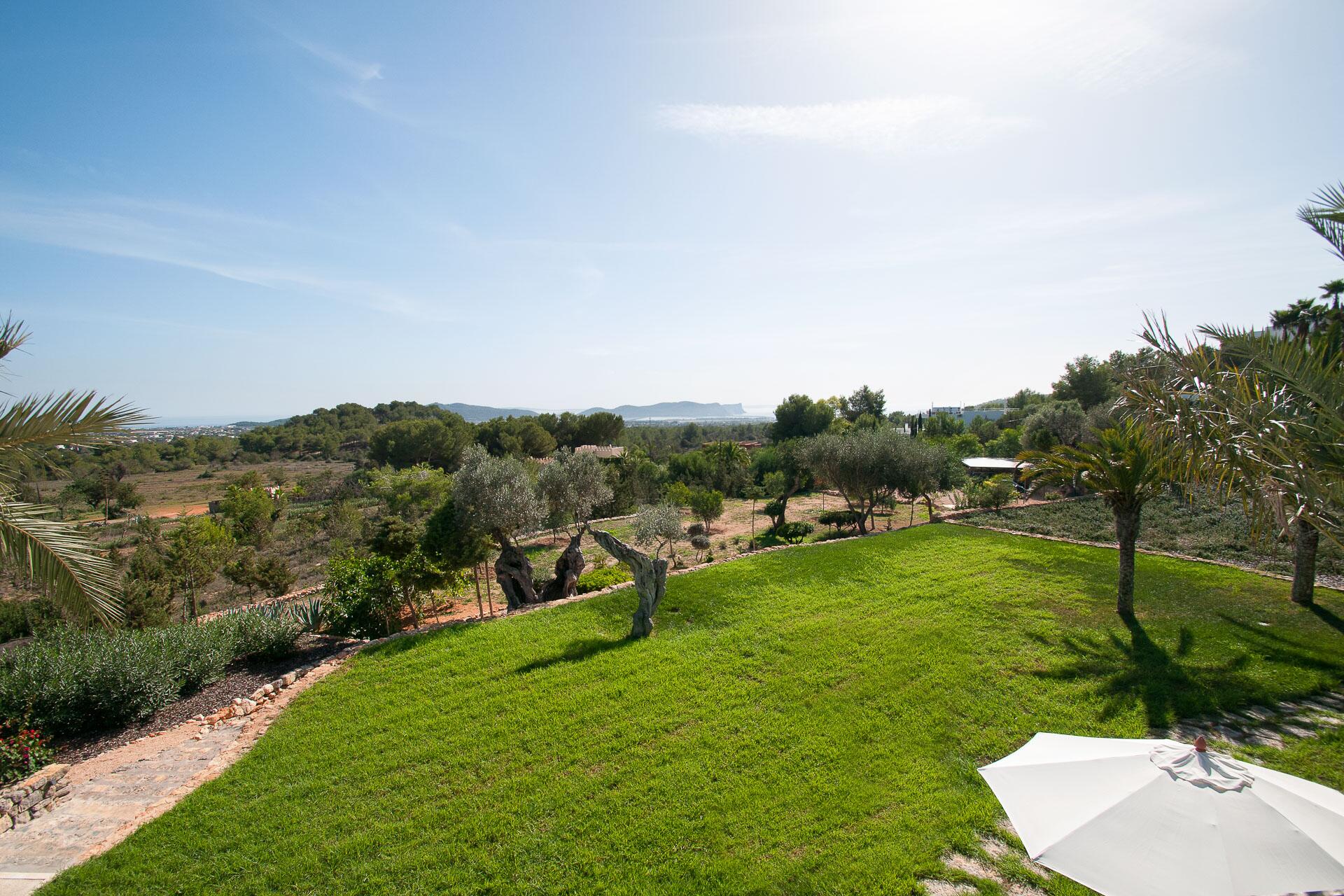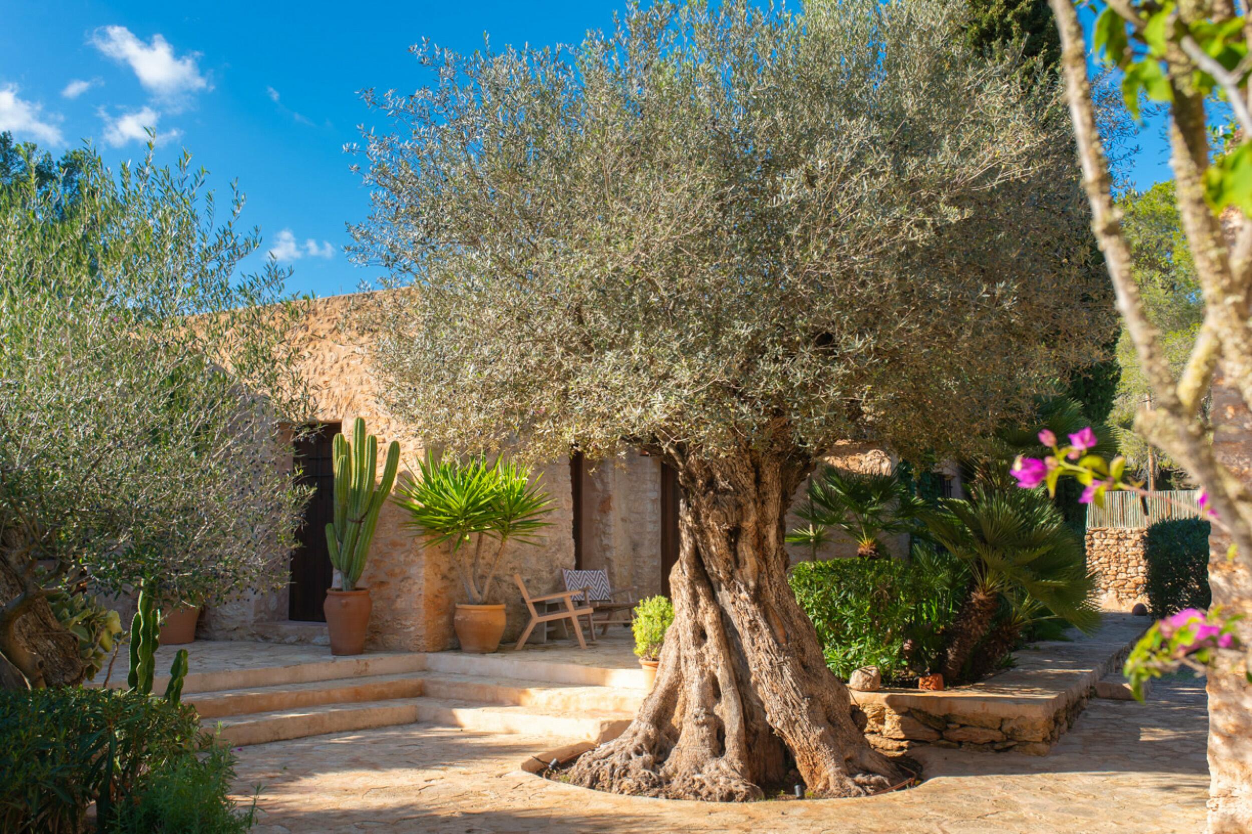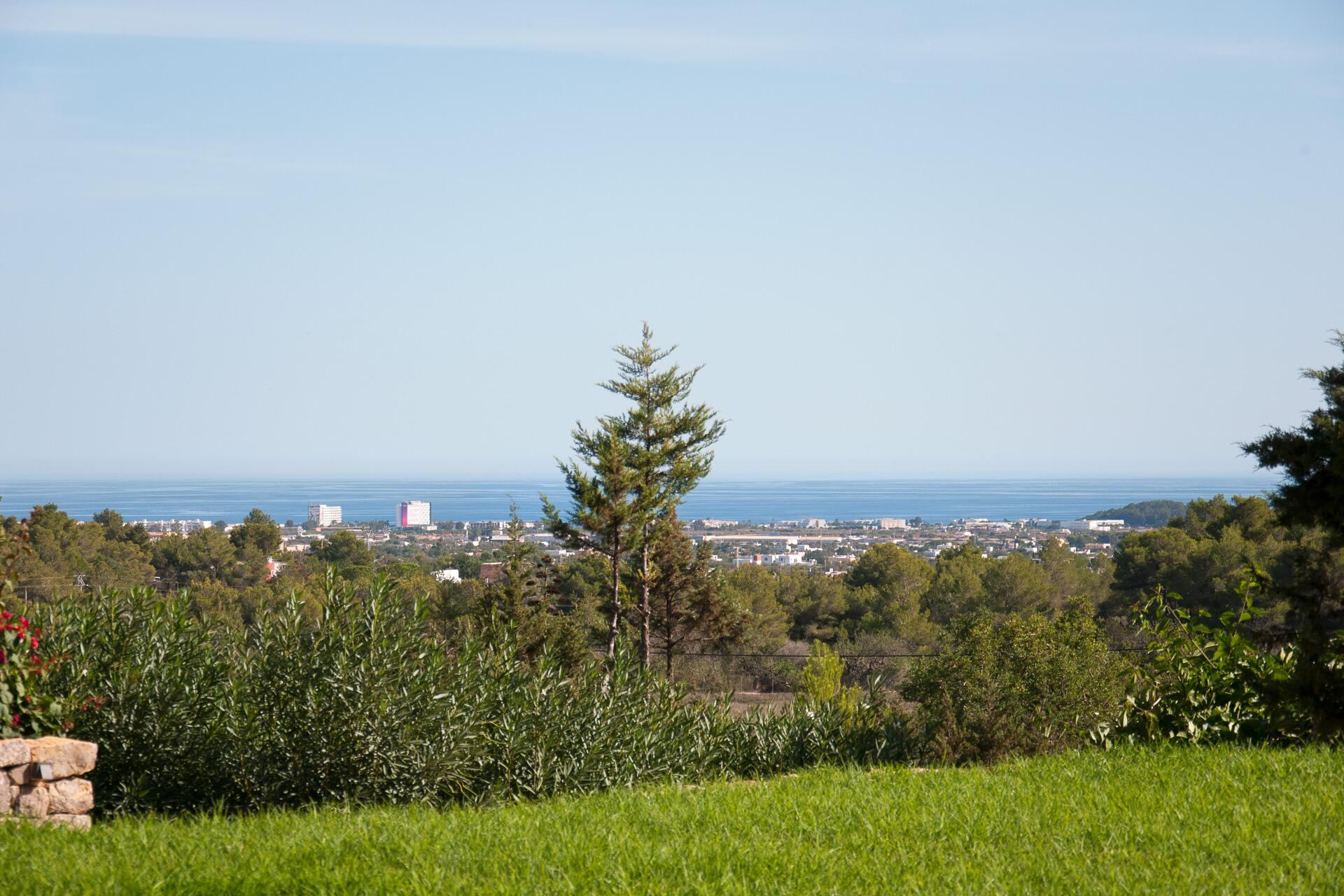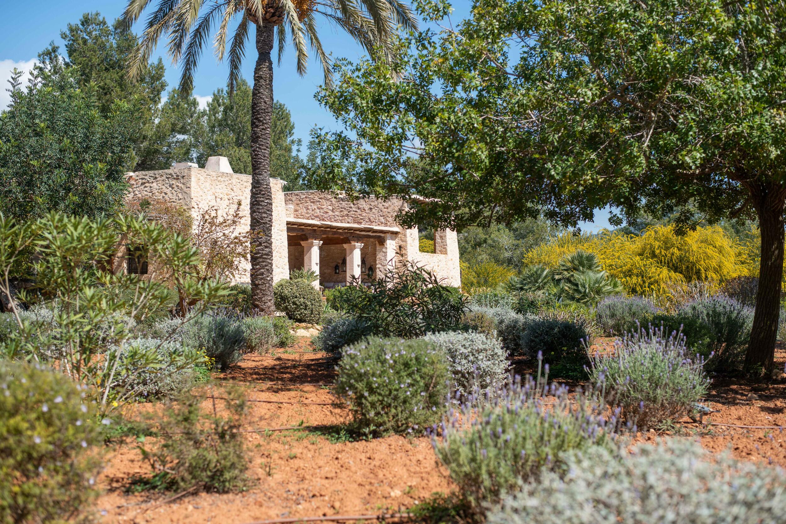 Schöne Villa in der Nähe von Es Cubells, mit Blick auf den Garten und die Landschaft.
