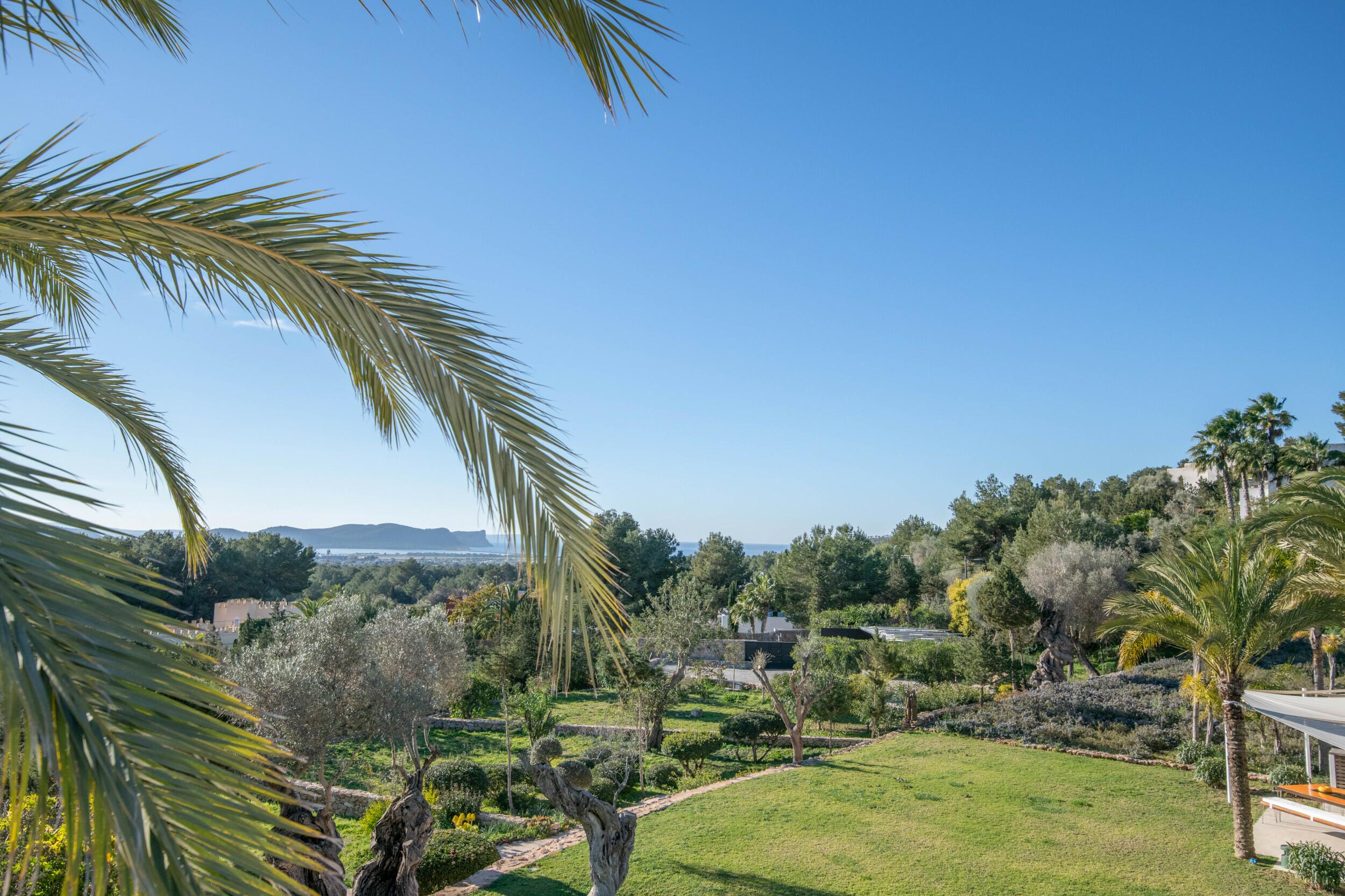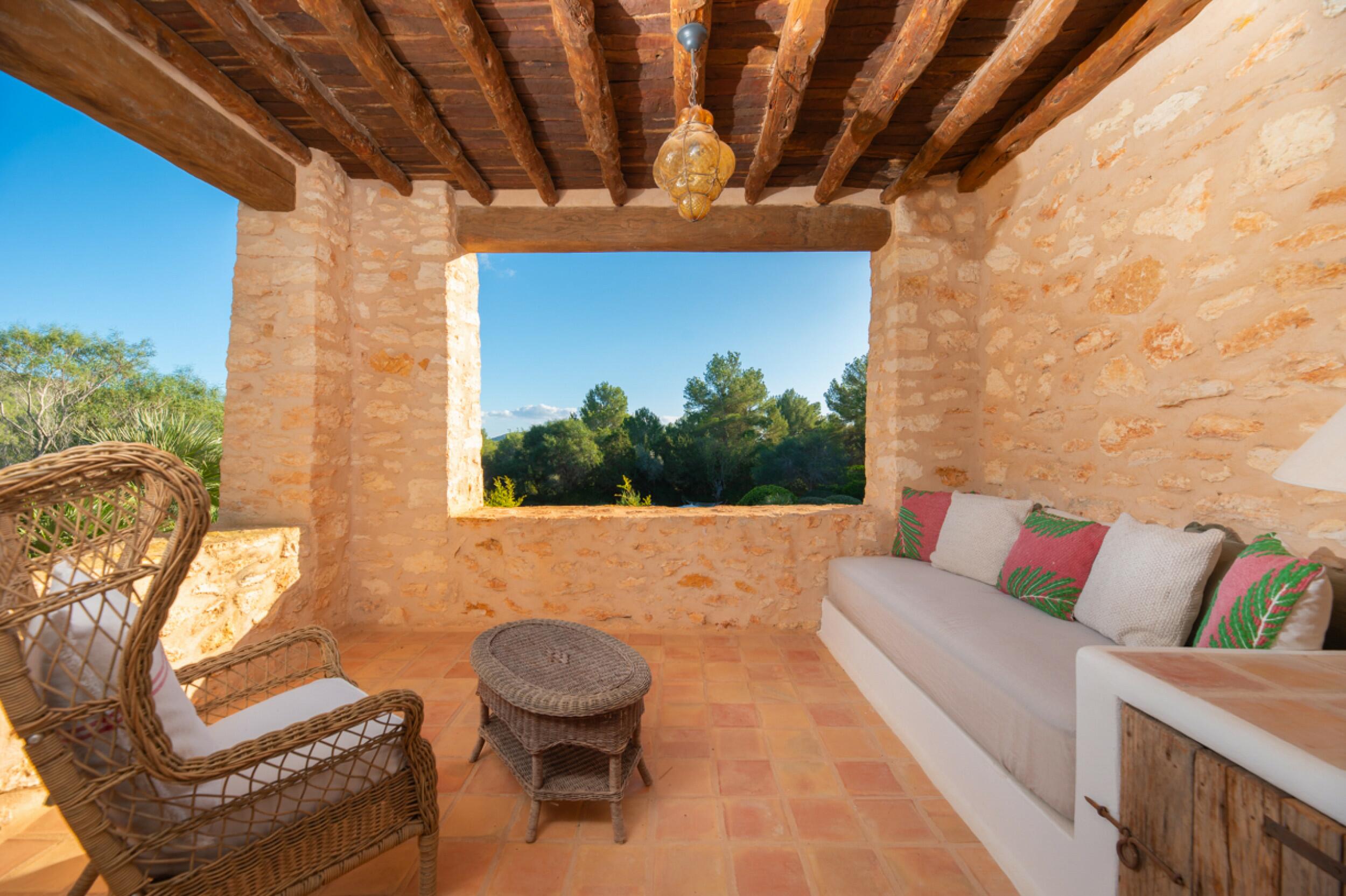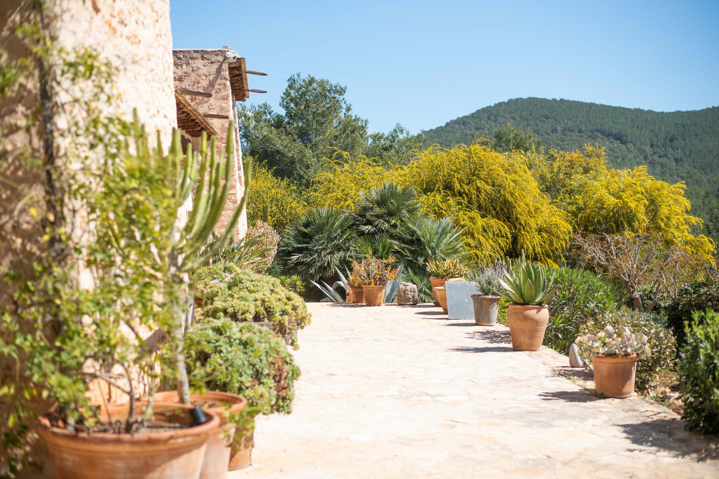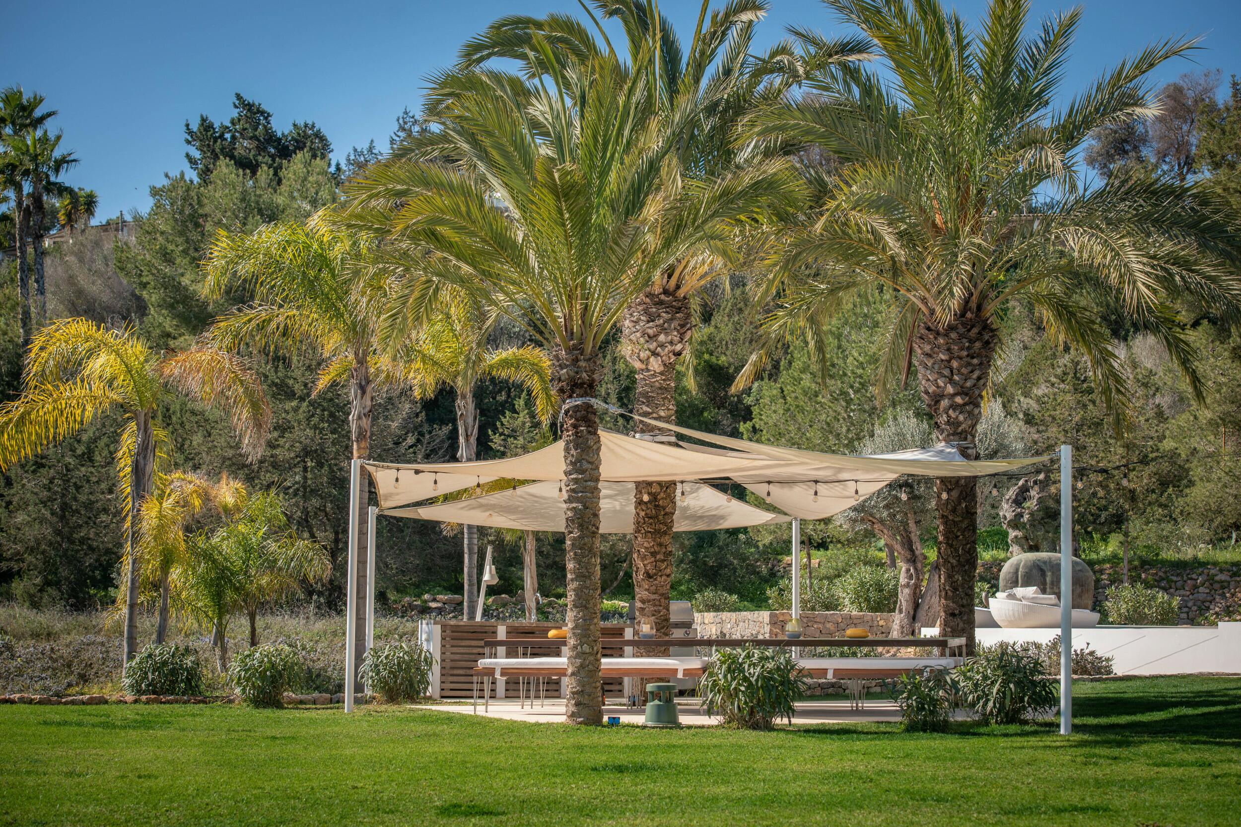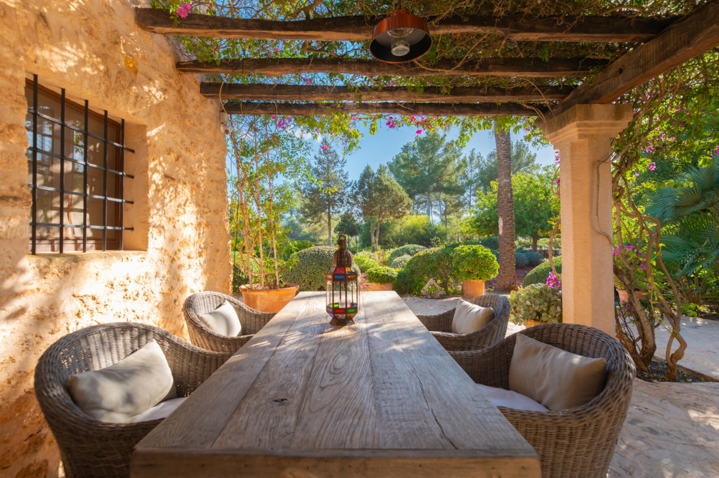 Schöne Villa in der Nähe von Es Cubells, mit Blick auf den Garten und die Landschaft.