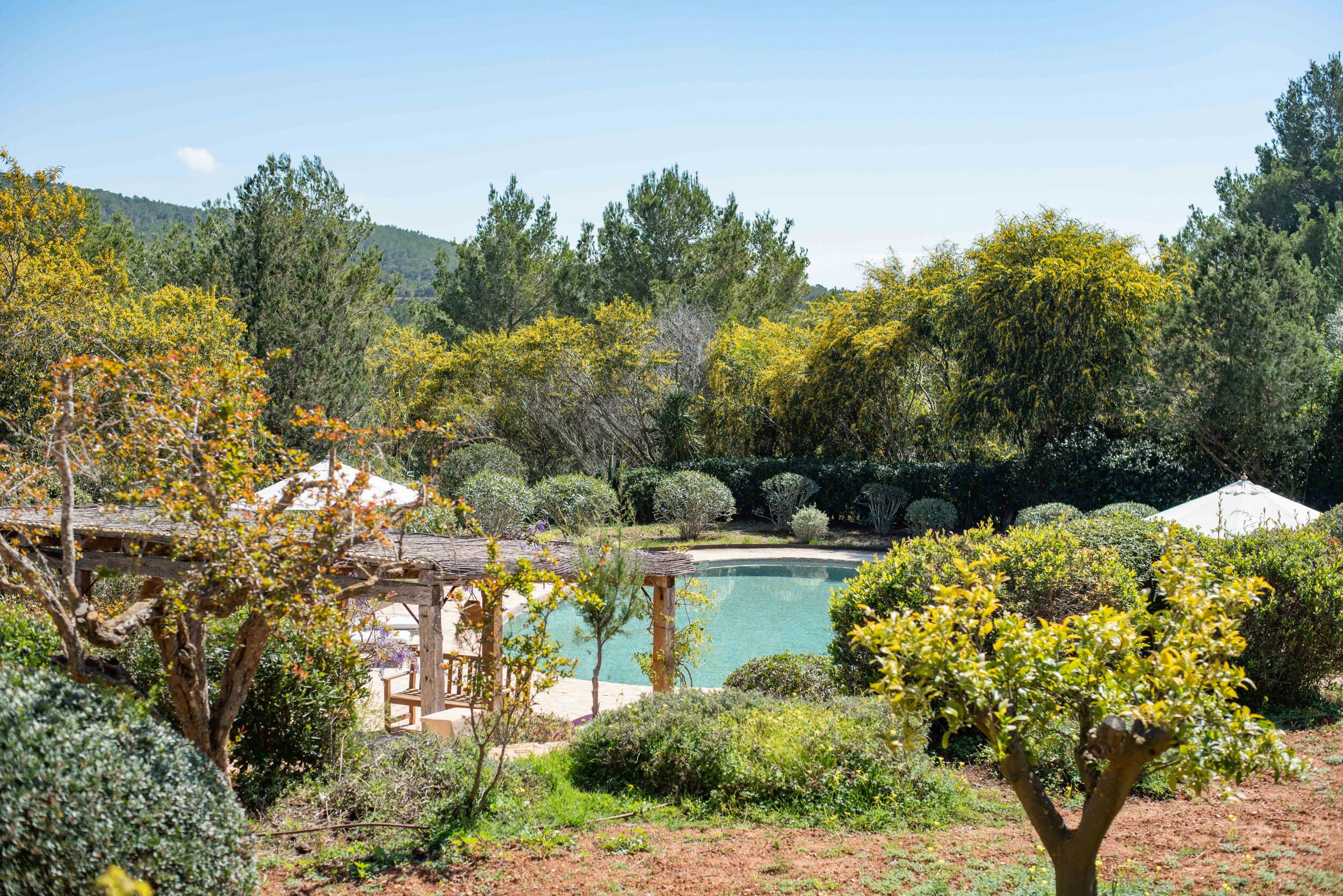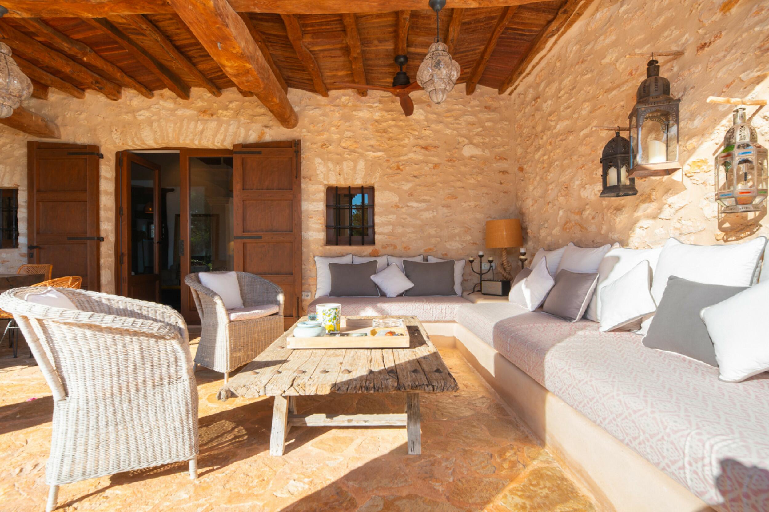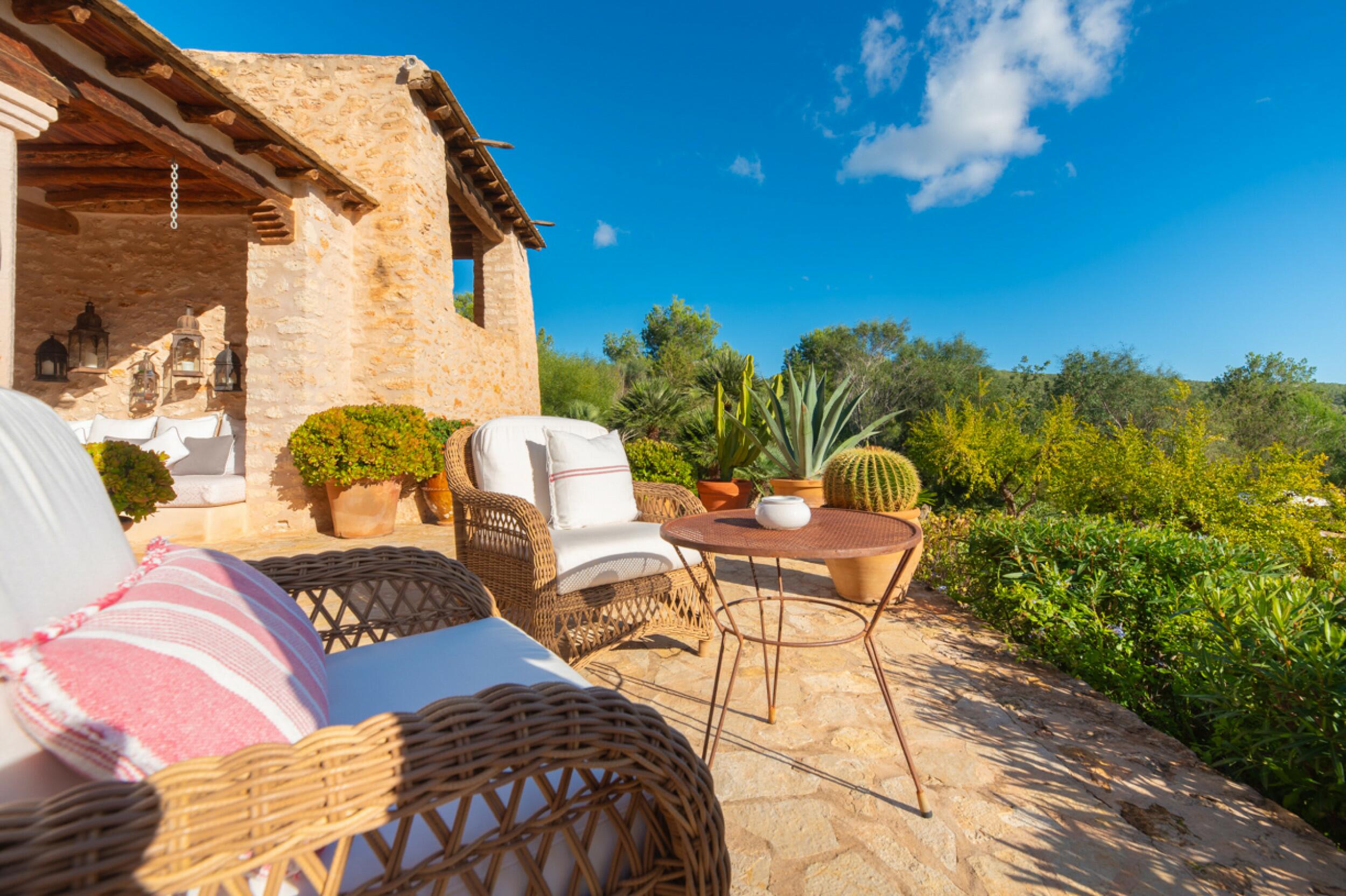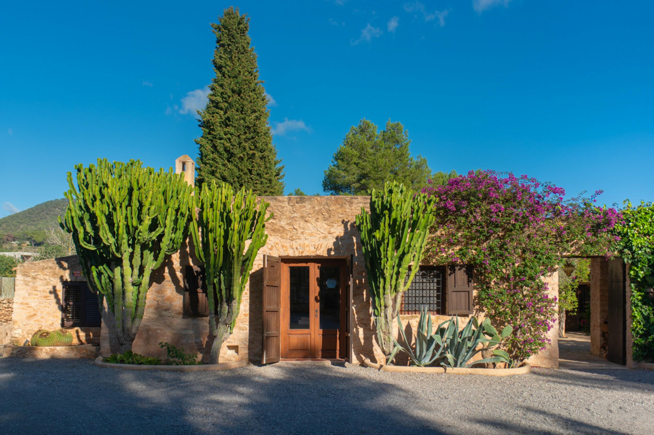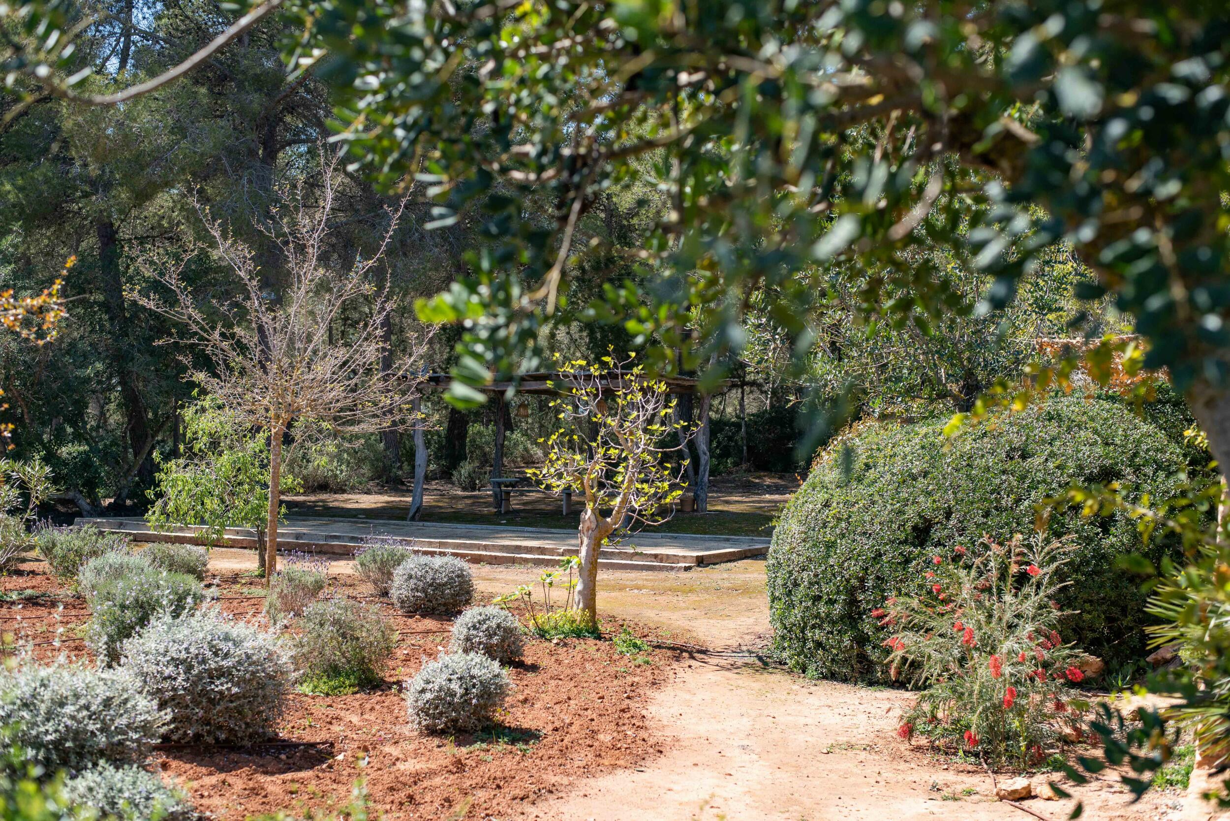 Schöne Villa in der Nähe von Es Cubells, mit Blick auf den Garten und die Landschaft.