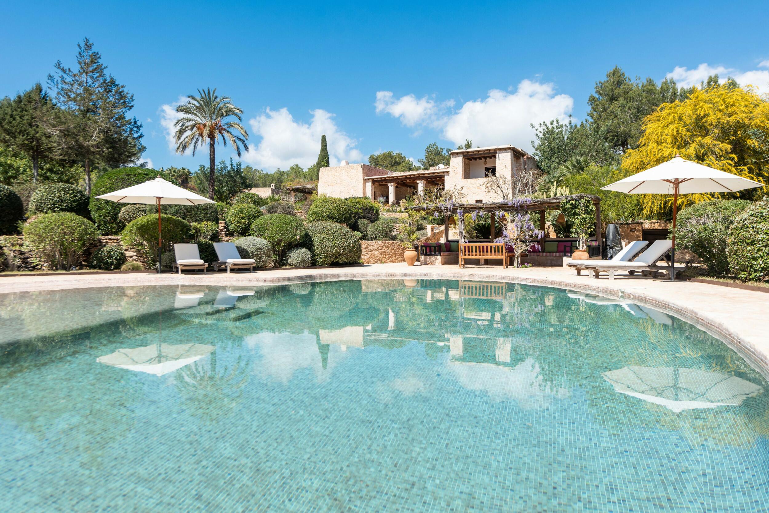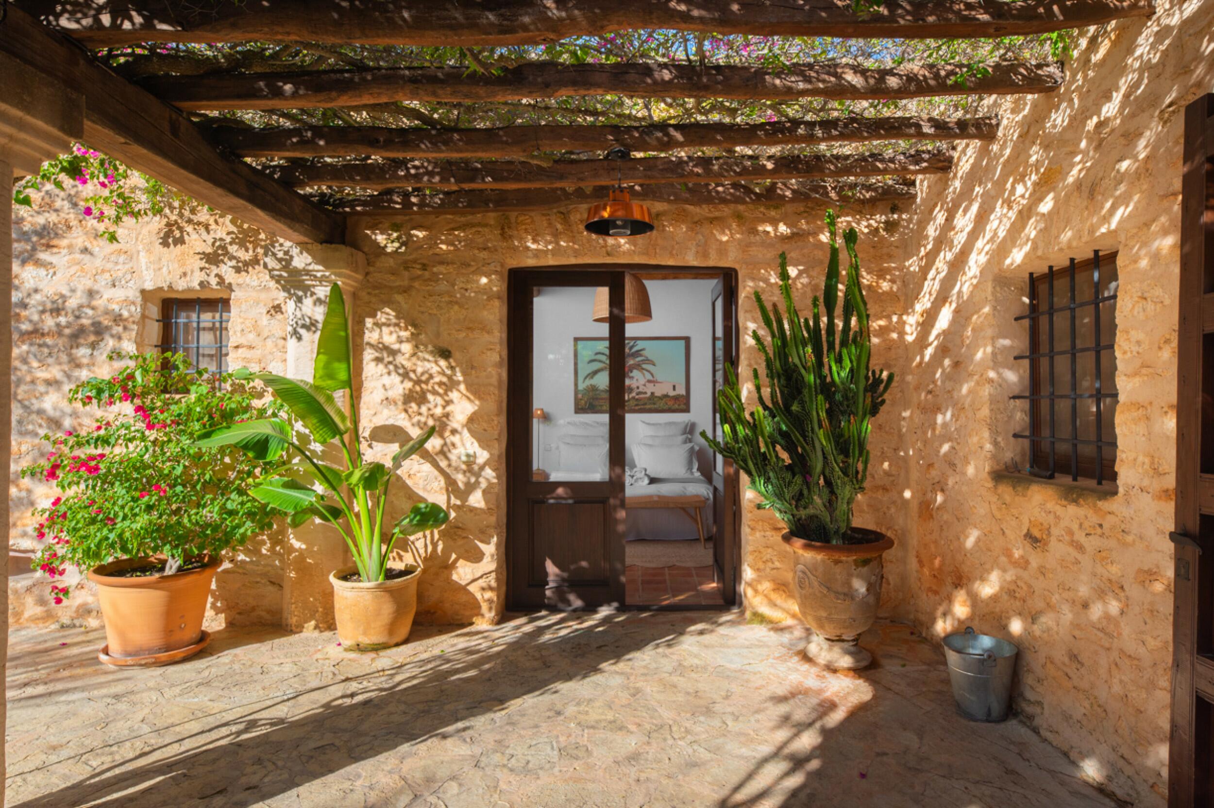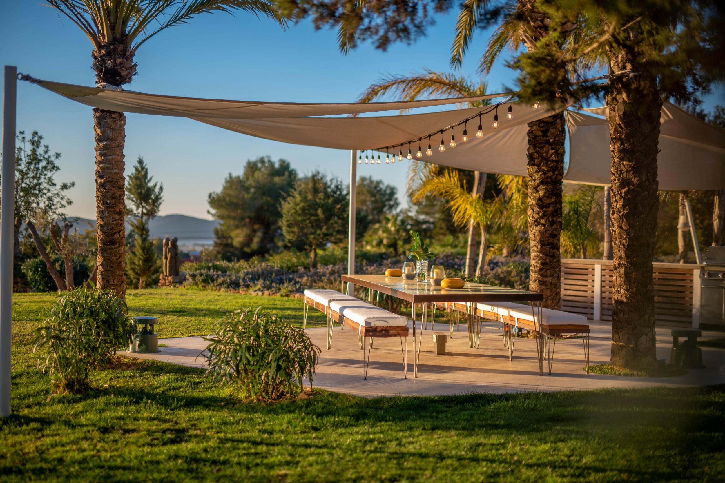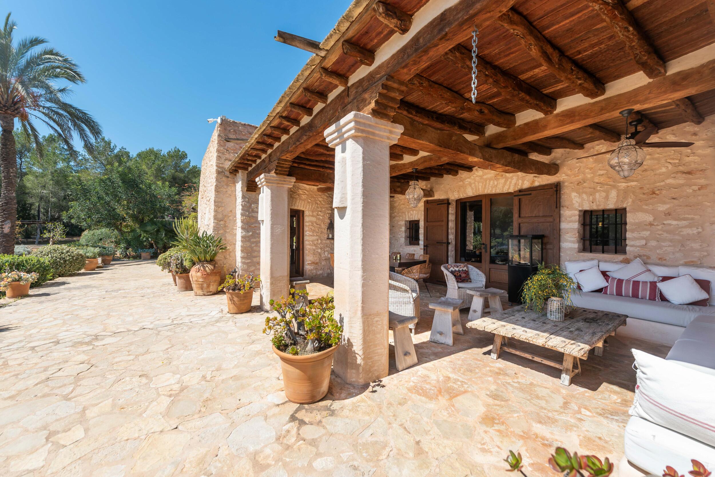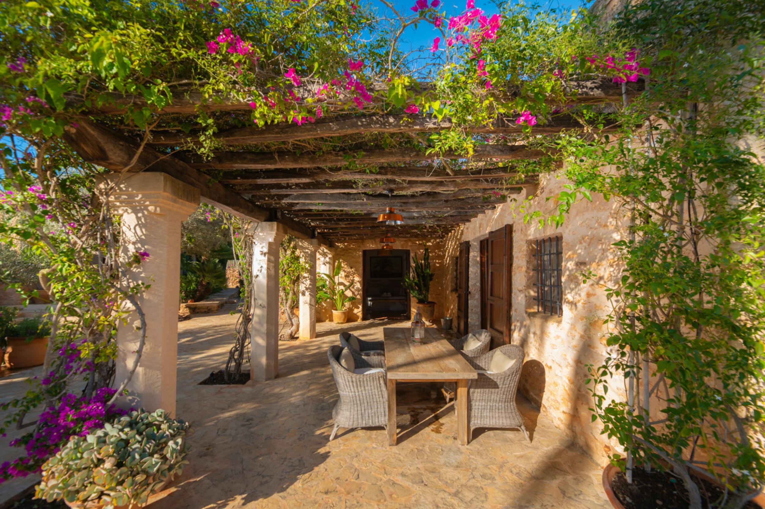 Schöne Villa in der Nähe von Es Cubells, mit Blick auf den Garten und die Landschaft.