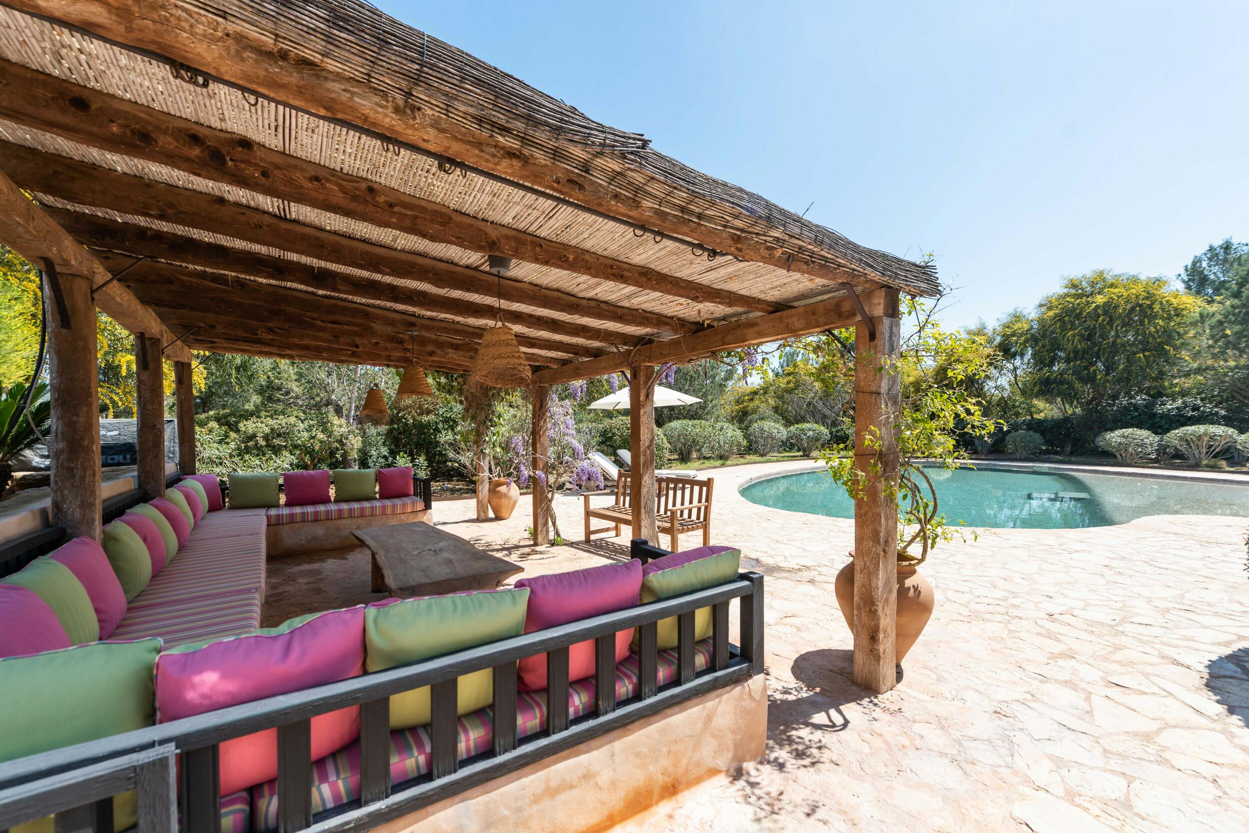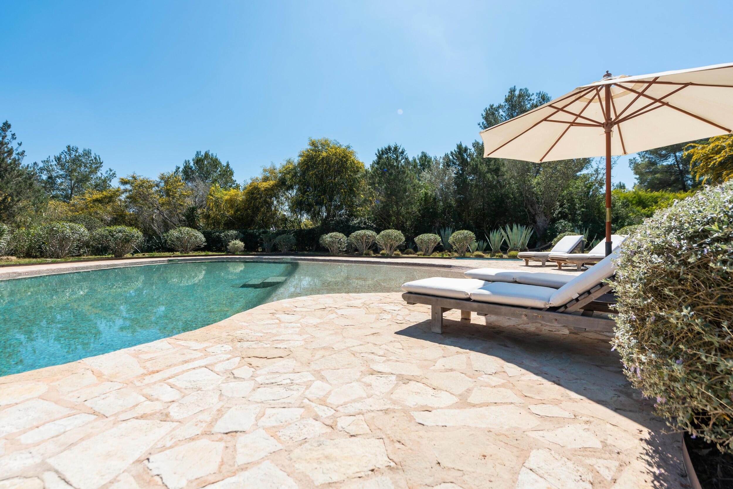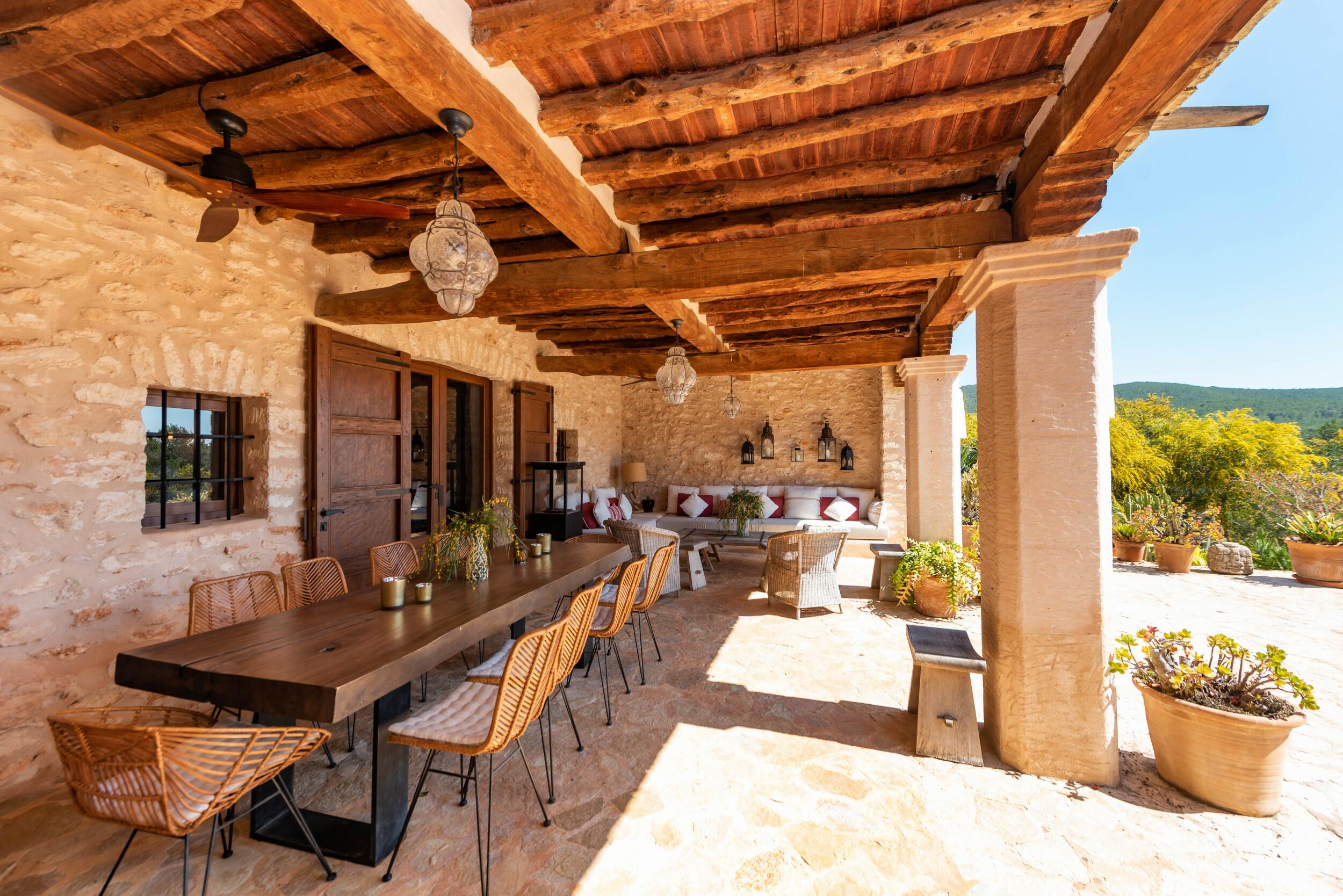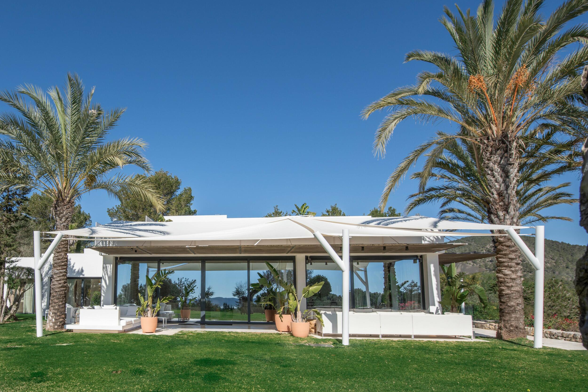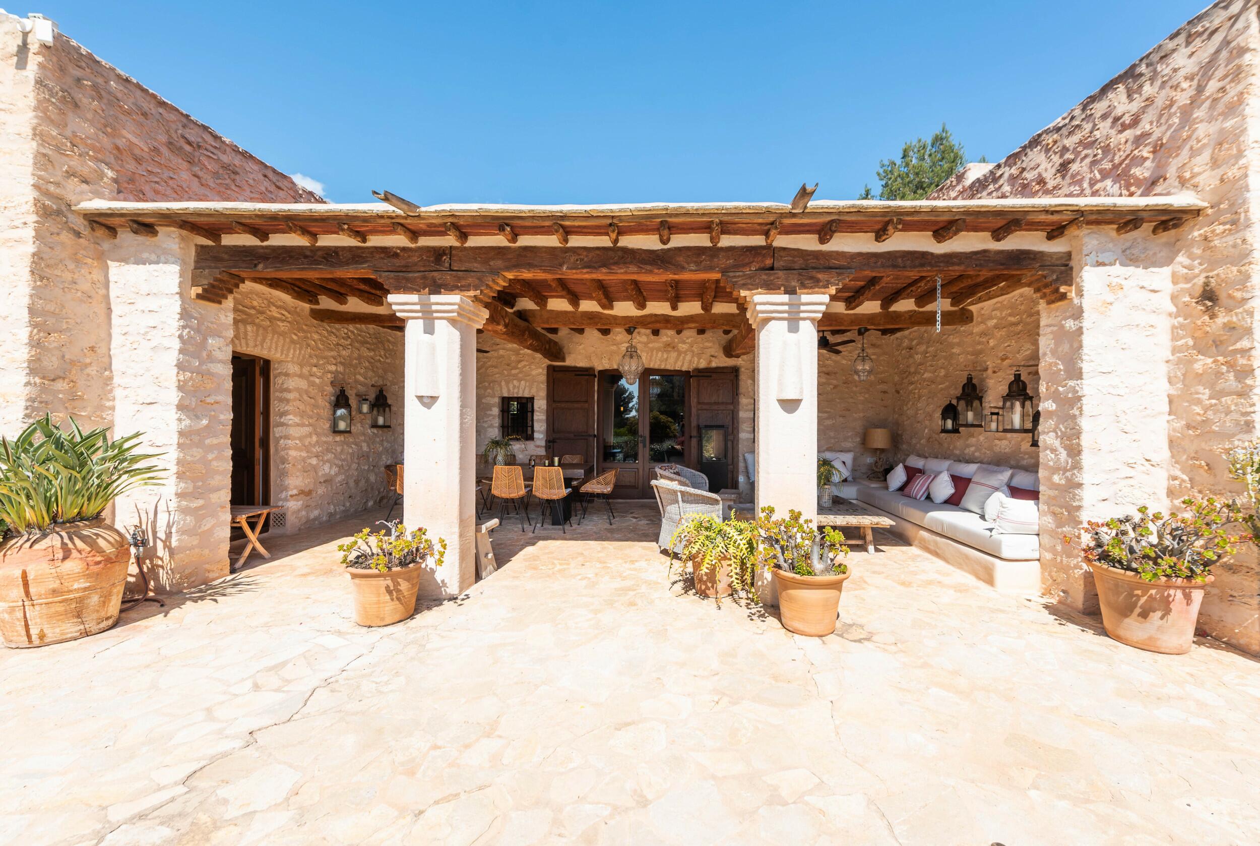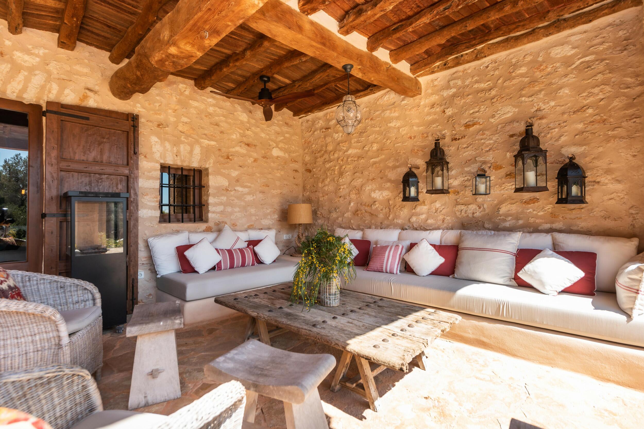 Schöne Villa in der Nähe von Es Cubells, mit Blick auf den Garten und die Landschaft.