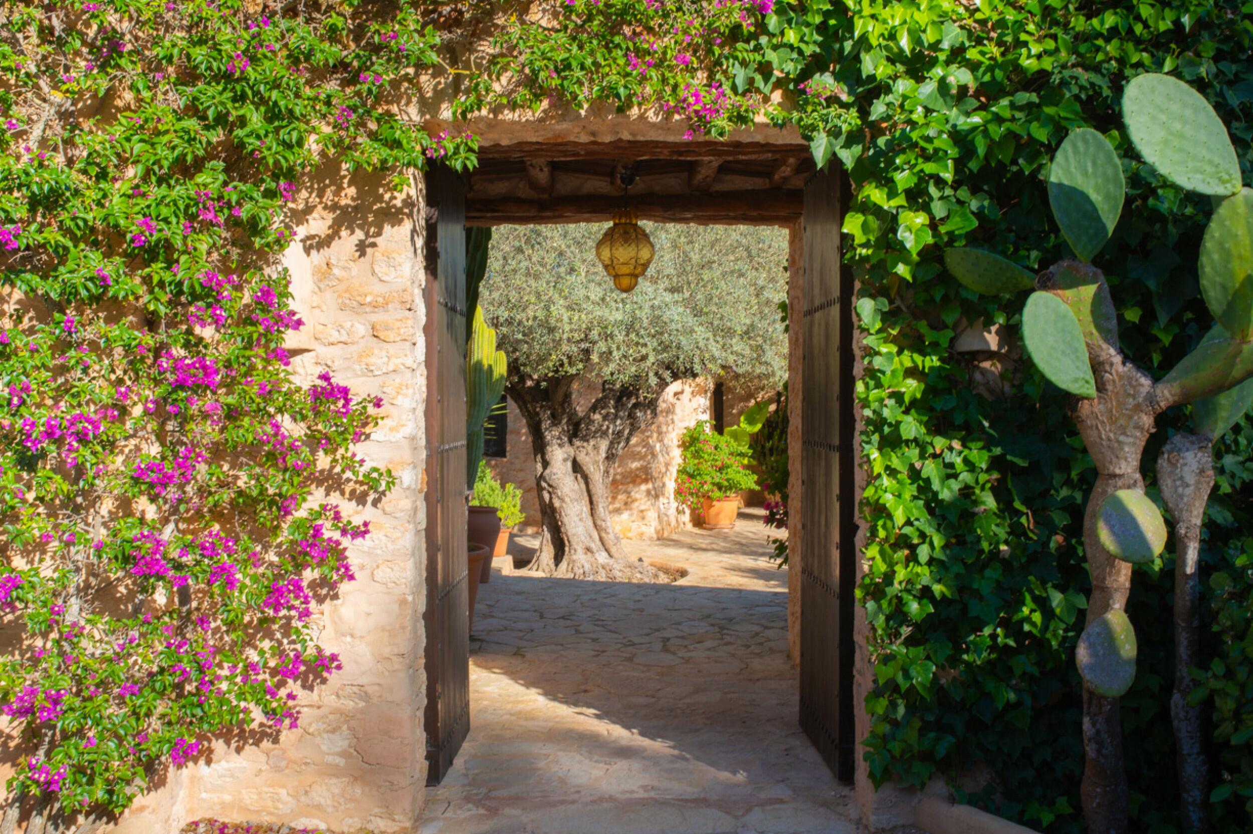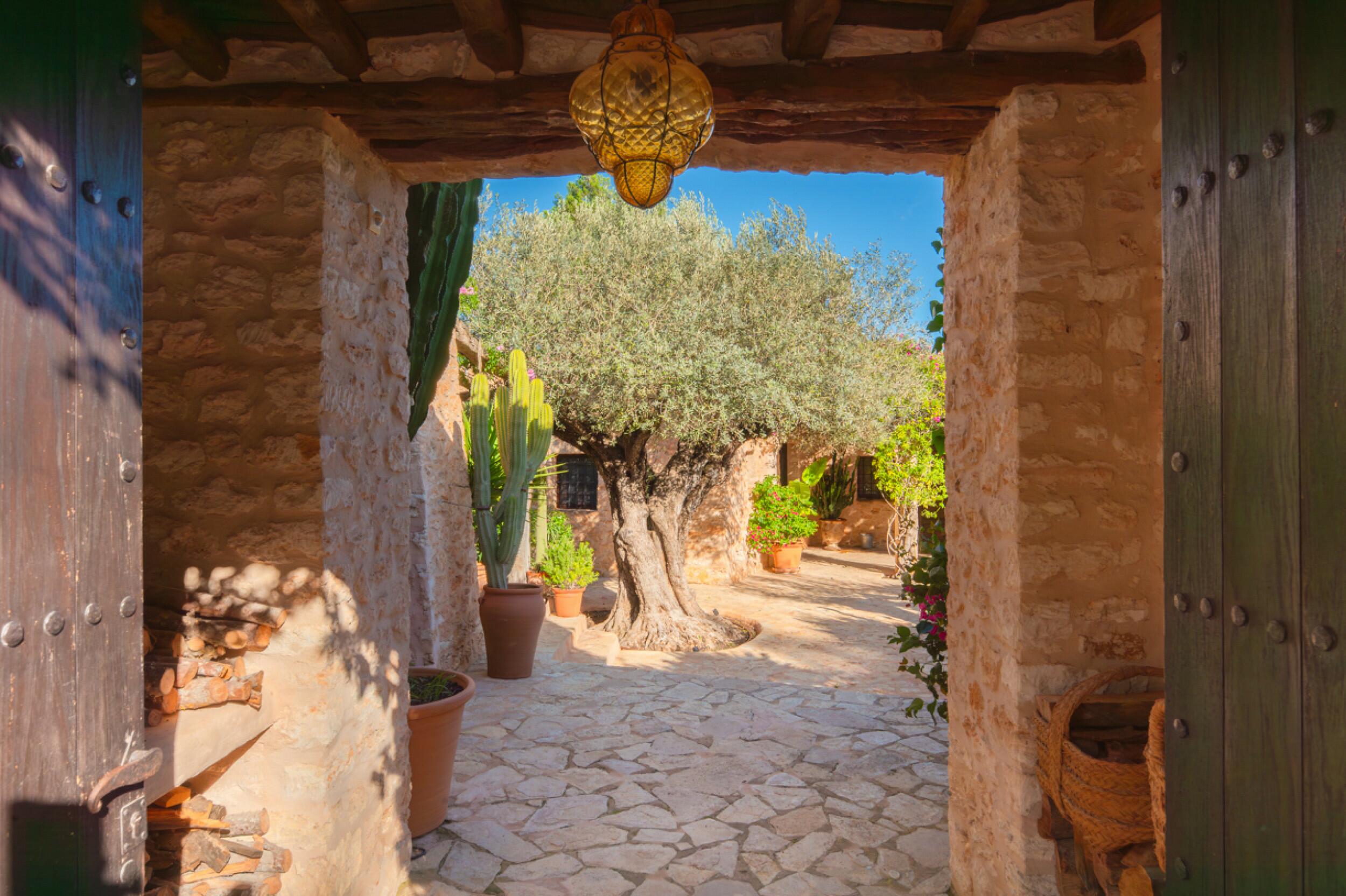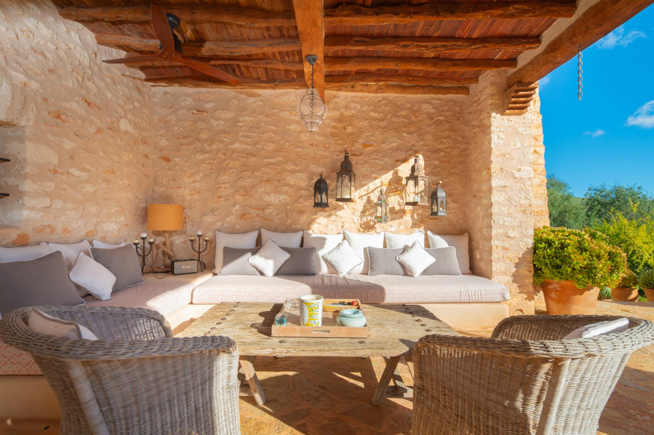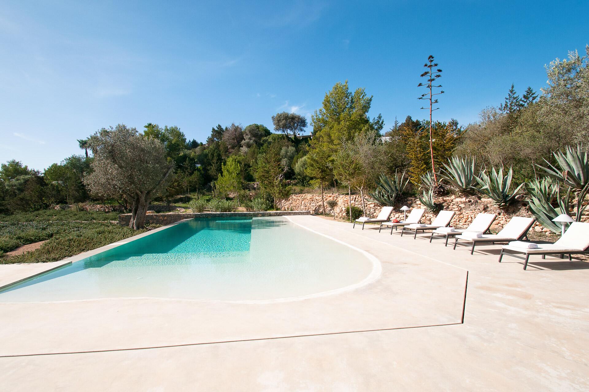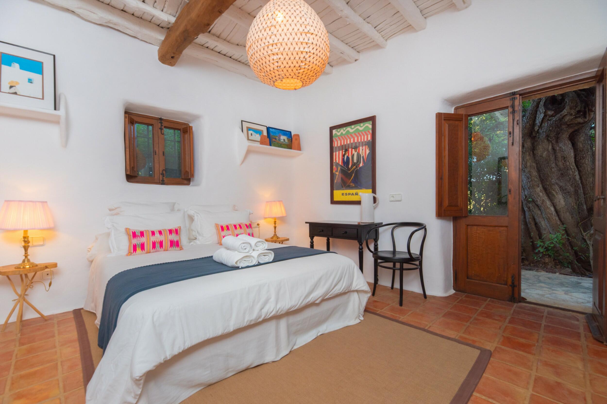 Schöne Villa in der Nähe von Es Cubells, mit Blick auf den Garten und die Landschaft.