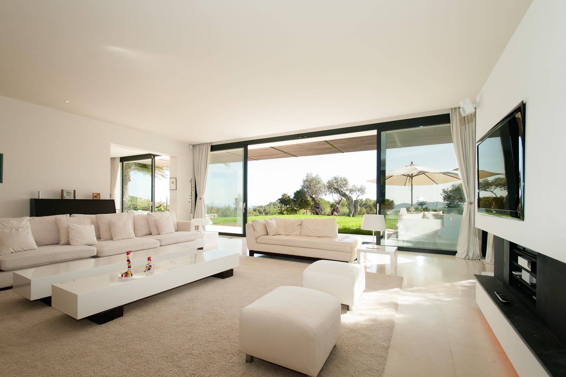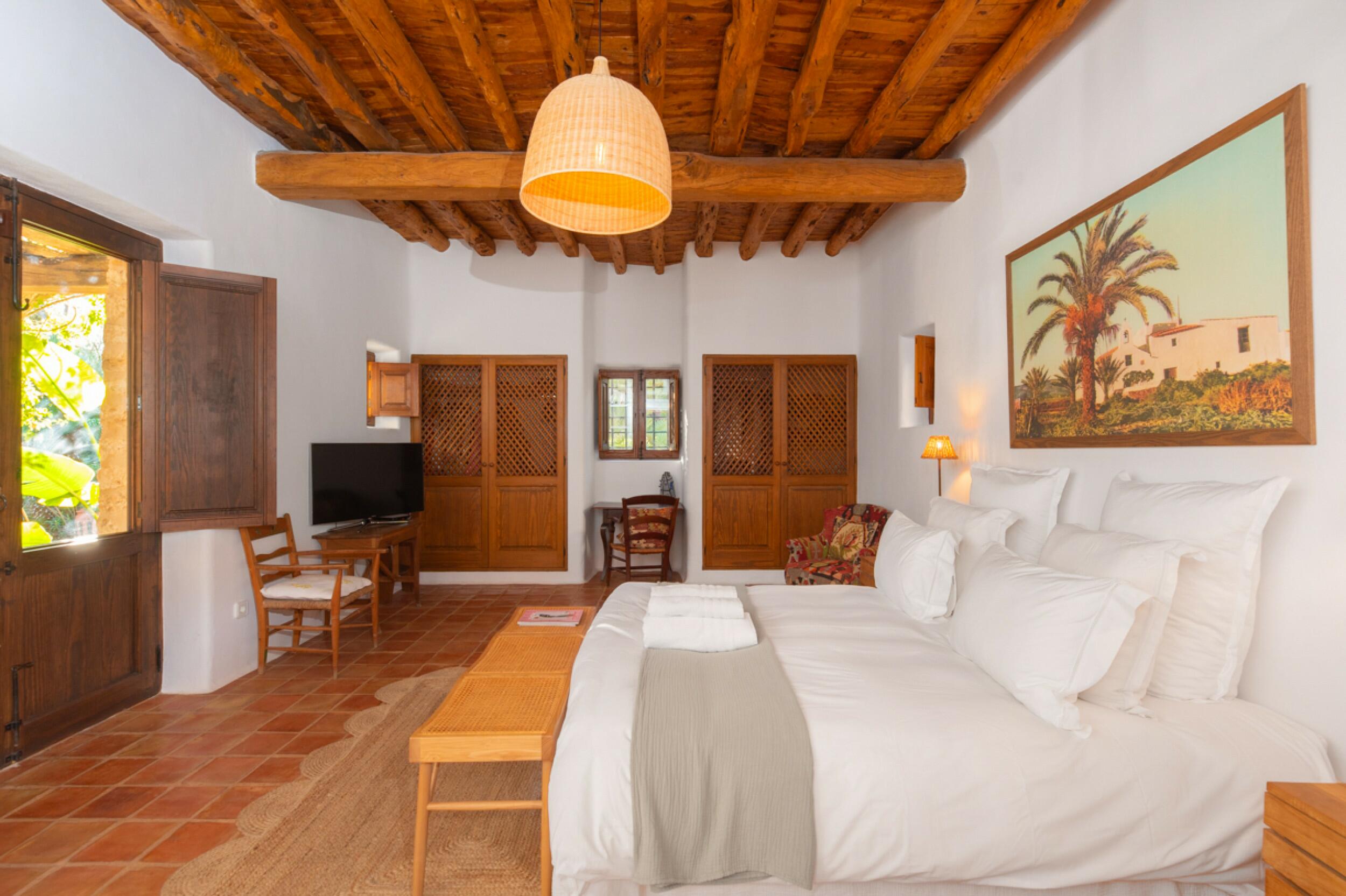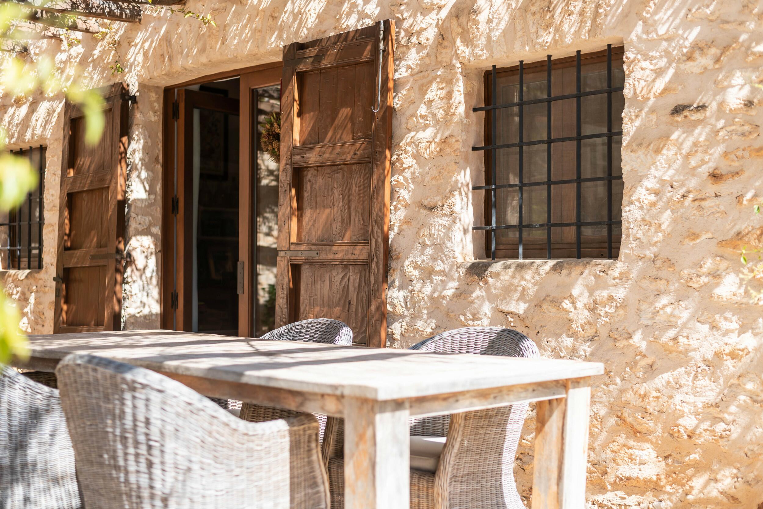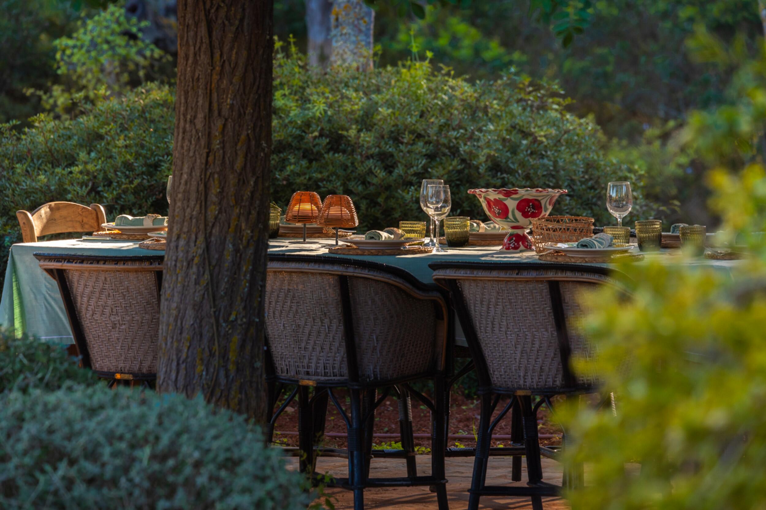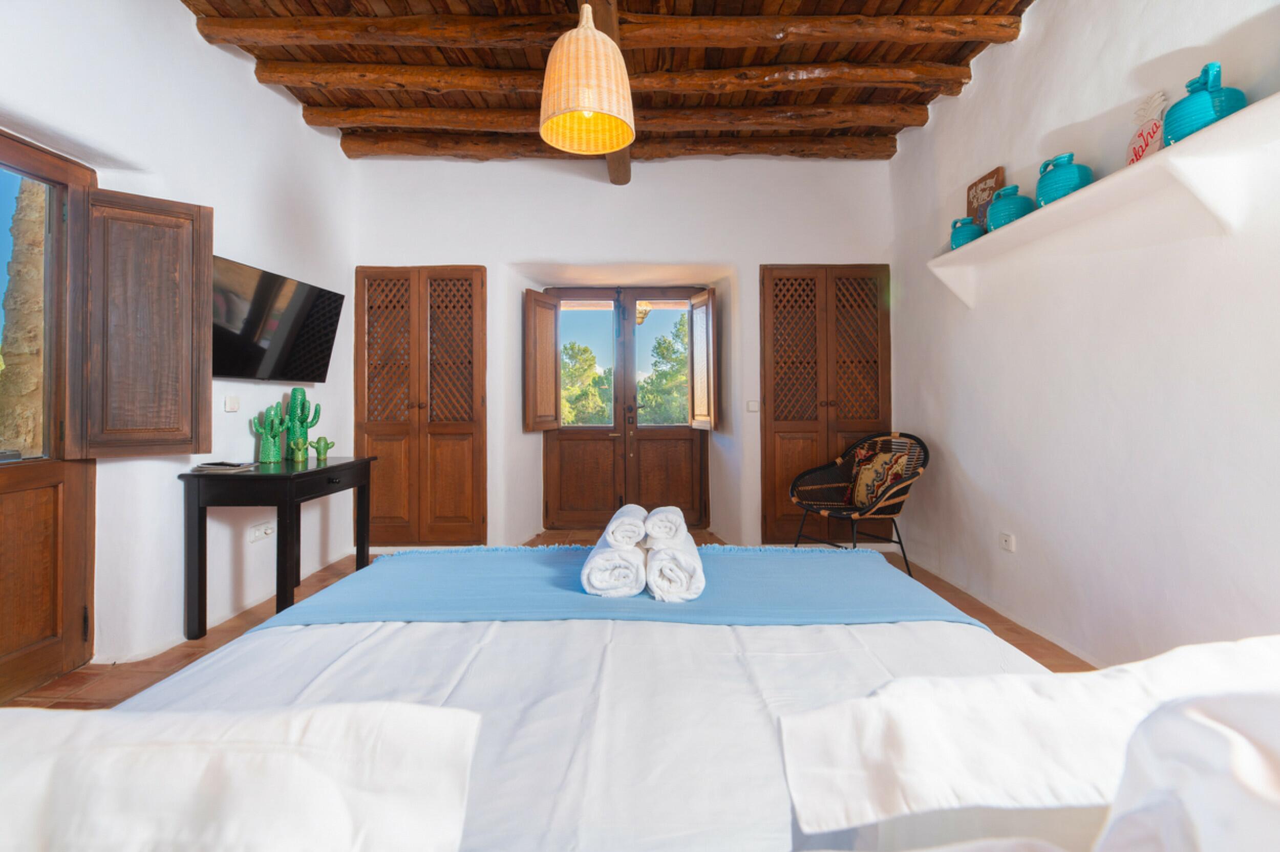 Schöne Villa in der Nähe von Es Cubells, mit Blick auf den Garten und die Landschaft.