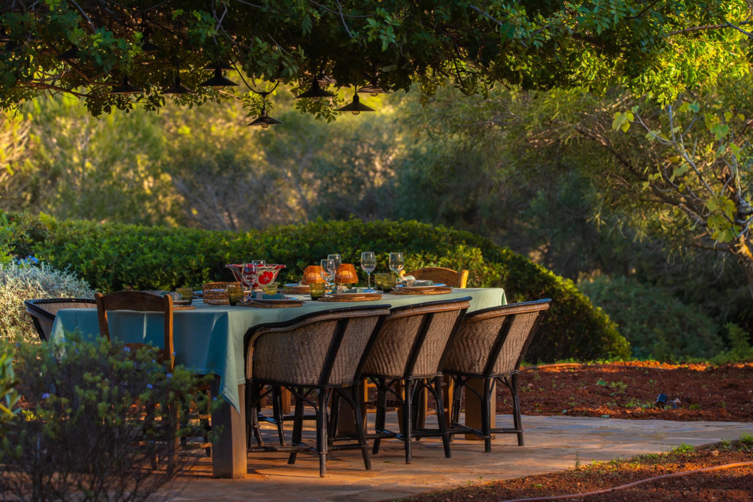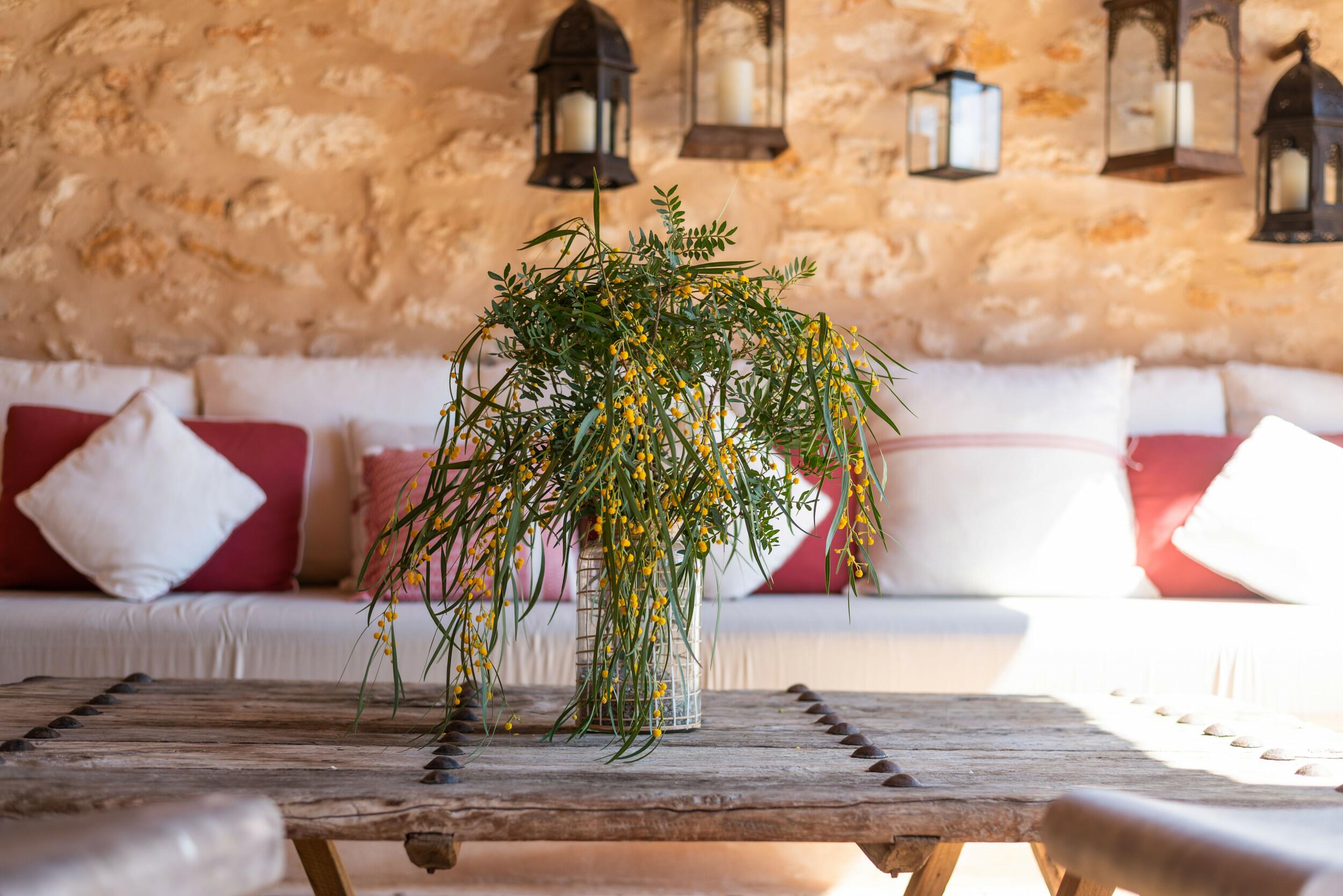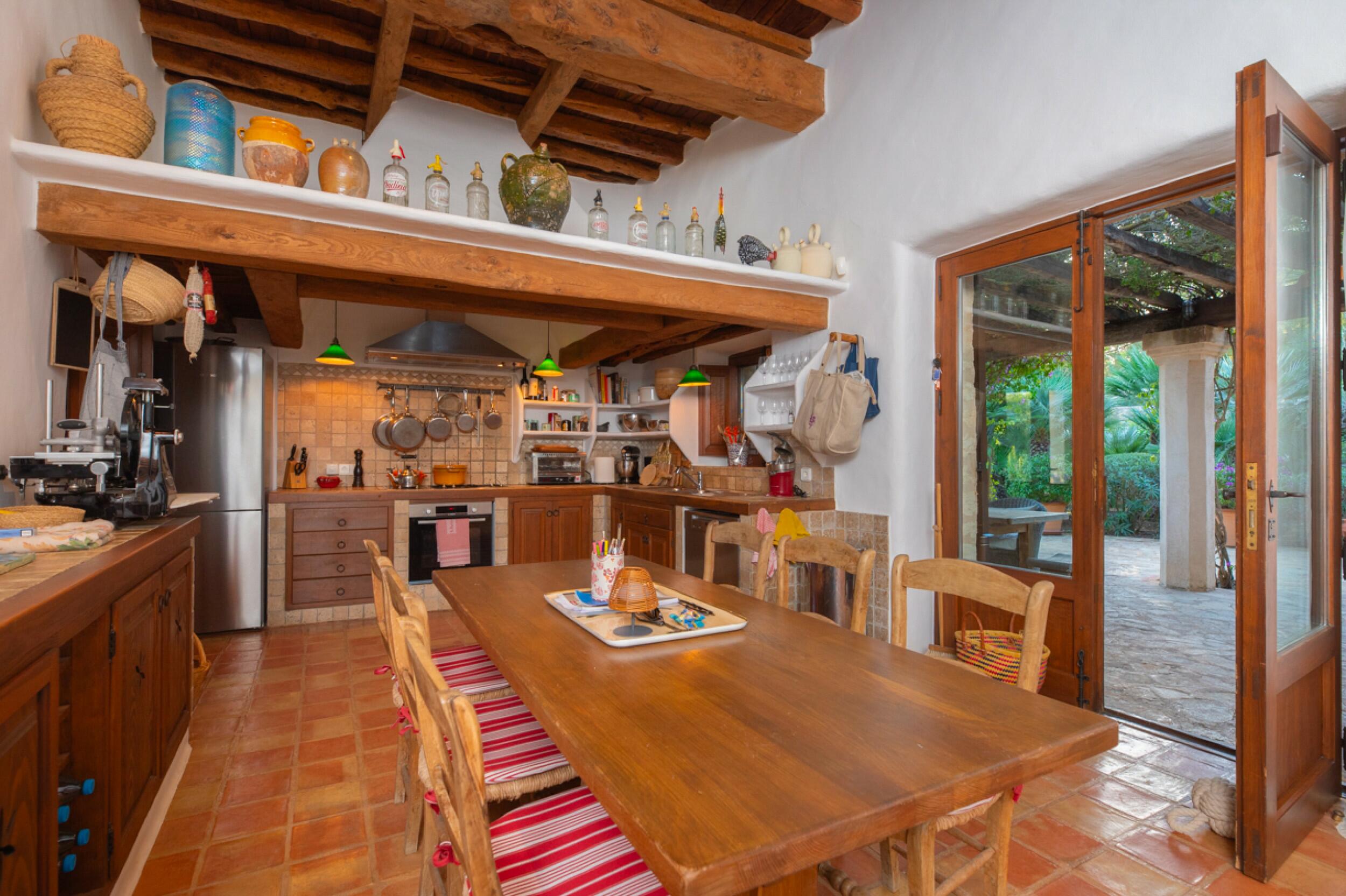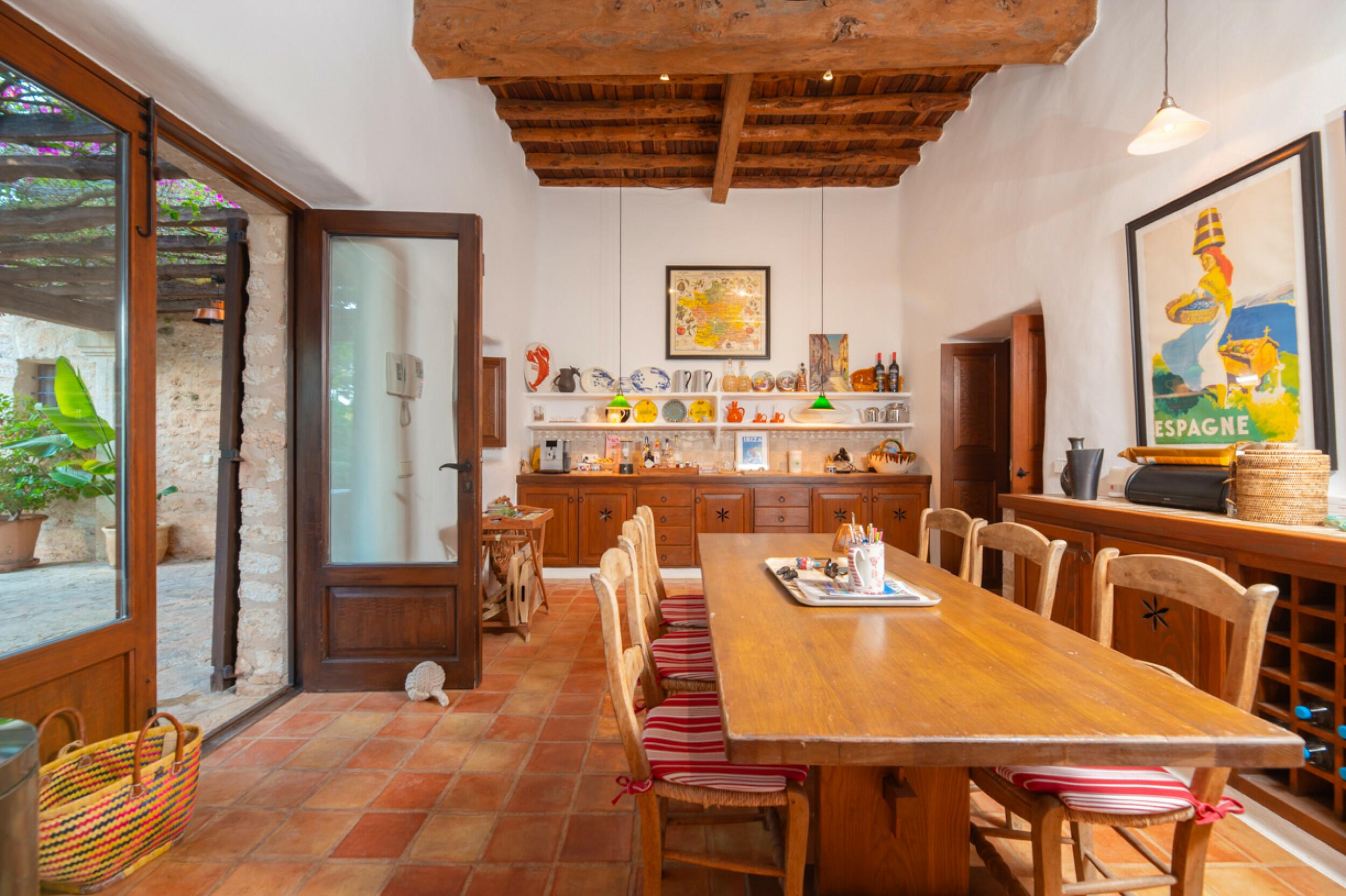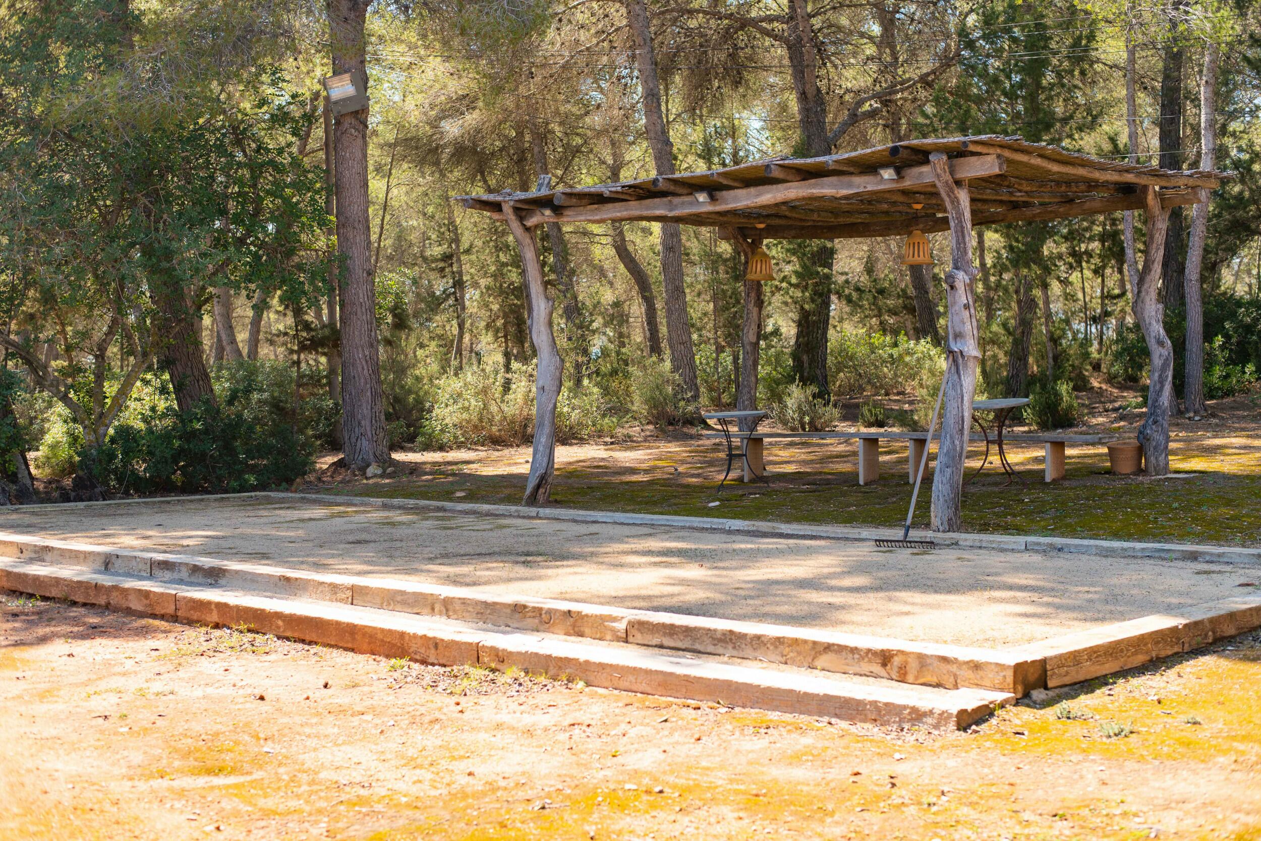 Schöne Villa in der Nähe von Es Cubells, mit Blick auf den Garten und die Landschaft.