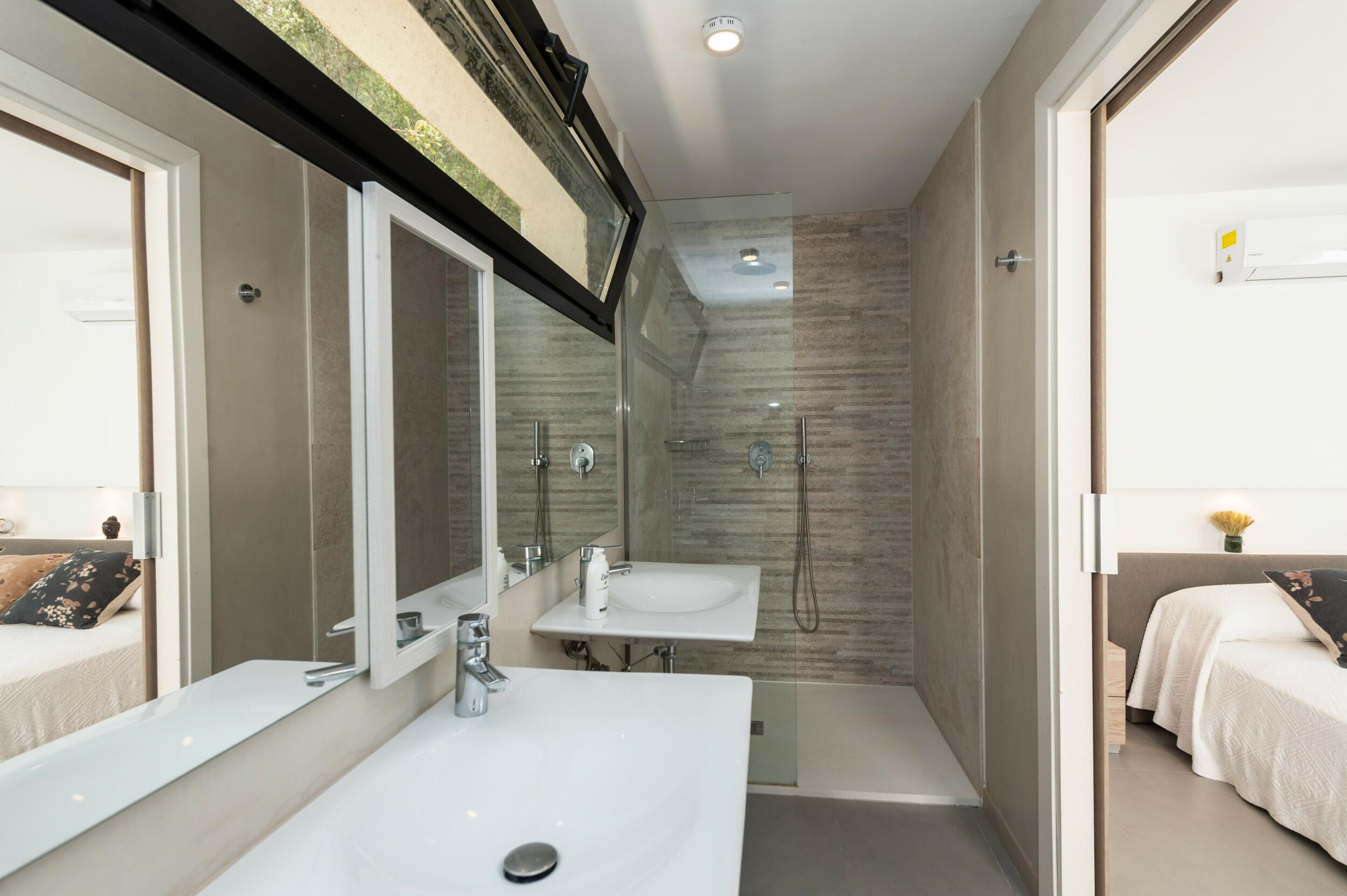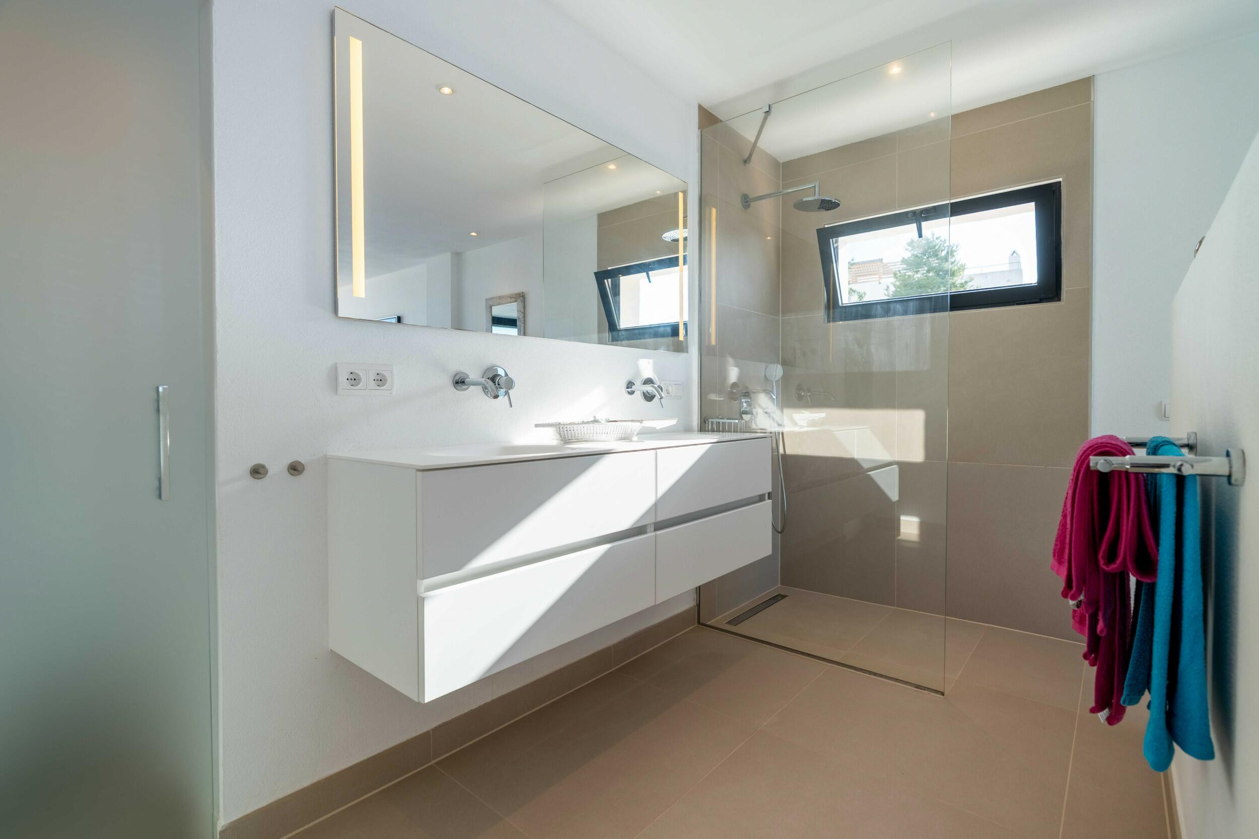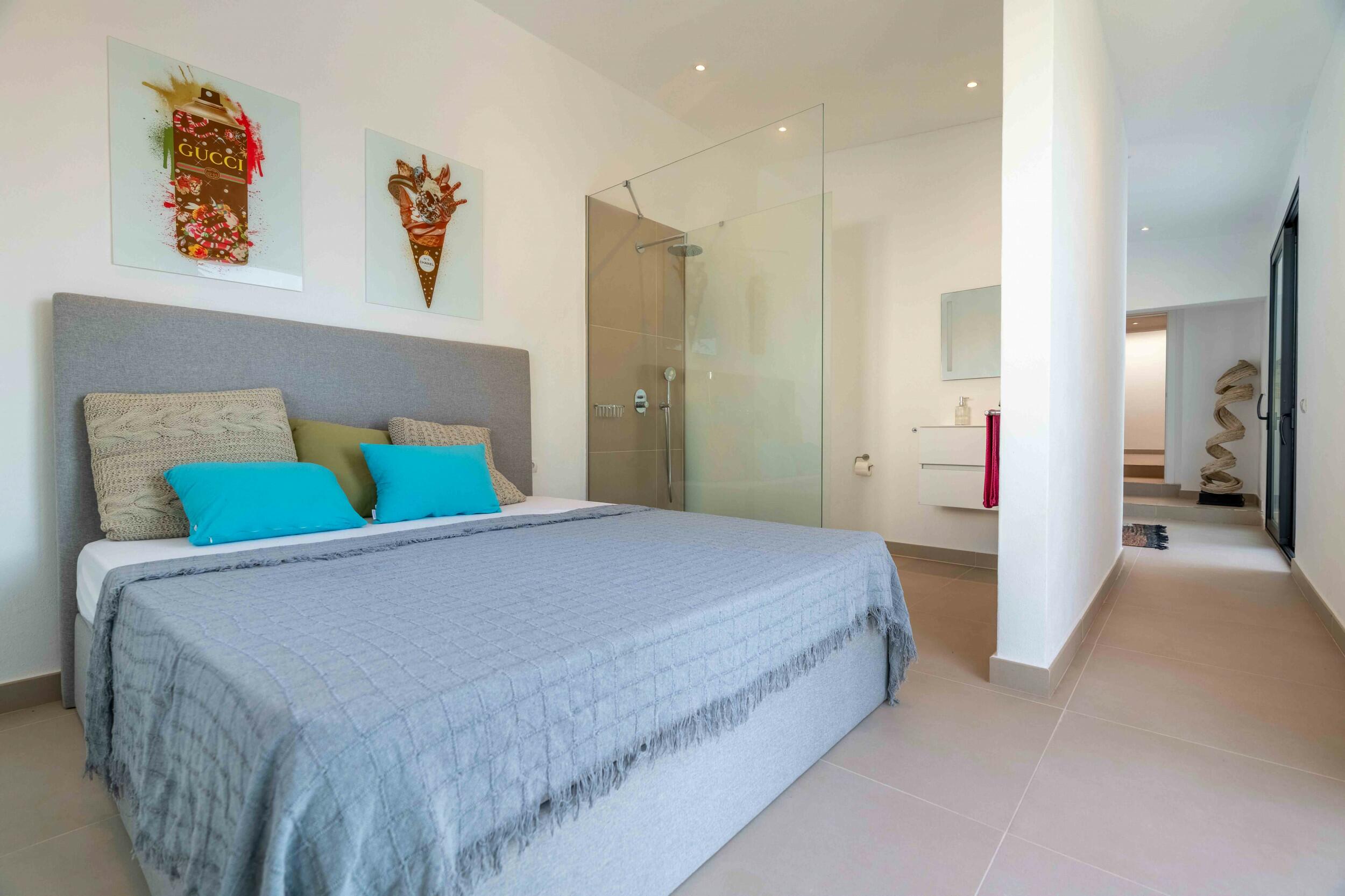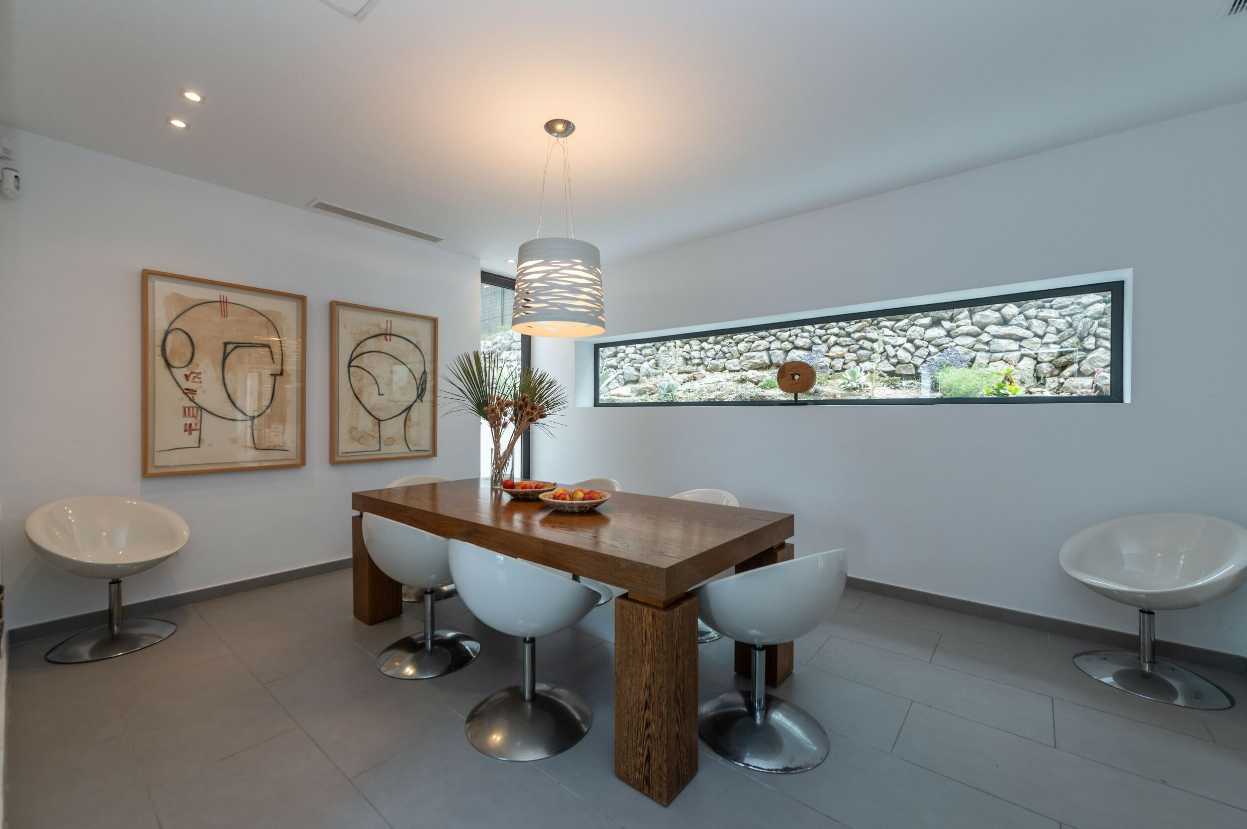 Auf mehreren Ebenen verteilt, bietet diese Villa fünf Schlafzimmer und fünf Badezimmer, die alle mit diskreter Eleganz gestaltet sind und edle Materialien, klare Linien und natürliche Töne betonen. Von der Haupttür gelangt man in das Erdgeschoss, wo ein großes Wohnzimmer und ein separates Esszimmer, beide in reichlich natürlichem Licht gebadet, eine einladende und friedliche Atmosphäre schaffen. Auf einer etwas niedrigeren Ebene befindet sich ein zusätzliches Wohnzimmer und ein Doppelzimmer mit eigenem Bad, ideal für Gäste oder Familienmitglieder, die mehr Privatsphäre suchen.