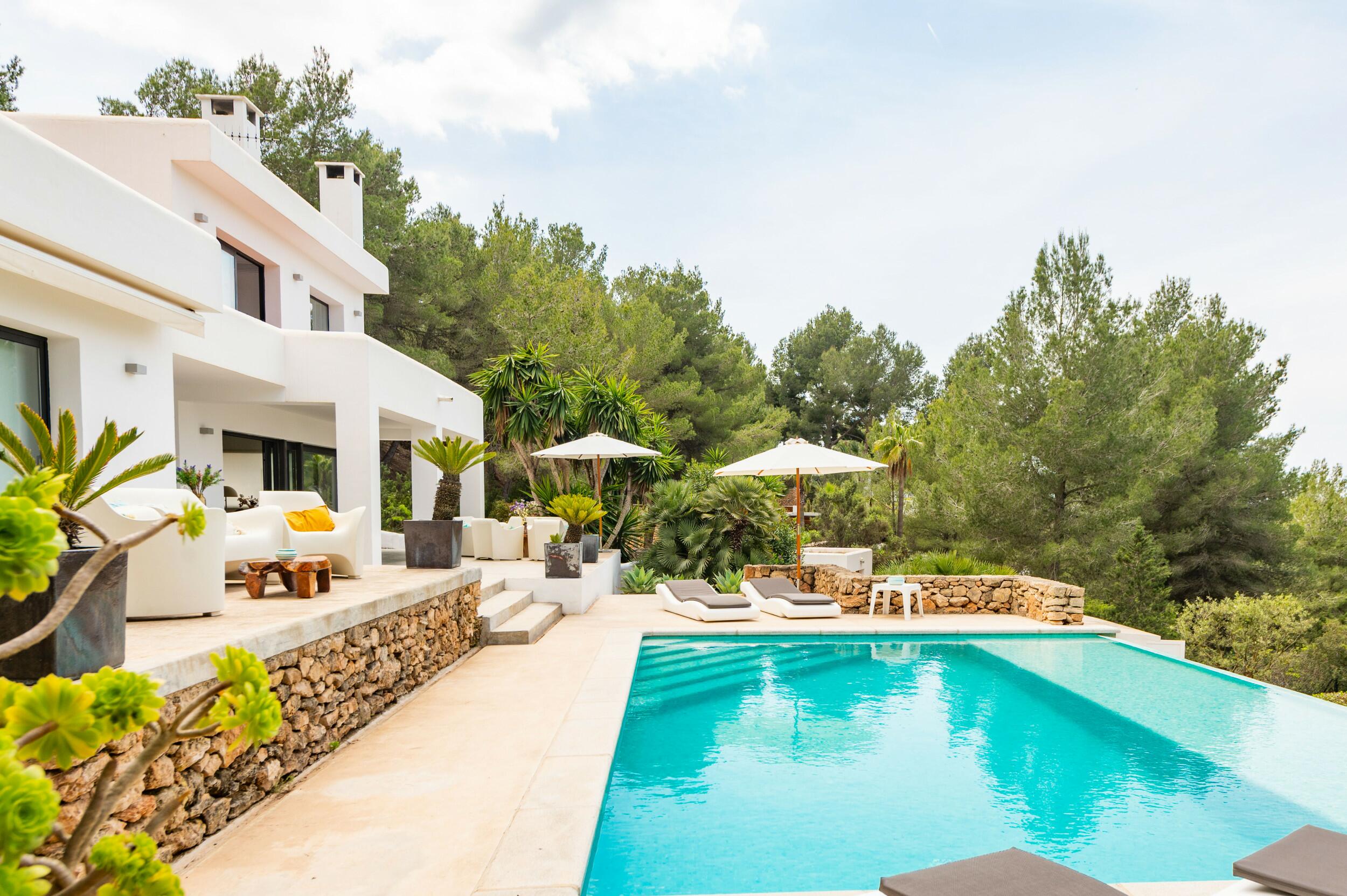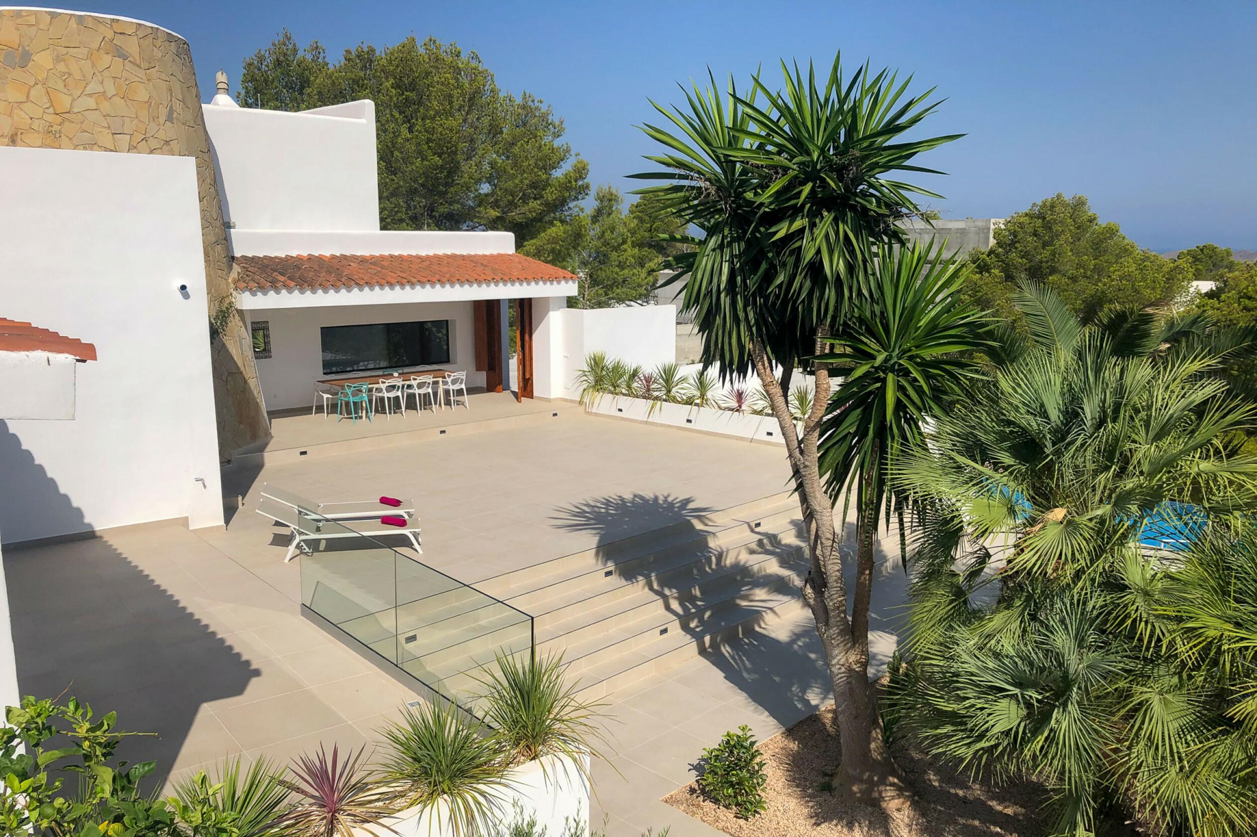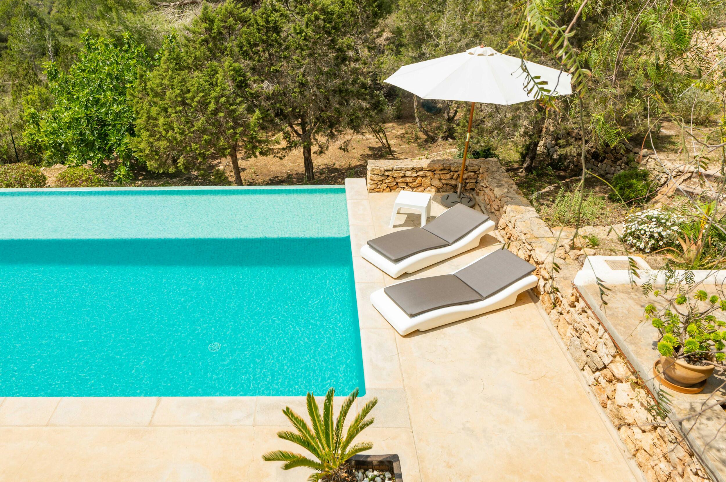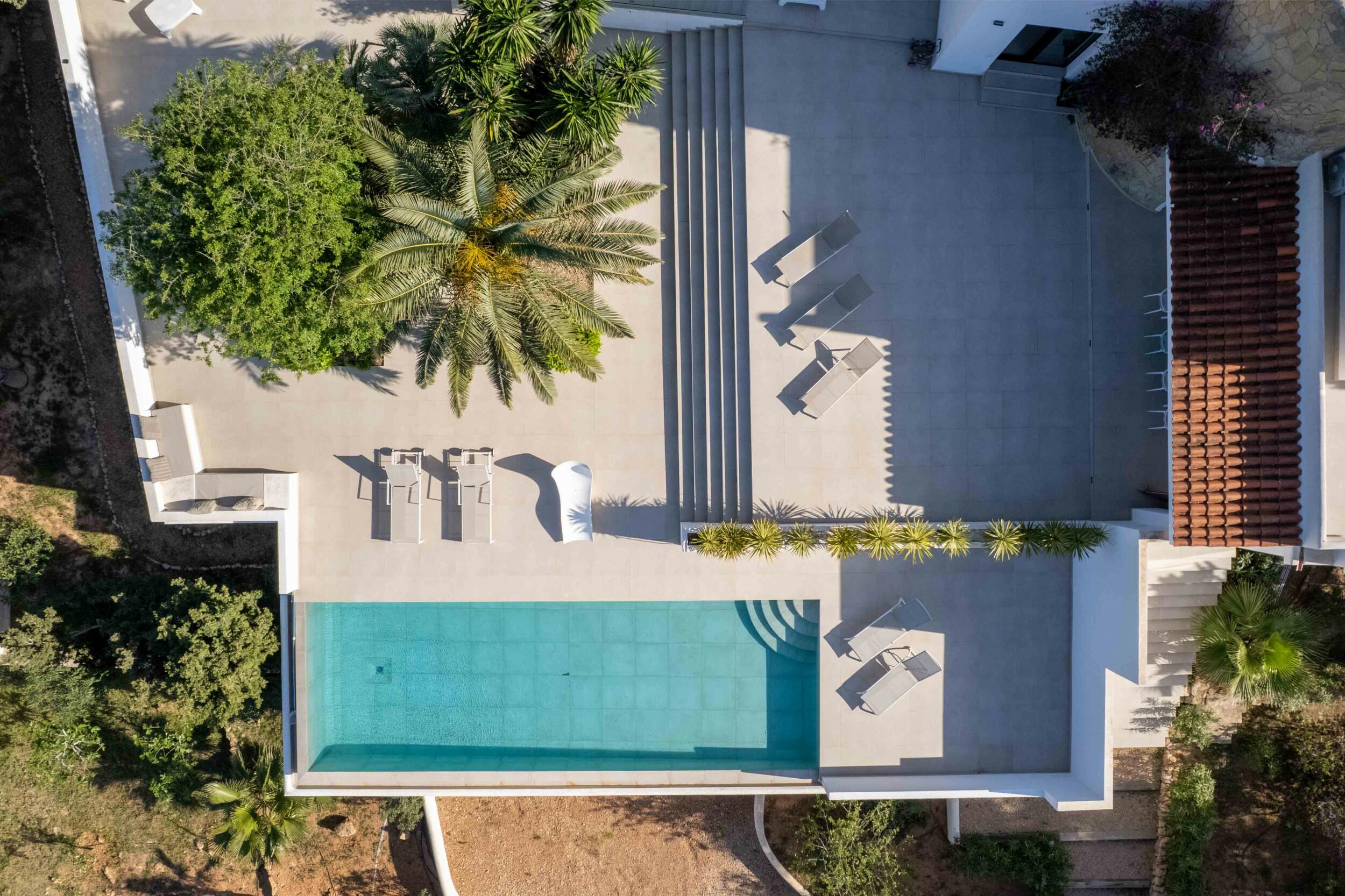 Der sorgfältig mit einheimischen Arten gestaltete Garten fügt sich nahtlos in die umgebende mediterrane Landschaft ein. Der private Pool, umrahmt von Terrassen, die die sommerliche Sonne einfangen, lädt zu absoluter Entspannung und zum Schwimmen unter dem Himmel Ibizas ein. Die subtil in den Außenbereichen verteilten Chill-Out- und Lounge-Zonen schaffen die ideale Atmosphäre, um den ruhigen Rhythmus der Insel und ihre unvergesslichen Sonnenuntergänge zu genießen. Auf dem Dach, dem wahren Markenzeichen der Immobilie, befindet sich eine exklusive, erhöhte Chill-Out-Zone, die zwischen Himmel und Meer schwebt und perfekt ist, um sich vom Ruhigen der Dämmerung oder vom Sternenhimmel in den Sommernächten mitreißen zu lassen.