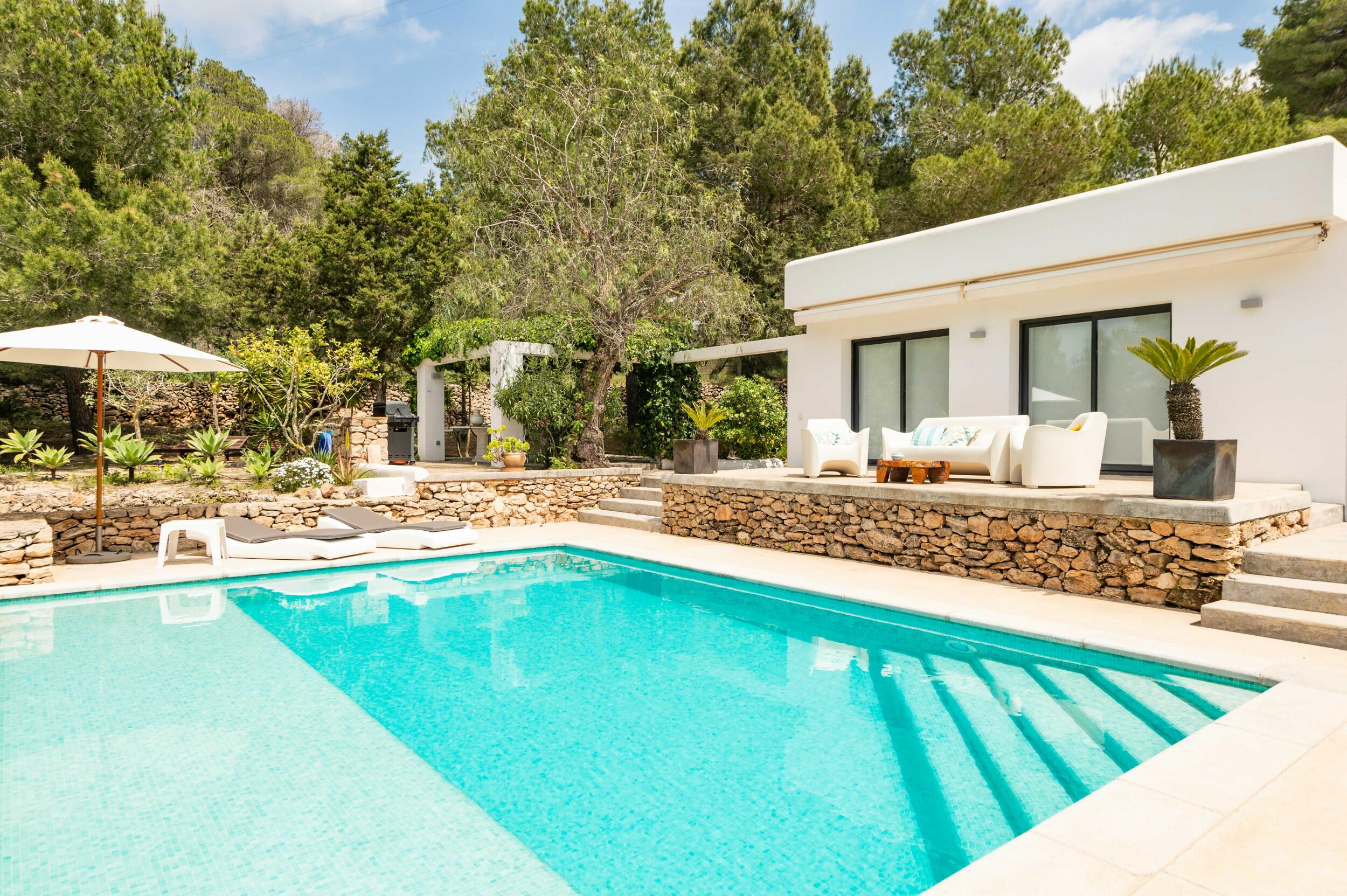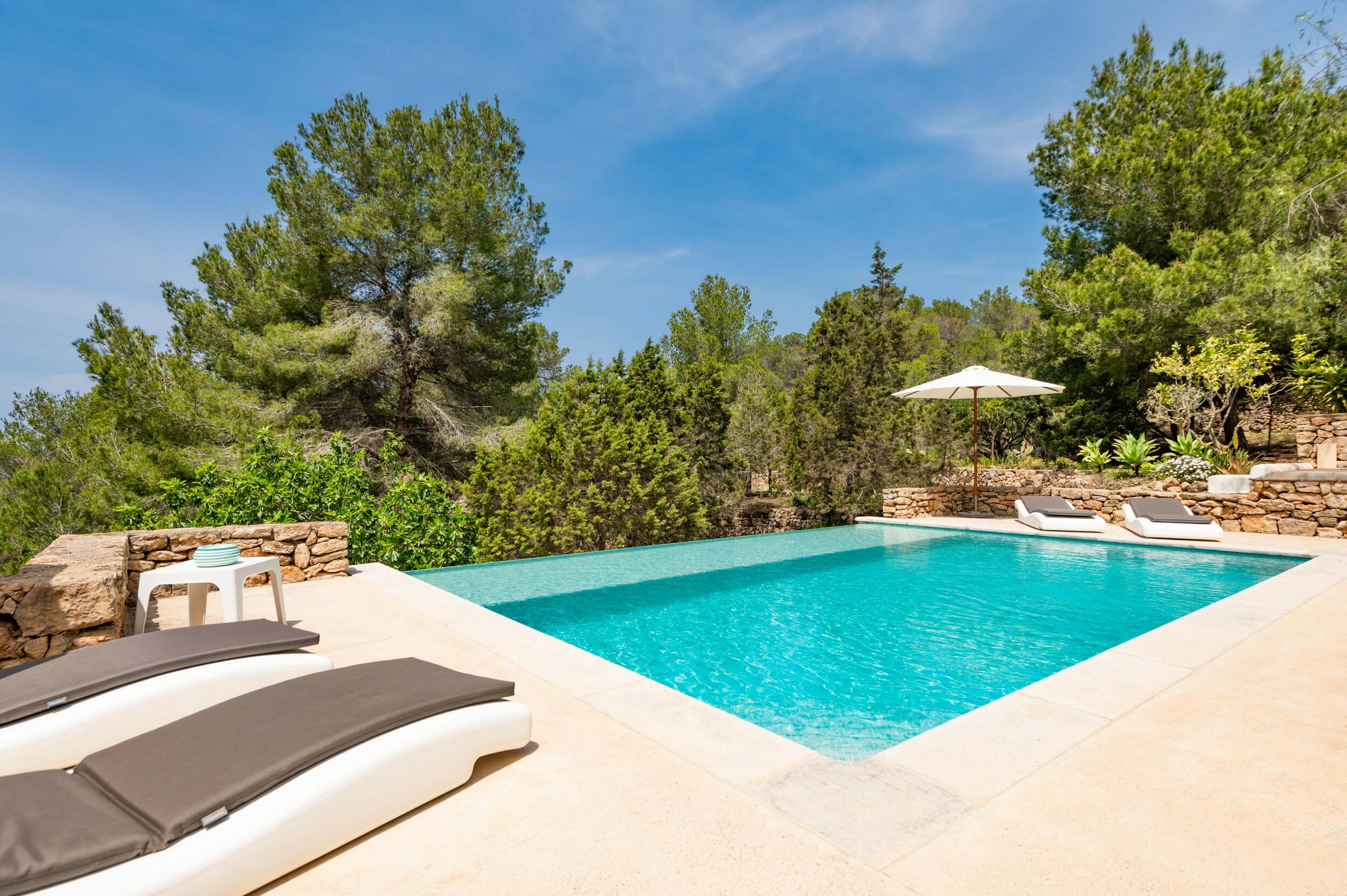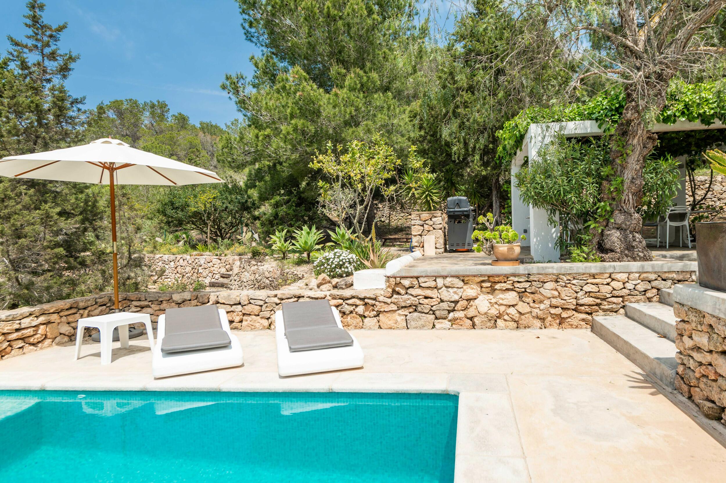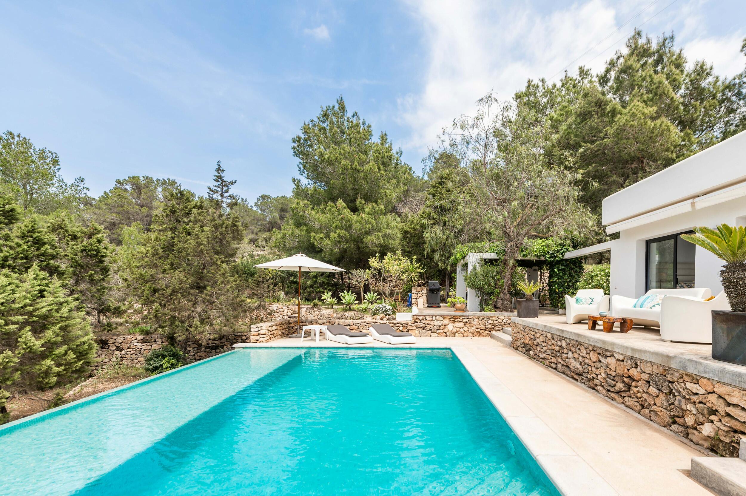 Der sorgfältig mit einheimischen Arten gestaltete Garten fügt sich nahtlos in die umgebende mediterrane Landschaft ein. Der private Pool, umrahmt von Terrassen, die die sommerliche Sonne einfangen, lädt zu absoluter Entspannung und zum Schwimmen unter dem Himmel Ibizas ein. Die subtil in den Außenbereichen verteilten Chill-Out- und Lounge-Zonen schaffen die ideale Atmosphäre, um den ruhigen Rhythmus der Insel und ihre unvergesslichen Sonnenuntergänge zu genießen. Auf dem Dach, dem wahren Markenzeichen der Immobilie, befindet sich eine exklusive, erhöhte Chill-Out-Zone, die zwischen Himmel und Meer schwebt und perfekt ist, um sich vom Ruhigen der Dämmerung oder vom Sternenhimmel in den Sommernächten mitreißen zu lassen.