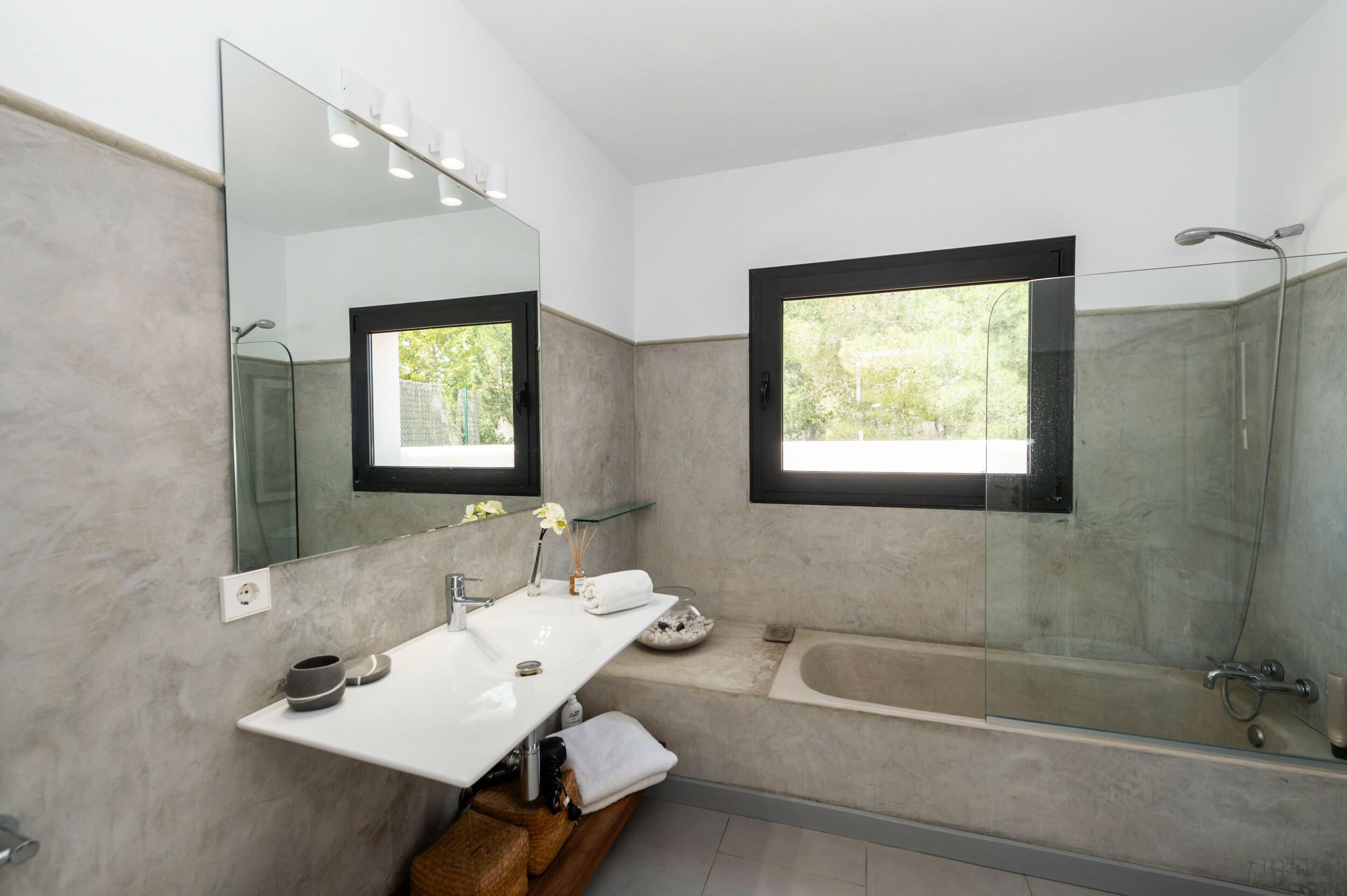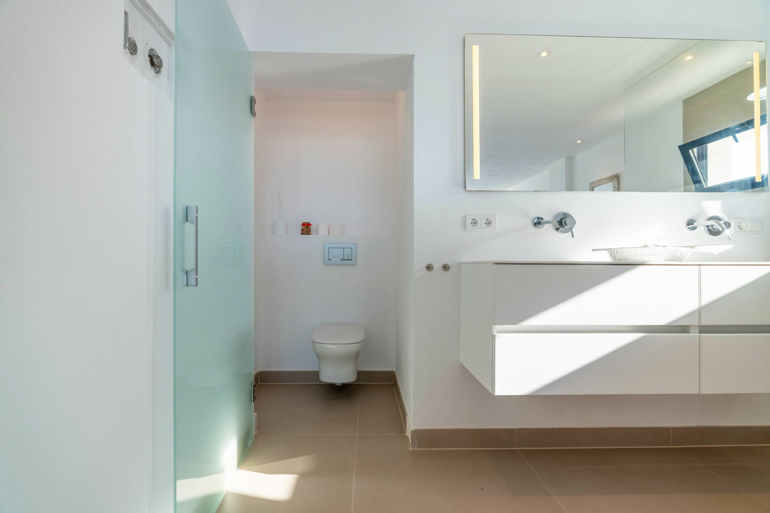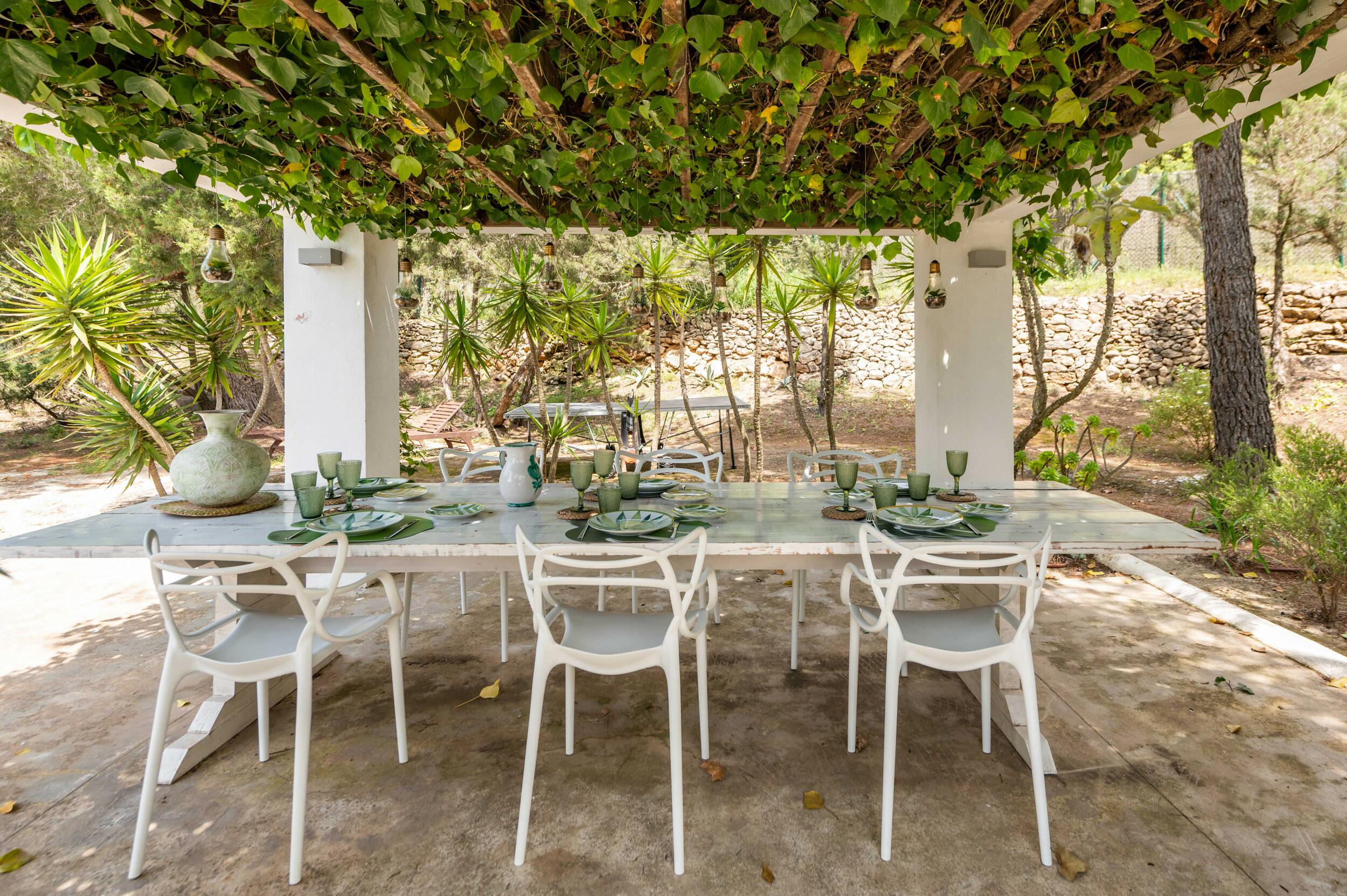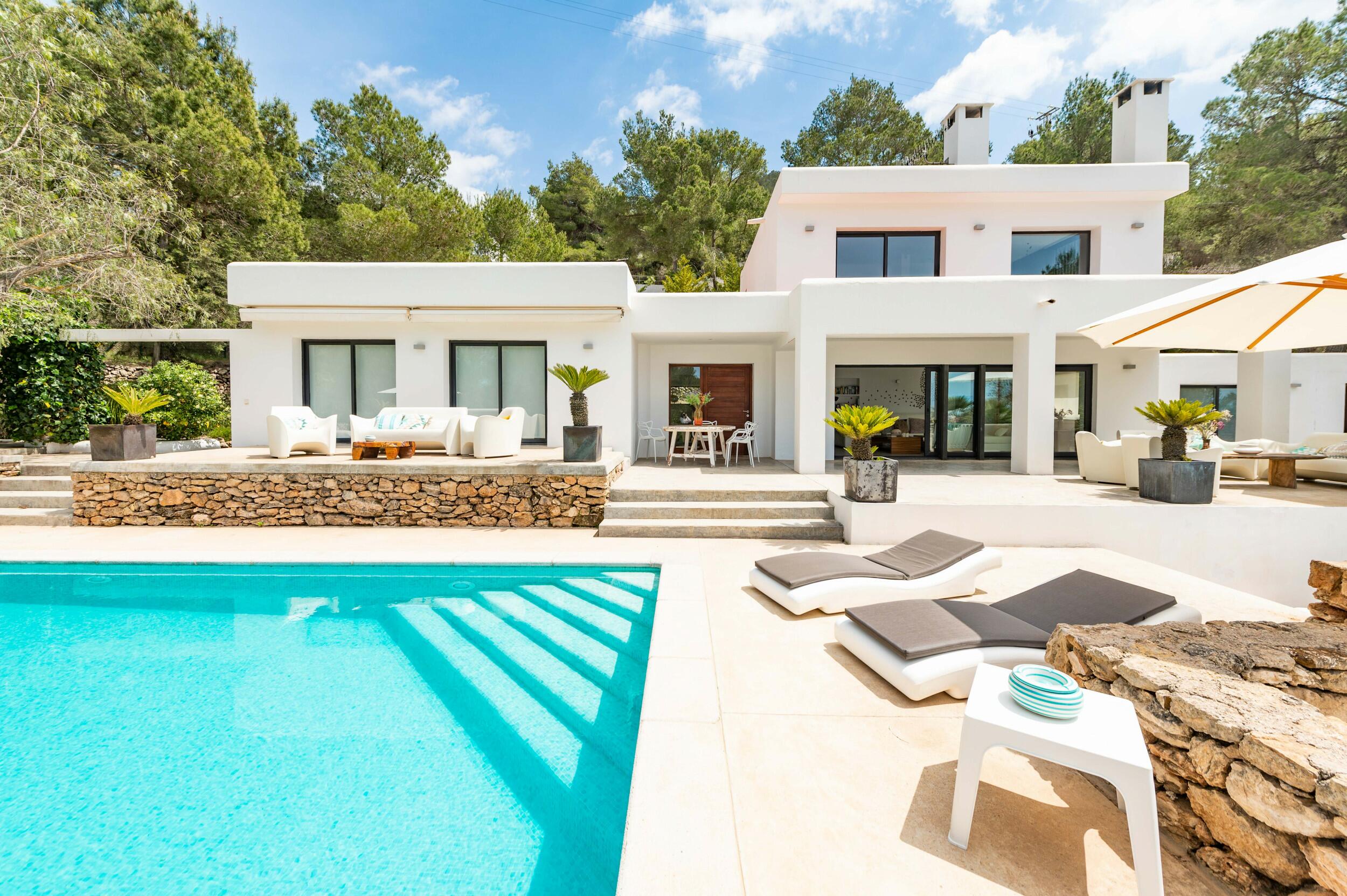 Der sorgfältig mit einheimischen Arten gestaltete Garten fügt sich nahtlos in die umgebende mediterrane Landschaft ein. Der private Pool, umrahmt von Terrassen, die die sommerliche Sonne einfangen, lädt zu absoluter Entspannung und zum Schwimmen unter dem Himmel Ibizas ein. Die subtil in den Außenbereichen verteilten Chill-Out- und Lounge-Zonen schaffen die ideale Atmosphäre, um den ruhigen Rhythmus der Insel und ihre unvergesslichen Sonnenuntergänge zu genießen. Auf dem Dach, dem wahren Markenzeichen der Immobilie, befindet sich eine exklusive, erhöhte Chill-Out-Zone, die zwischen Himmel und Meer schwebt und perfekt ist, um sich vom Ruhigen der Dämmerung oder vom Sternenhimmel in den Sommernächten mitreißen zu lassen.