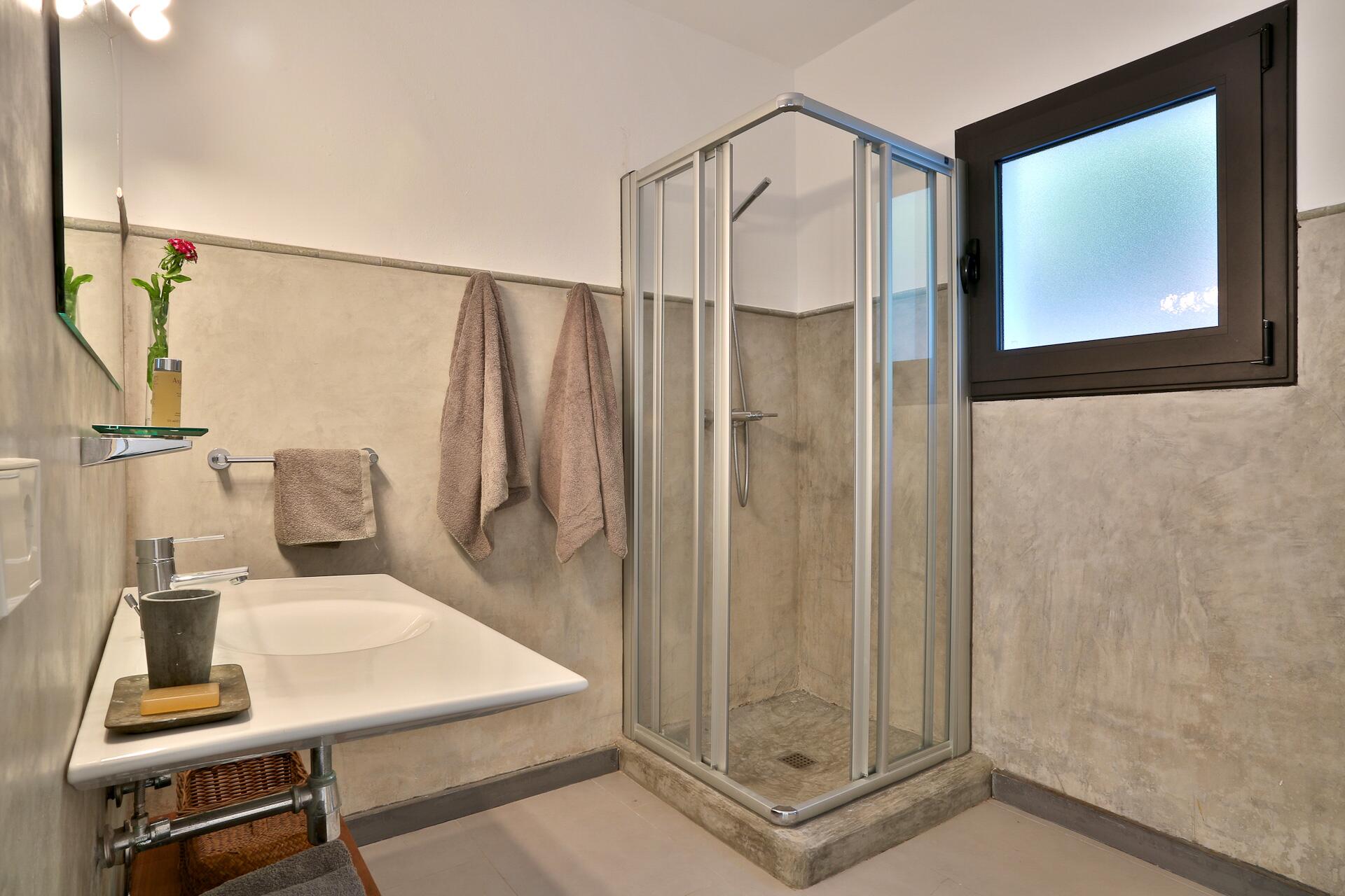 Im ersten Stock befindet sich eine voll ausgestattete Küche mit atemberaubendem Meerblick und direktem Zugang zu einer überdachten Terrasse mit einem Essbereich im Freien, perfekt für lange Mahlzeiten unter freiem Himmel. Auf derselben Ebene befinden sich auch ein Badezimmer mit Dusche, ein zweites Doppelzimmer und ein hinterer Ausgang, der direkt zum Poolbereich führt.