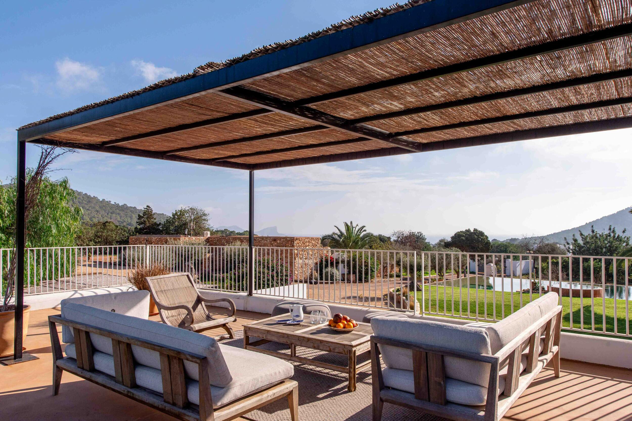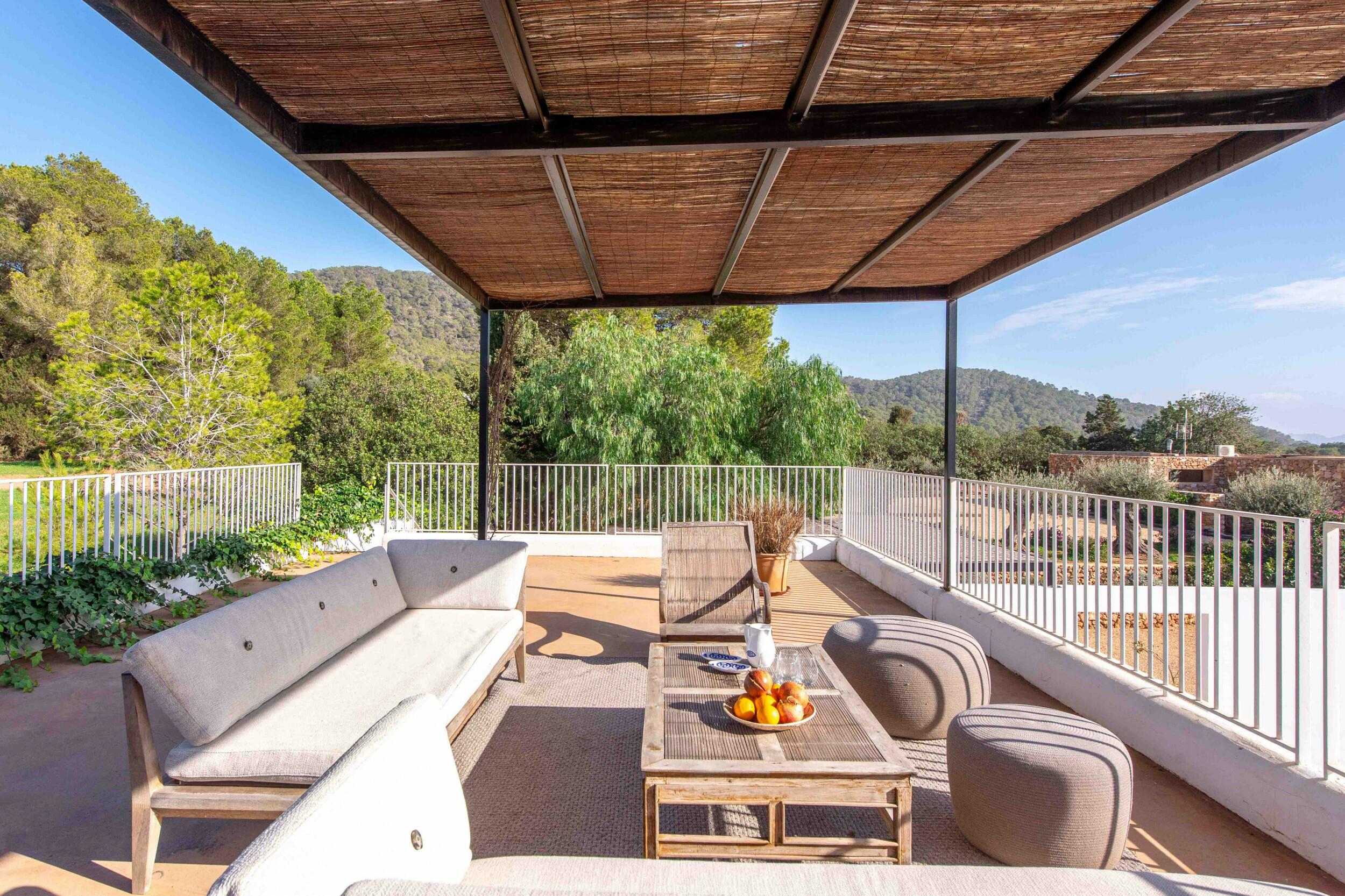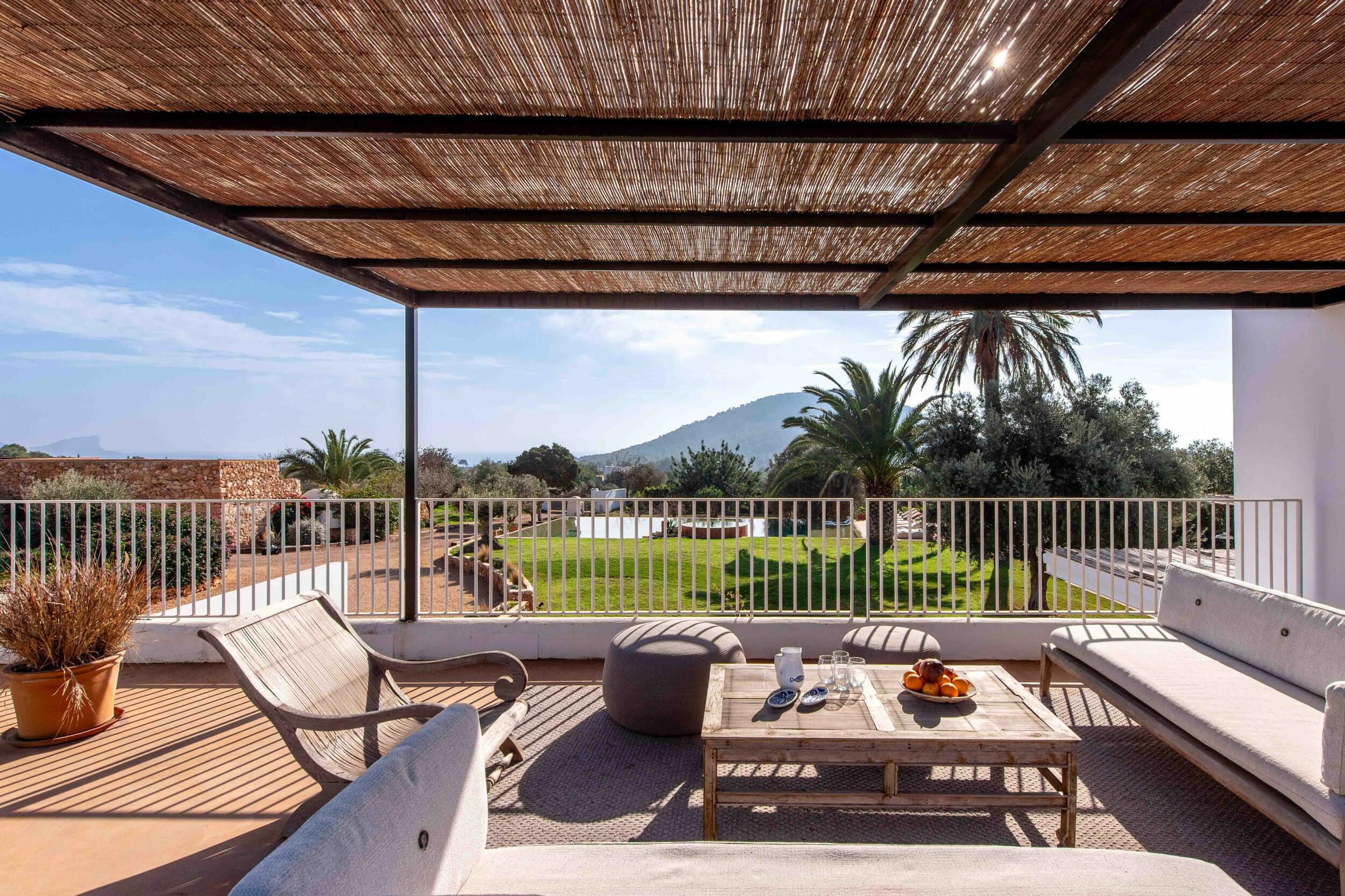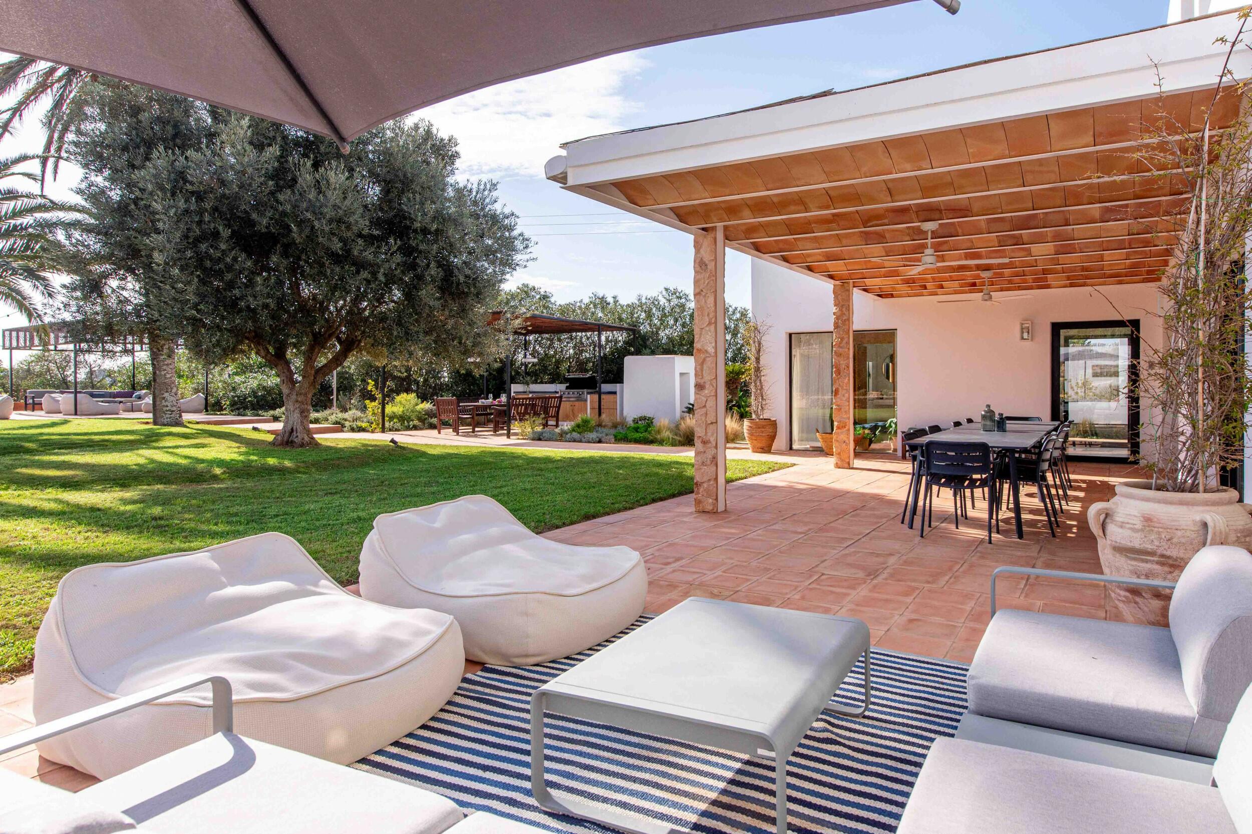 Mehrere Terrassen bieten schattige Lounge-Bereiche und einen Außen-Essbereich, ideal für gemütliche Frühstücke, entspannte Mittagessen oder Abendessen bei Kerzenlicht unter dem ibizenkischen Himmel.