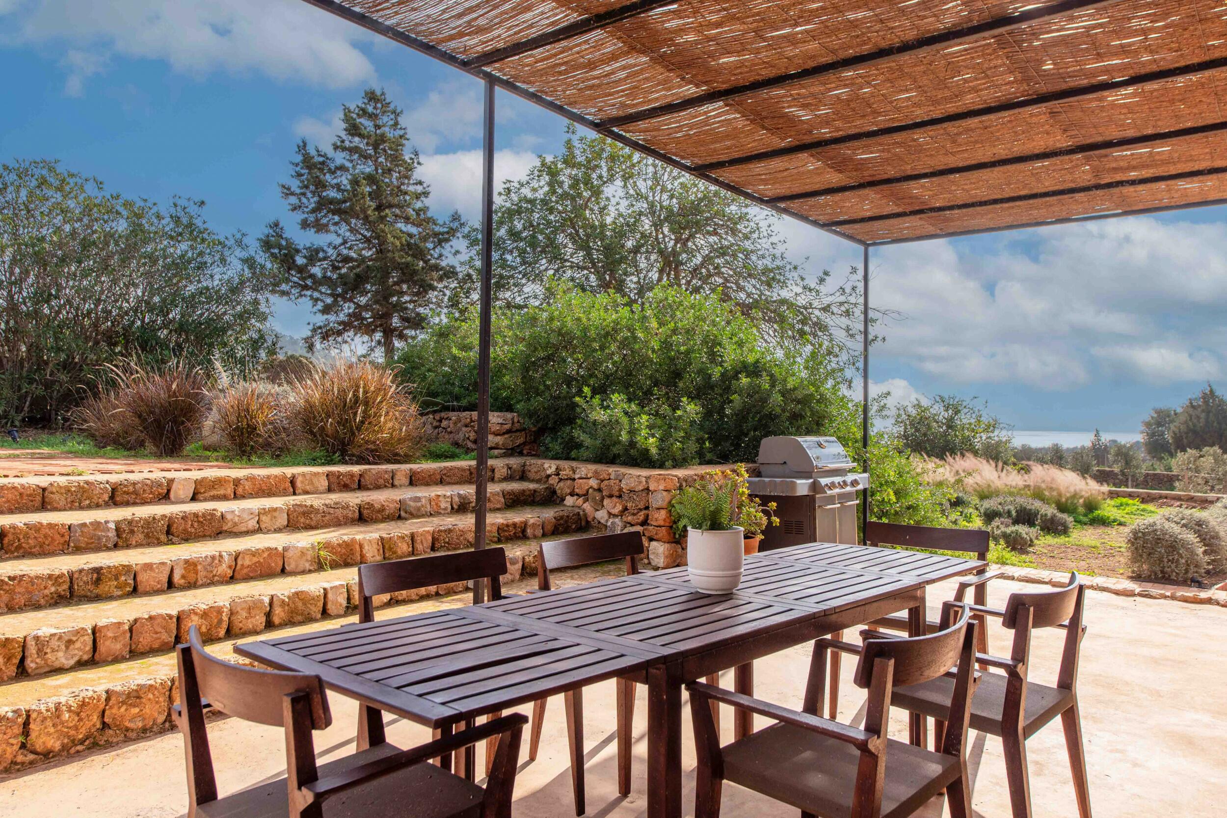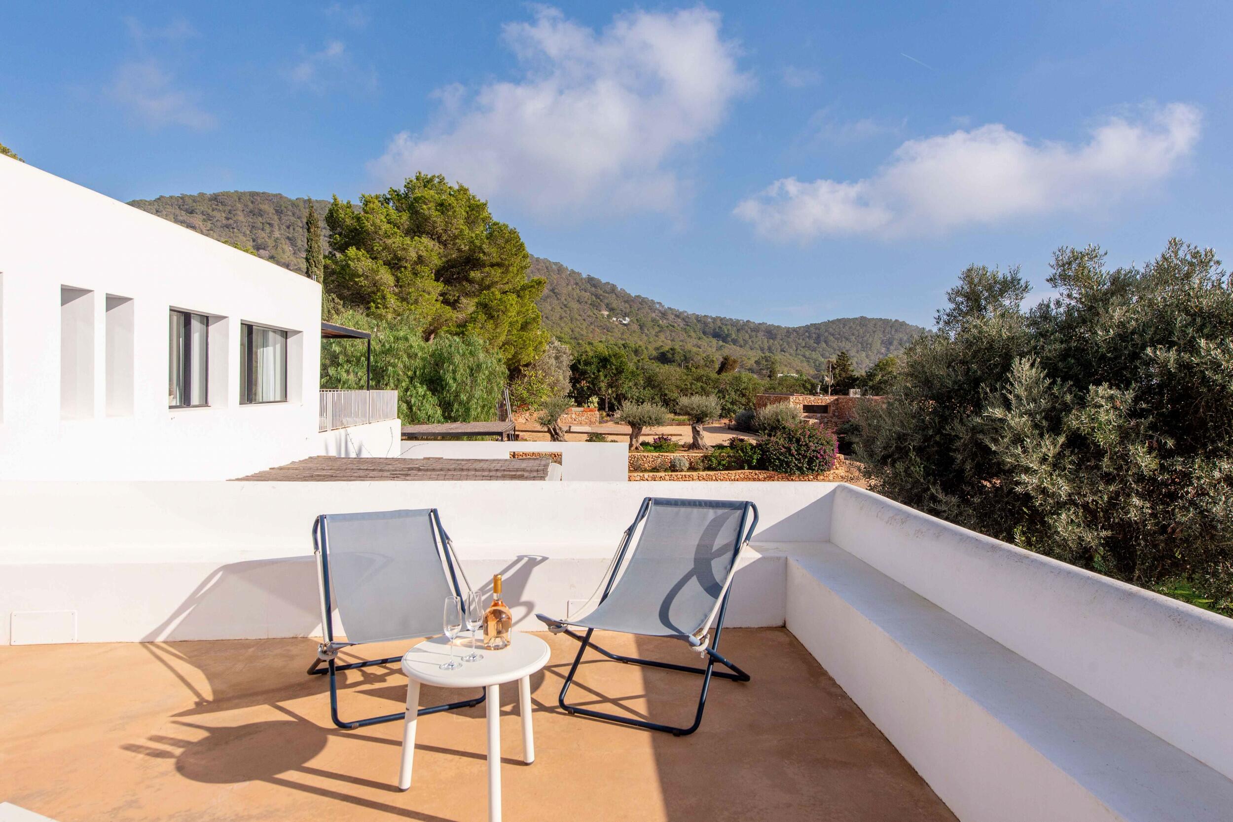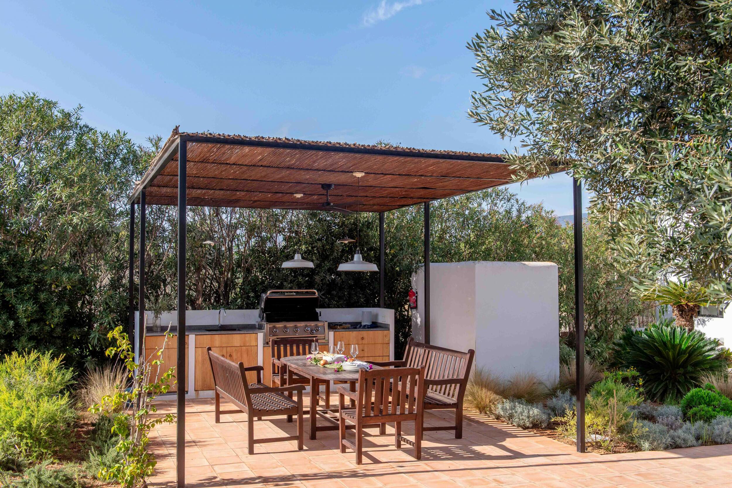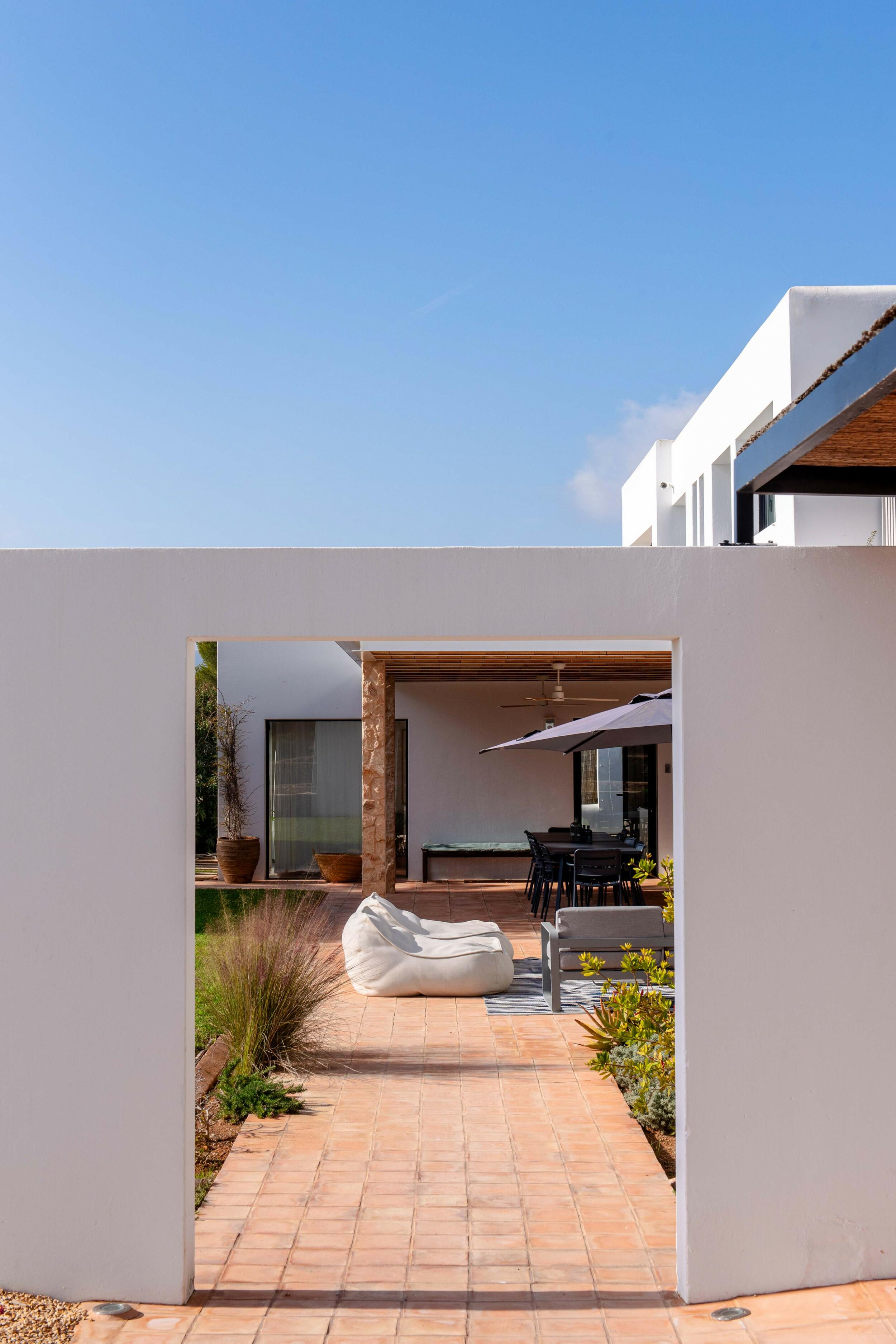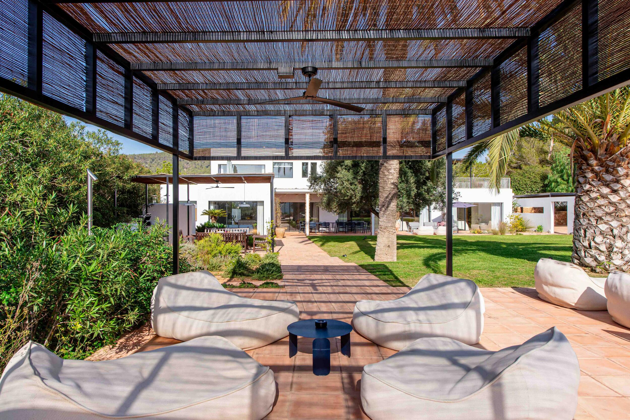Mehrere Terrassen bieten schattige Lounge-Bereiche und einen Außen-Essbereich, ideal für gemütliche Frühstücke, entspannte Mittagessen oder Abendessen bei Kerzenlicht unter dem ibizenkischen Himmel.