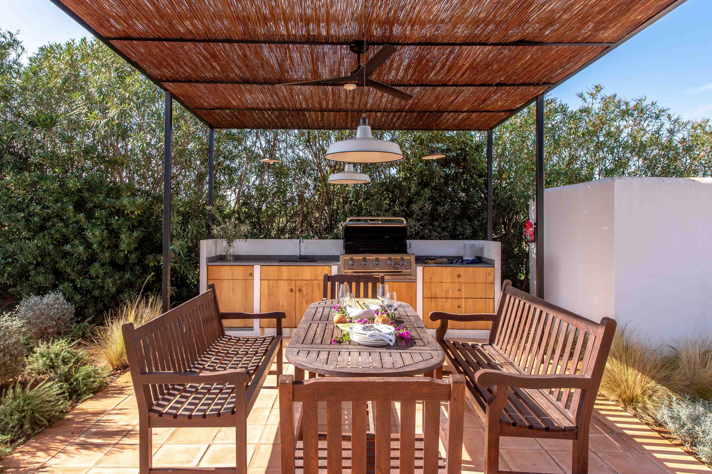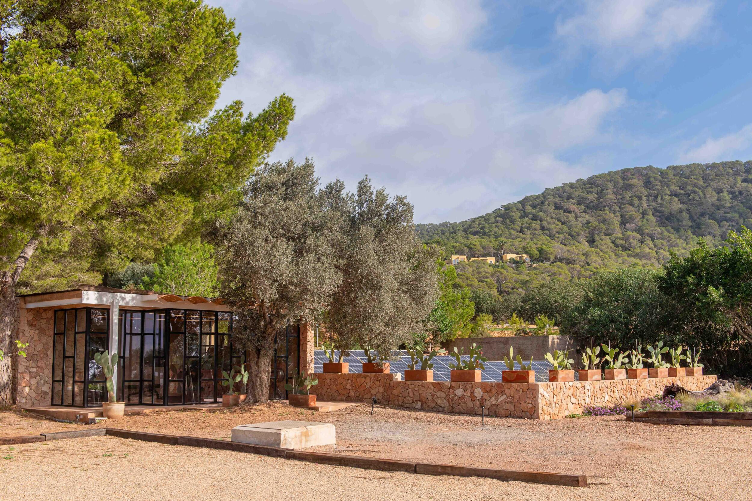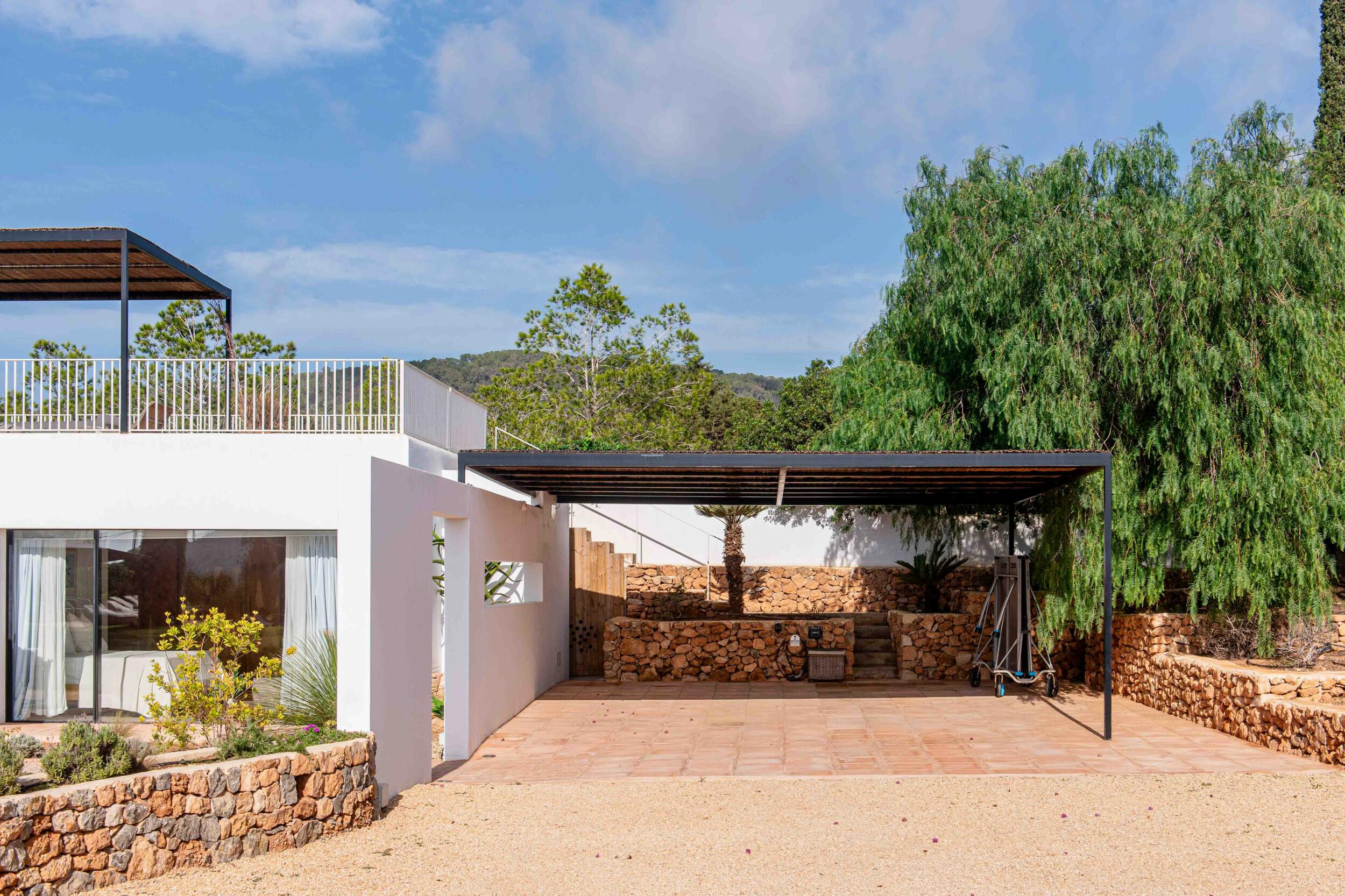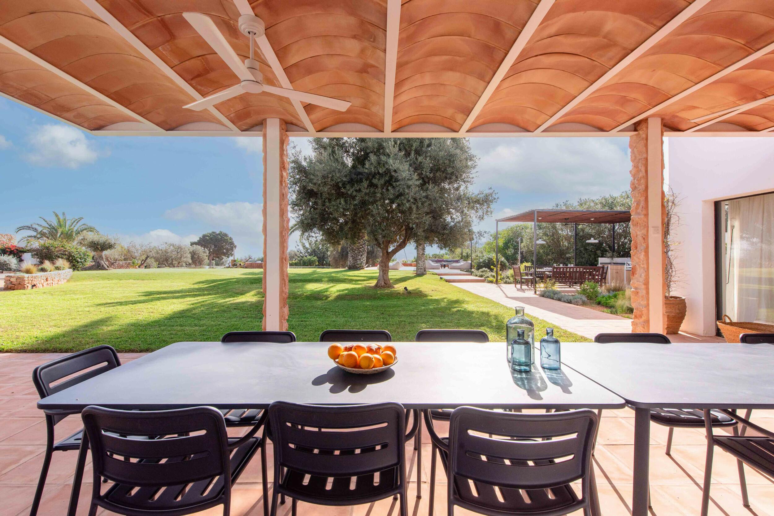 Mehrere Terrassen bieten schattige Lounge-Bereiche und einen Außen-Essbereich, ideal für gemütliche Frühstücke, entspannte Mittagessen oder Abendessen bei Kerzenlicht unter dem ibizenkischen Himmel.