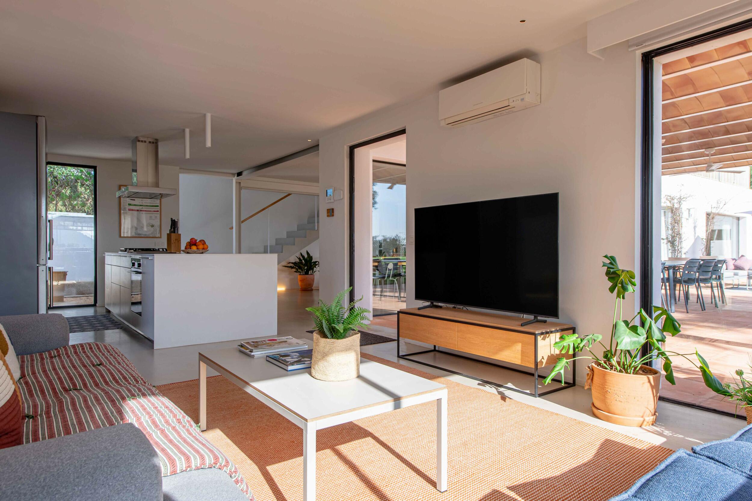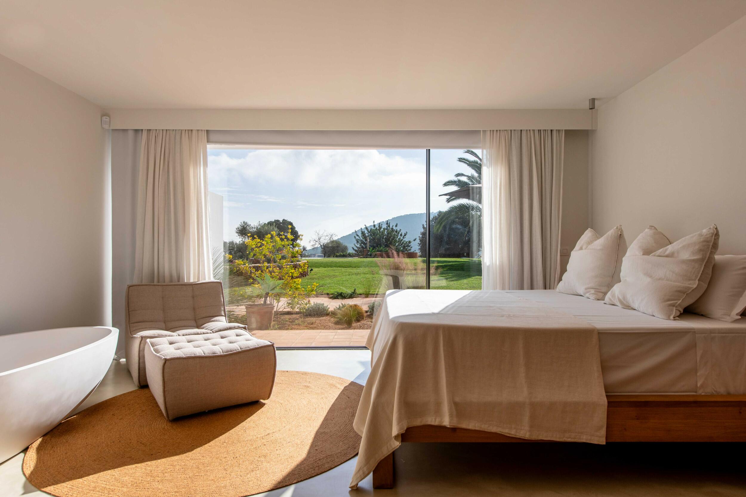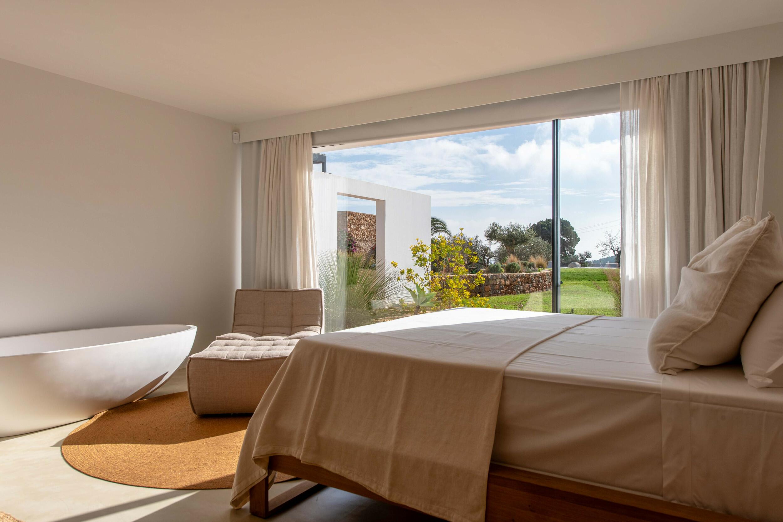 Natürliches Licht strömt durch breite Schiebetüren, die den Blick auf die Gärten und das entfernte Meer einrahmen, während Fußbodenheizung und Klimaanlage in den Schlafzimmern ganzjährigen Komfort bieten.