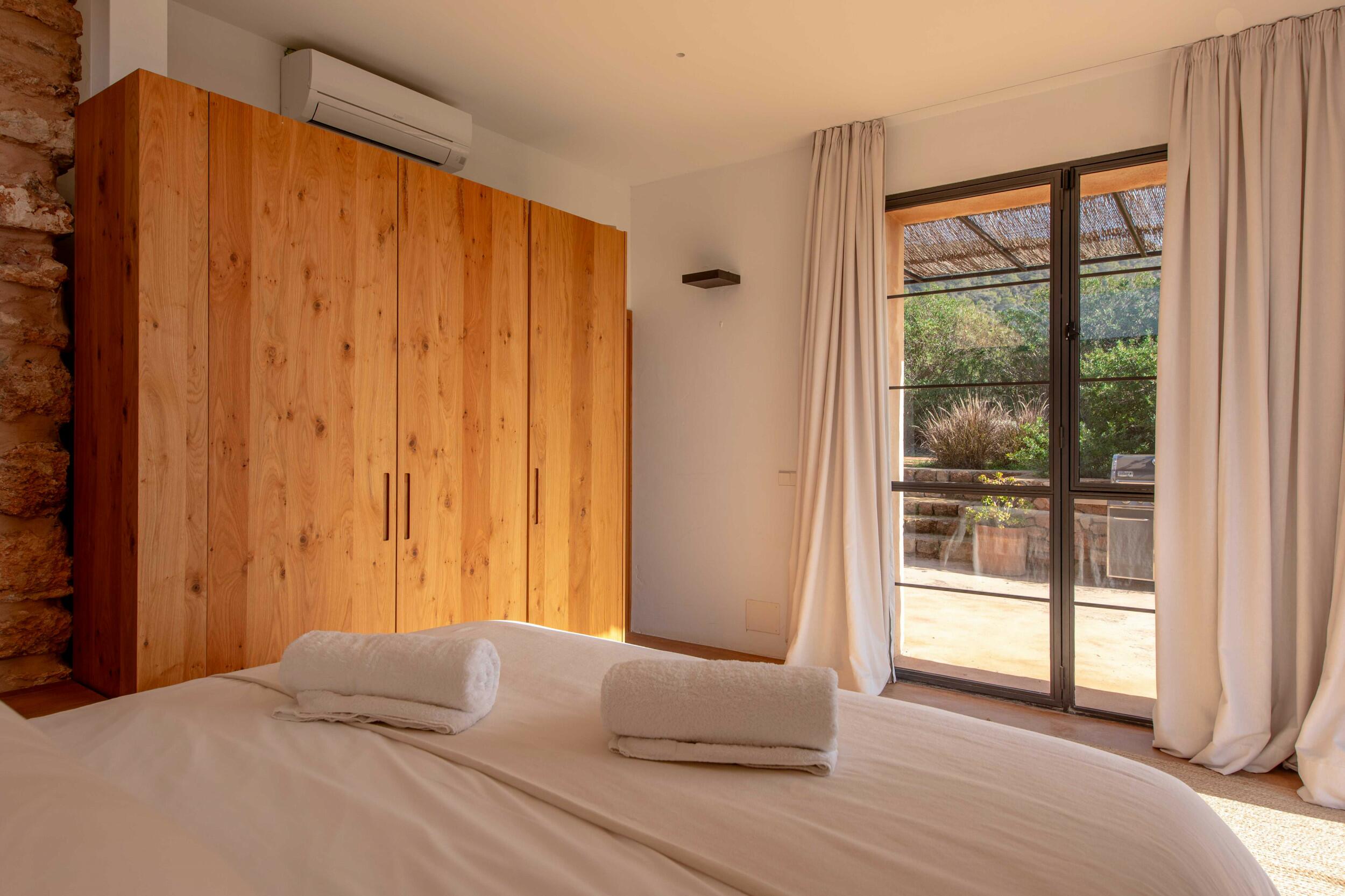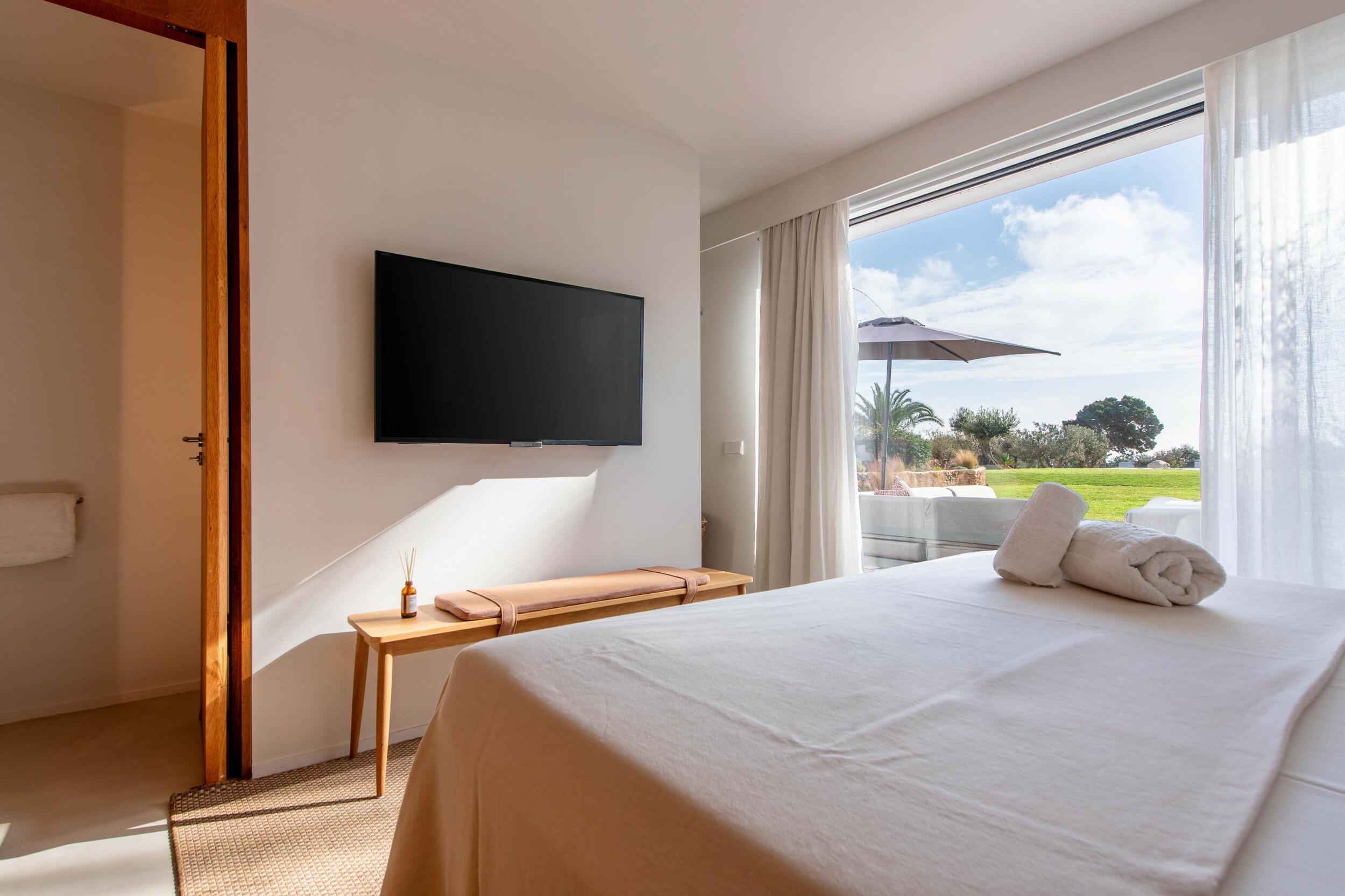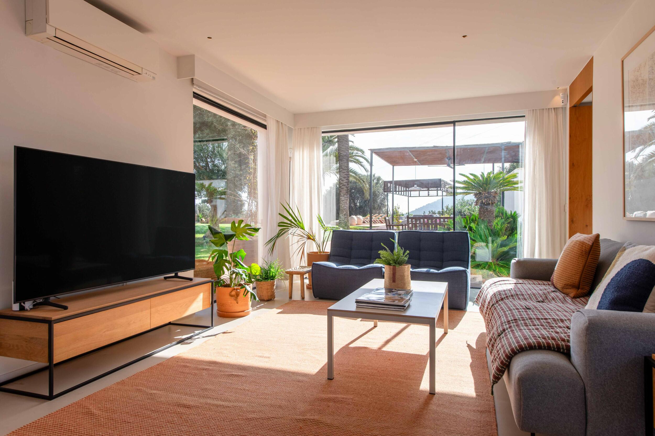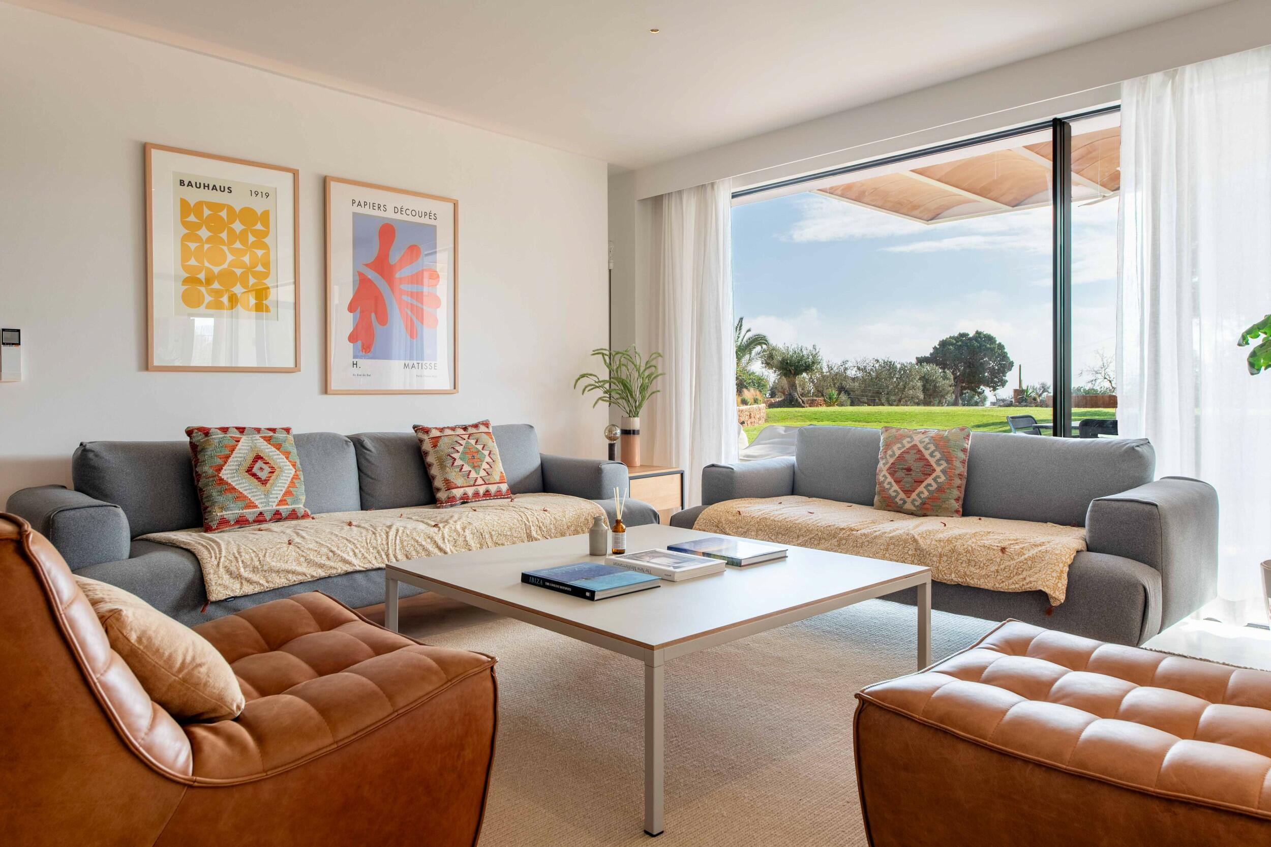 Natürliches Licht strömt durch breite Schiebetüren, die den Blick auf die Gärten und das entfernte Meer einrahmen, während Fußbodenheizung und Klimaanlage in den Schlafzimmern ganzjährigen Komfort bieten.